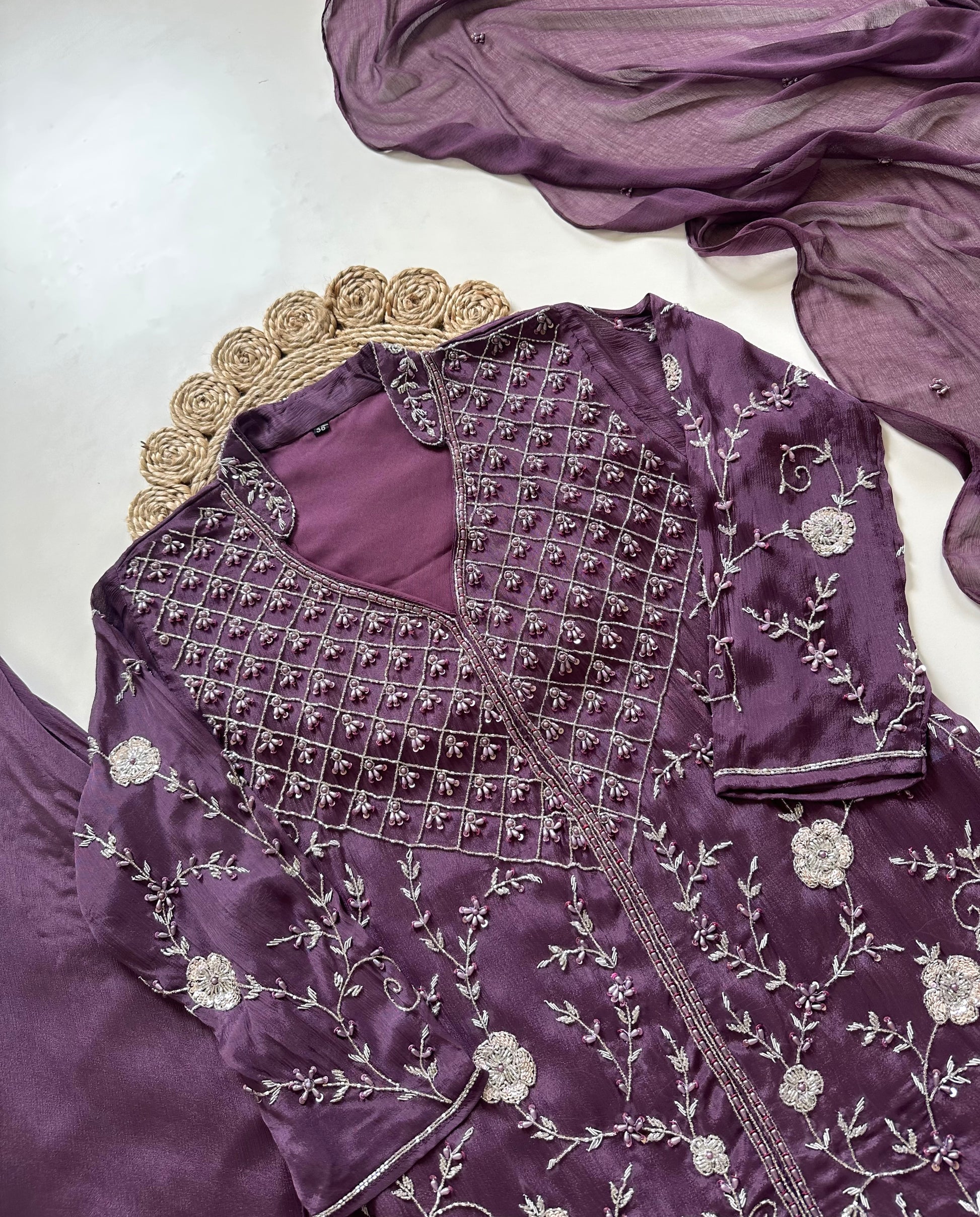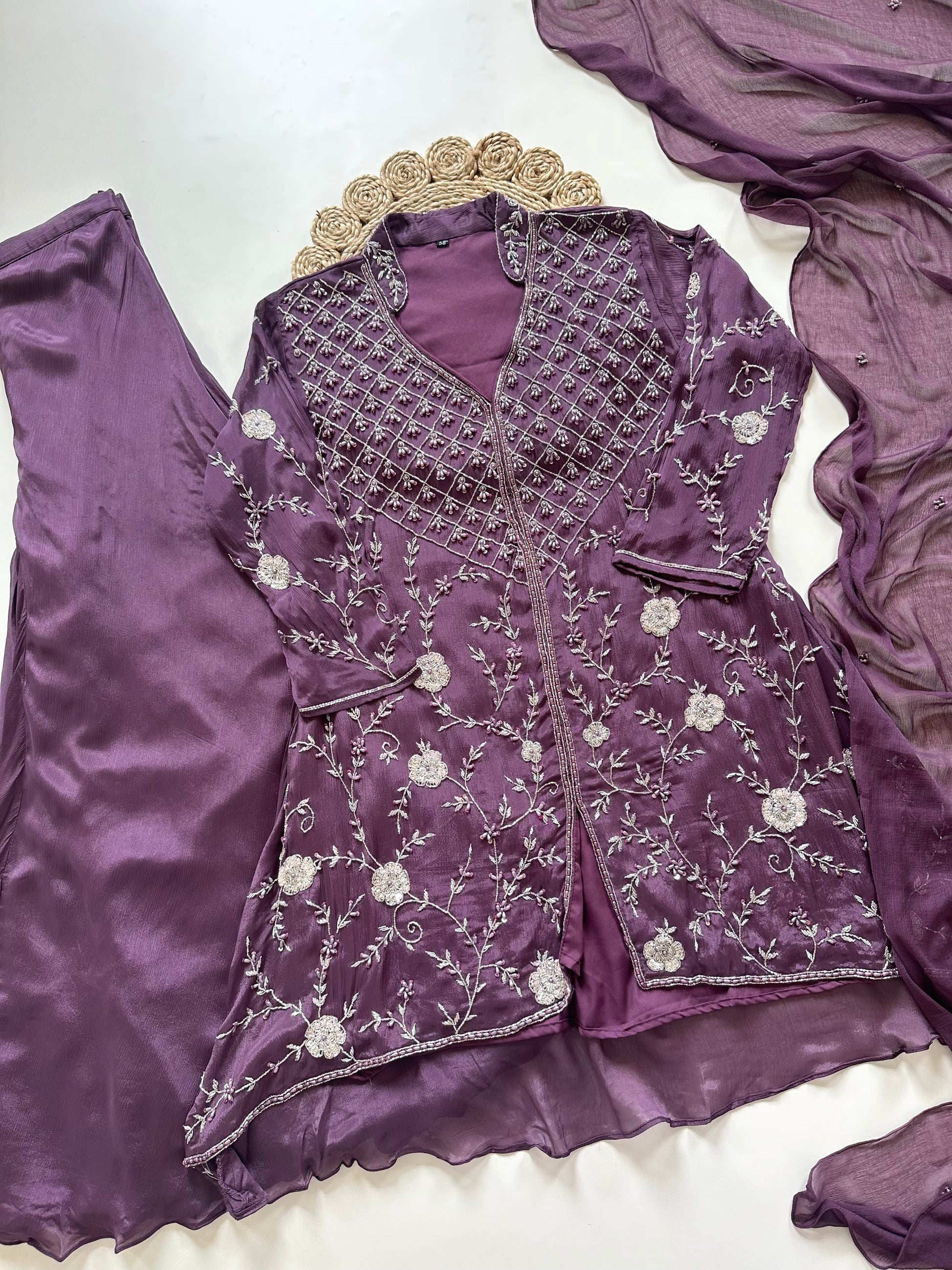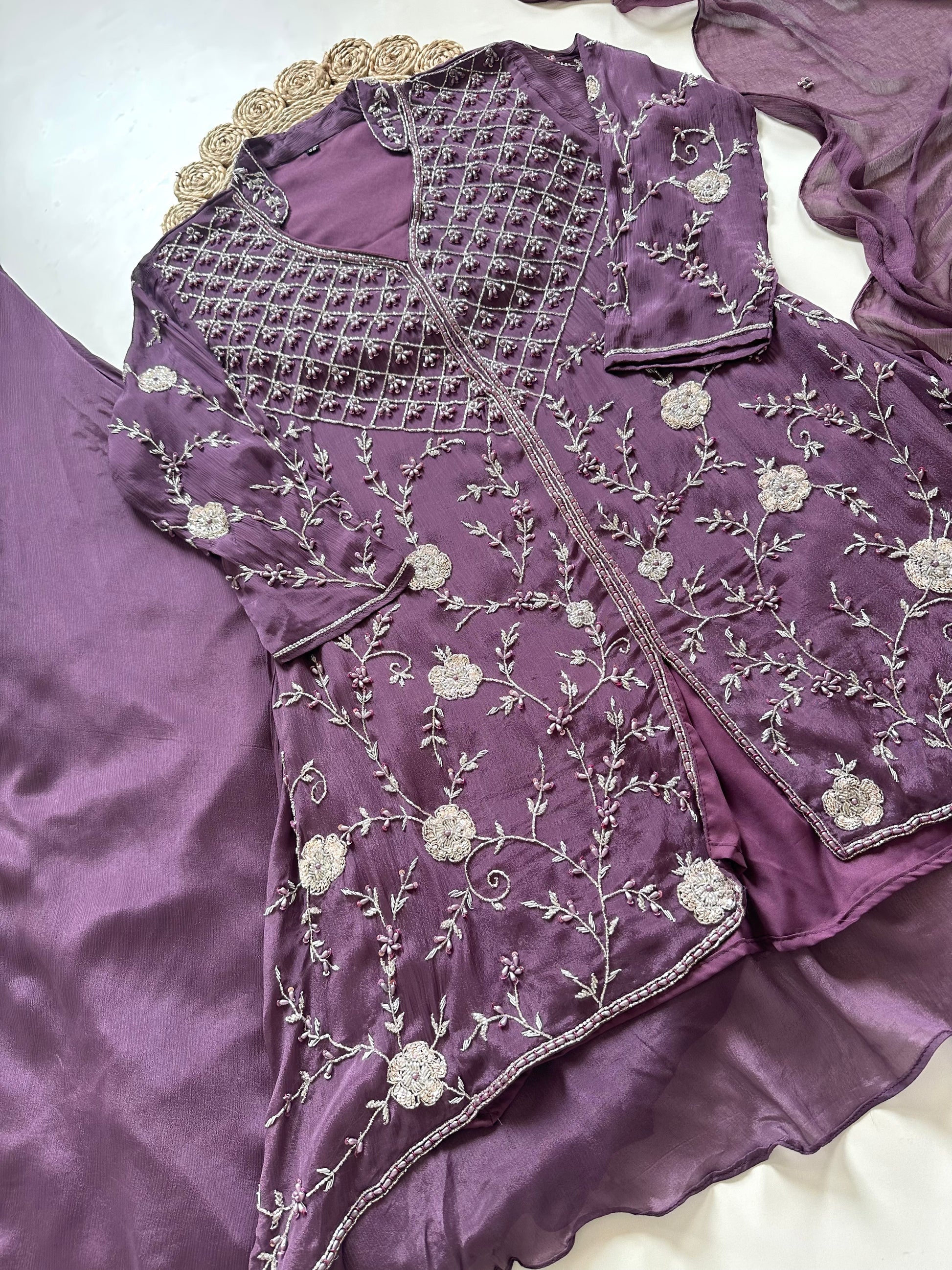 K030 - Heavy handwork Chinnon Short Top with palazzo and dupatta .