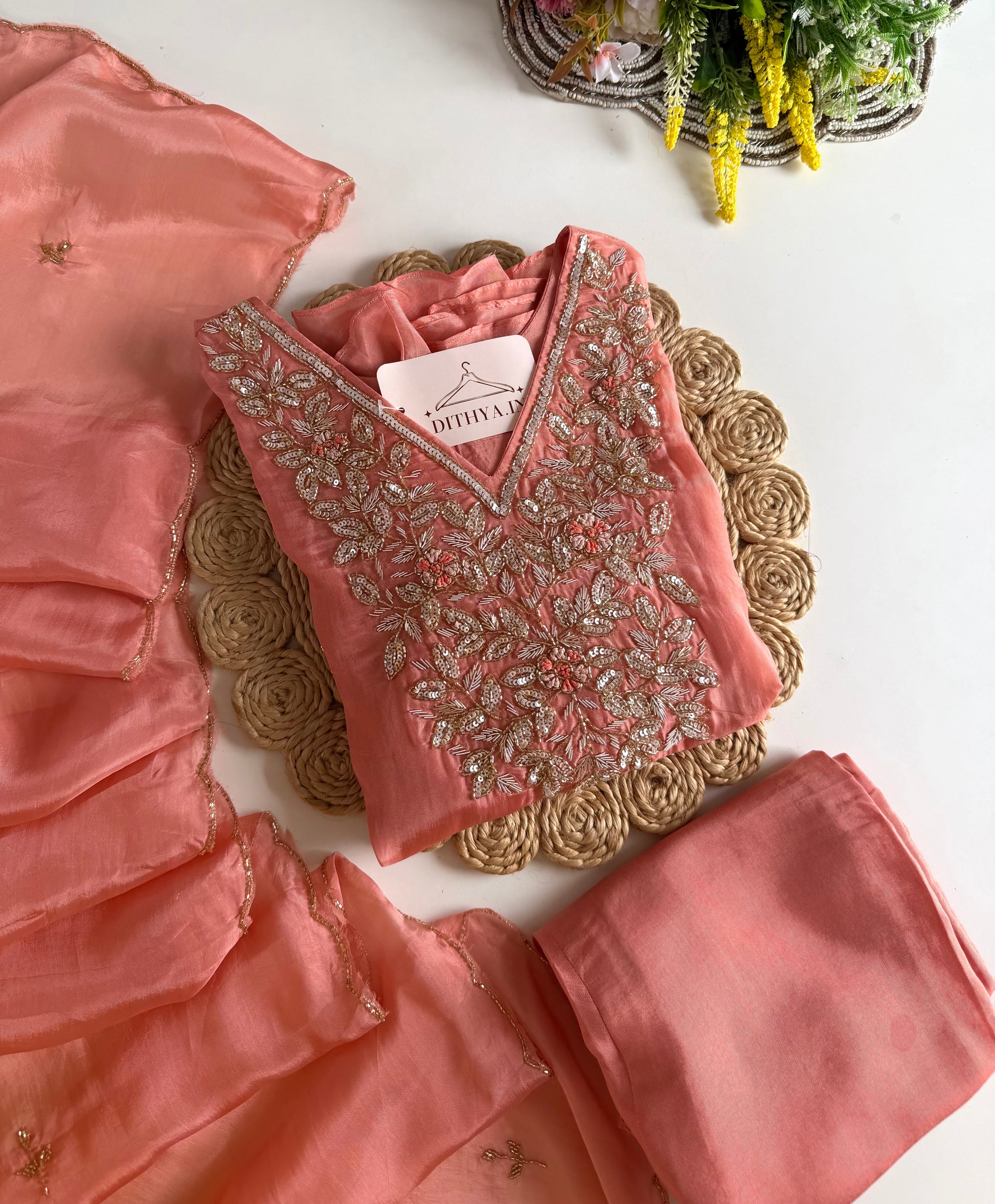 K204 - HO silk Aline handwork Kurti with pants and dupatta