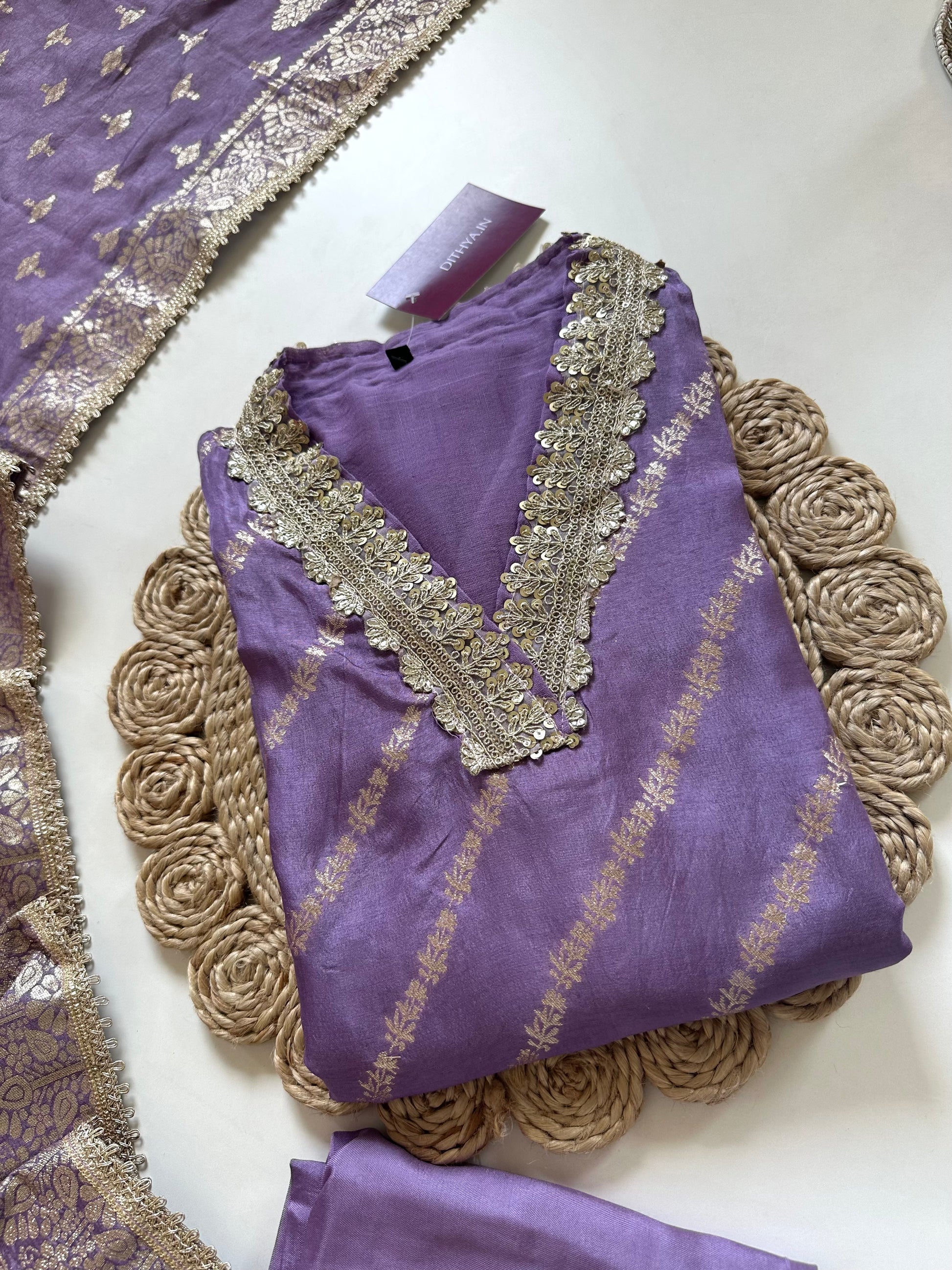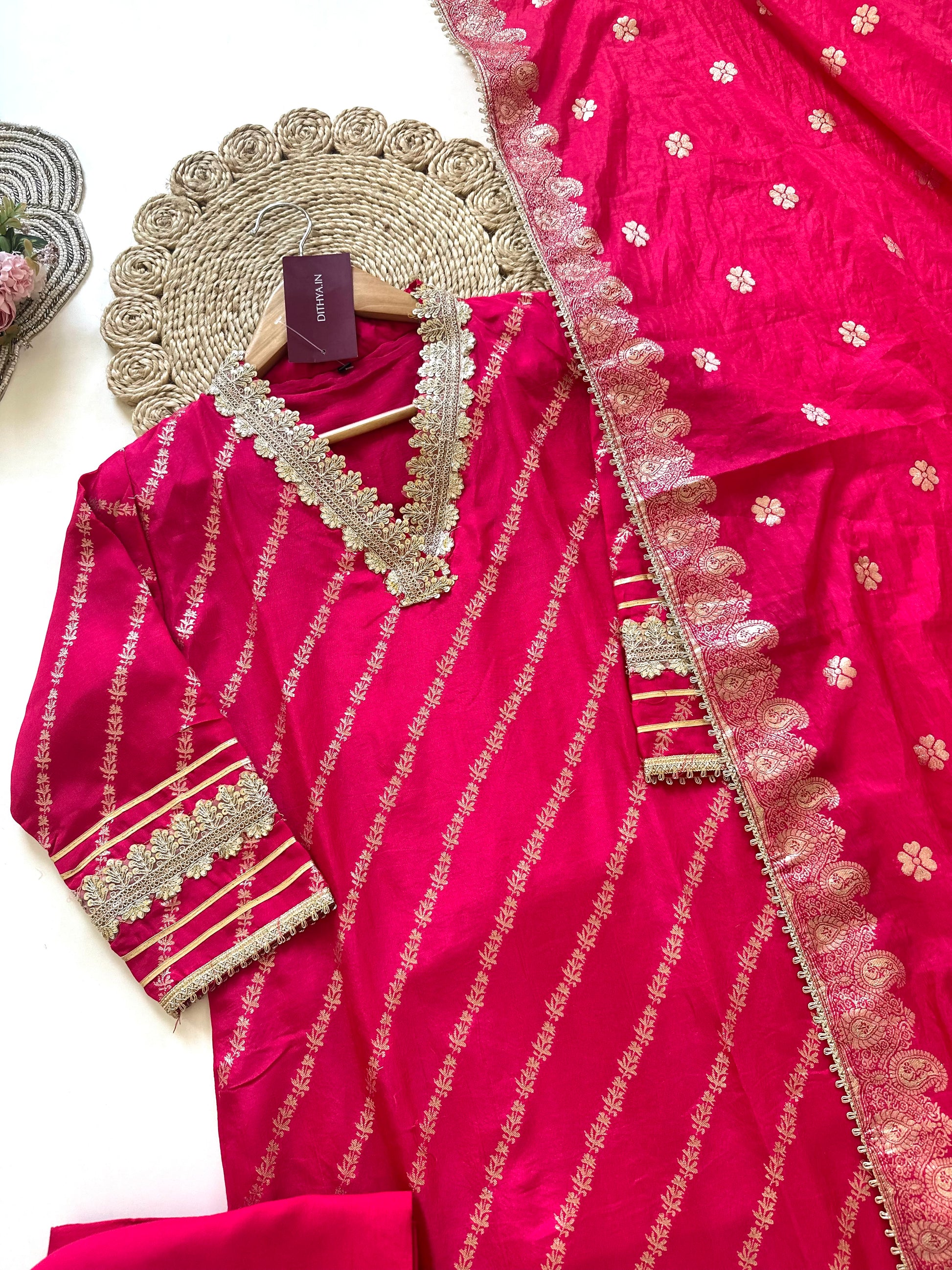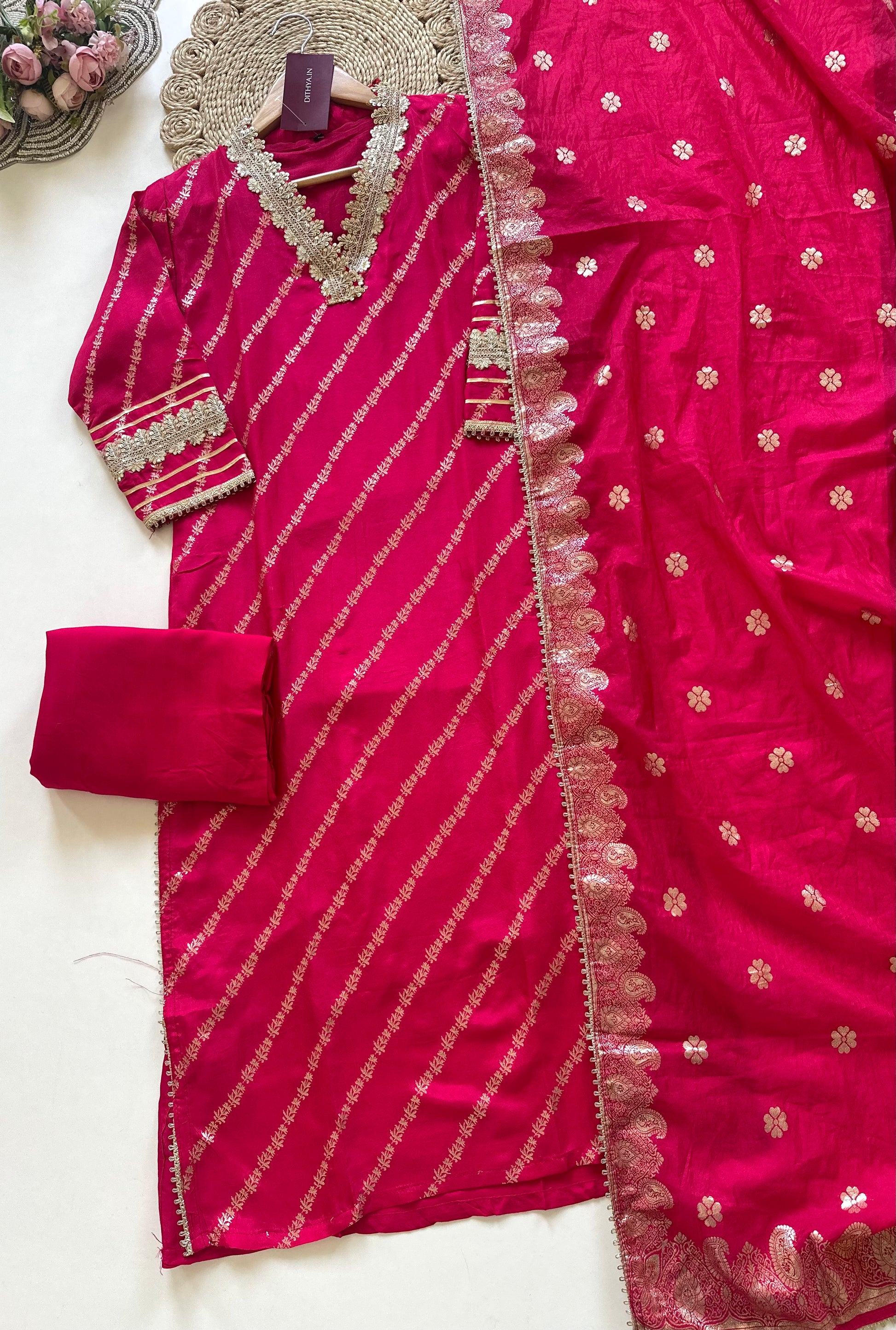 Introducing our Jacquard silk Collar neck straight kurti, available in 2 elegant colours. Made from high-quality jacquard silk, this set includes matching pants and dupatta for a complete, sophisticated look. Perfect for any occasion, elevate your style with this exquisite ensemble.