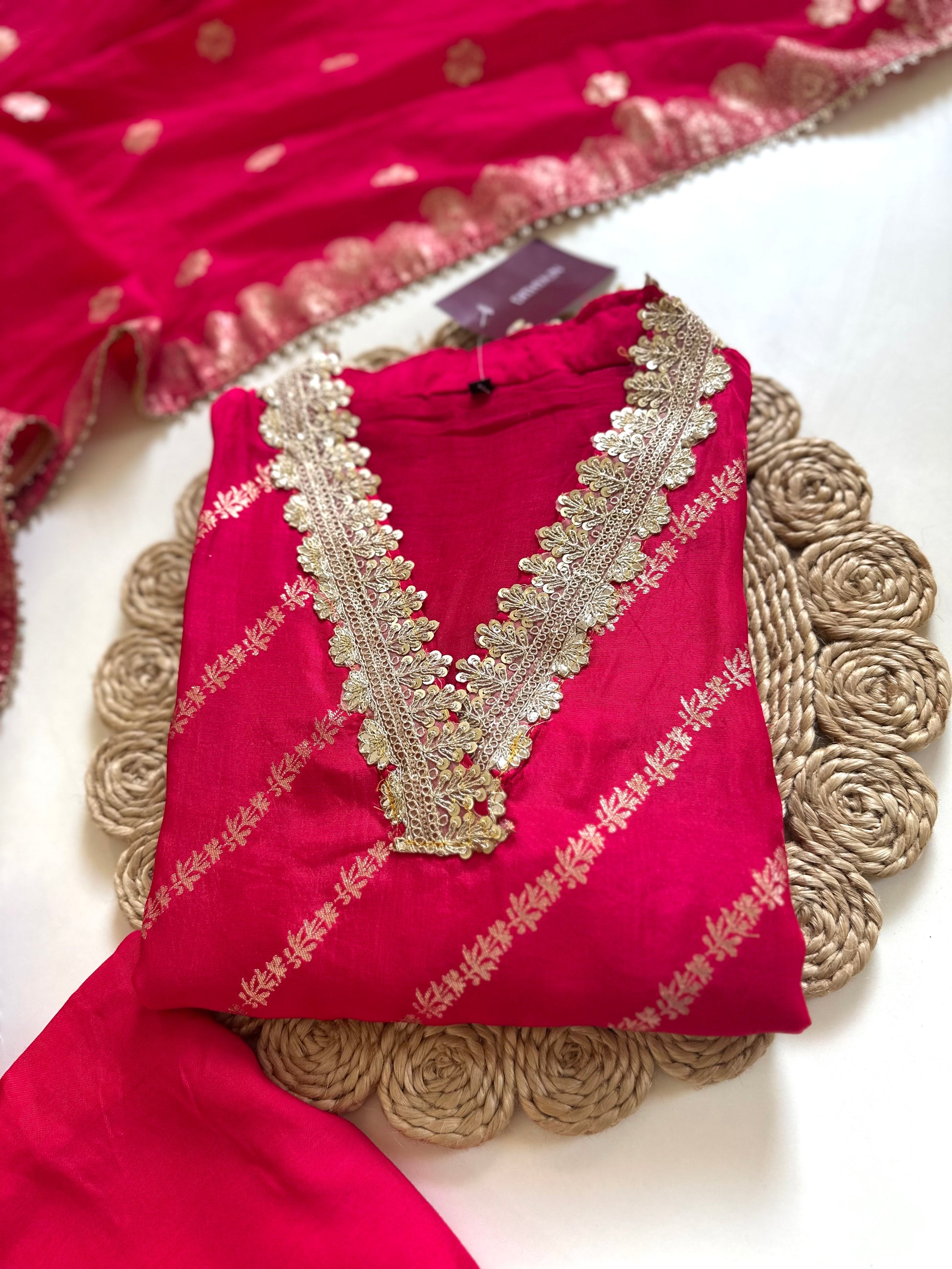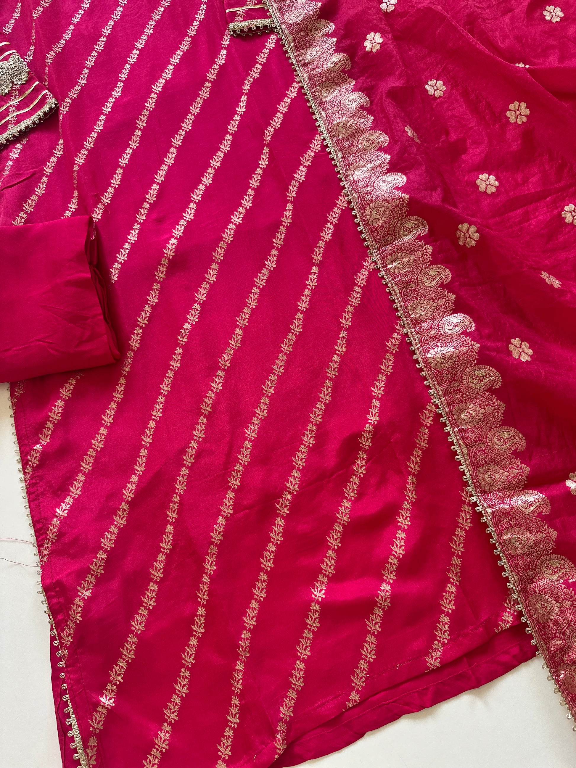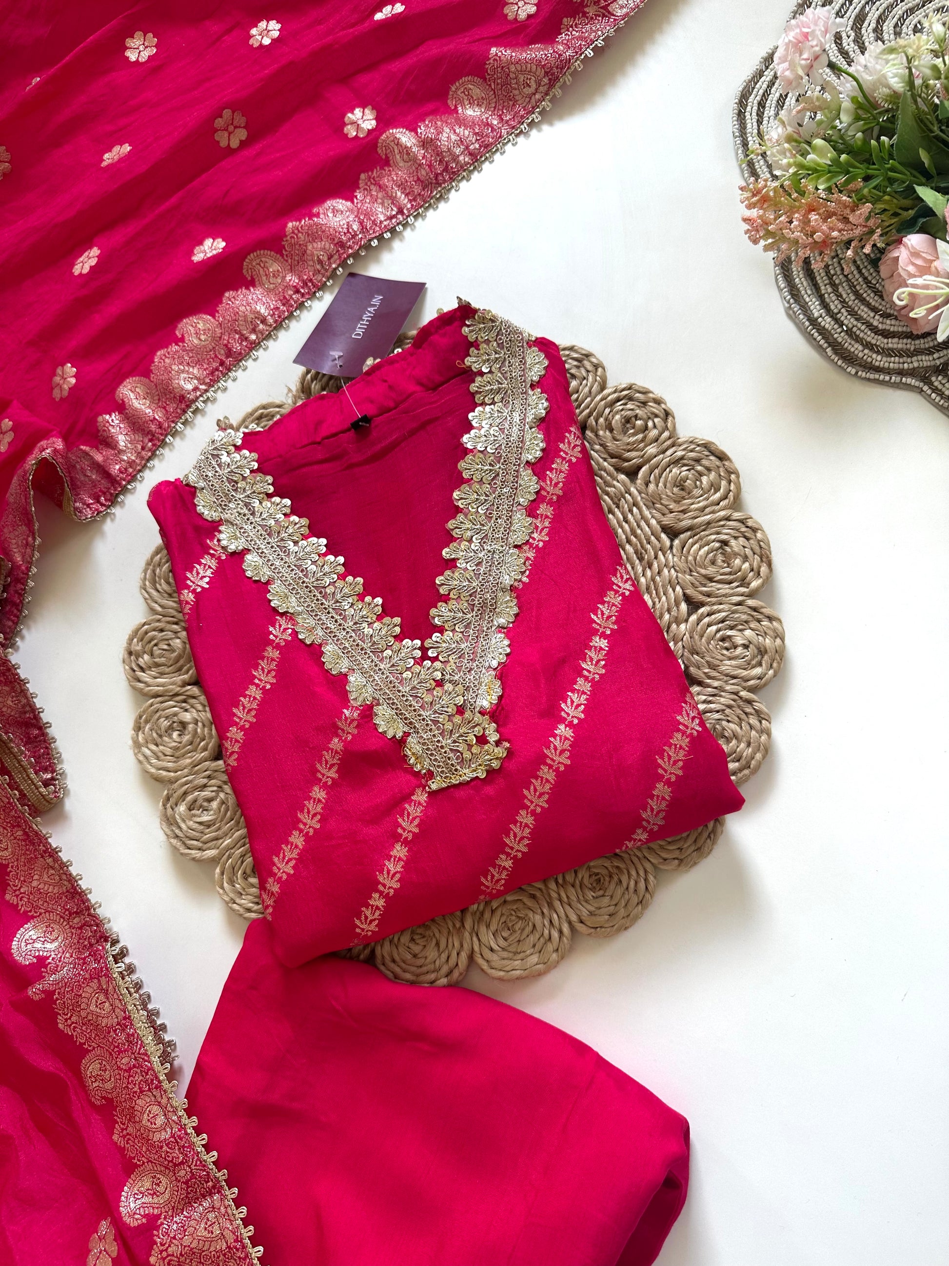 Introducing our Jacquard silk Collar neck straight kurti, available in 2 elegant colours. Made from high-quality jacquard silk, this set includes matching pants and dupatta for a complete, sophisticated look. Perfect for any occasion, elevate your style with this exquisite ensemble.