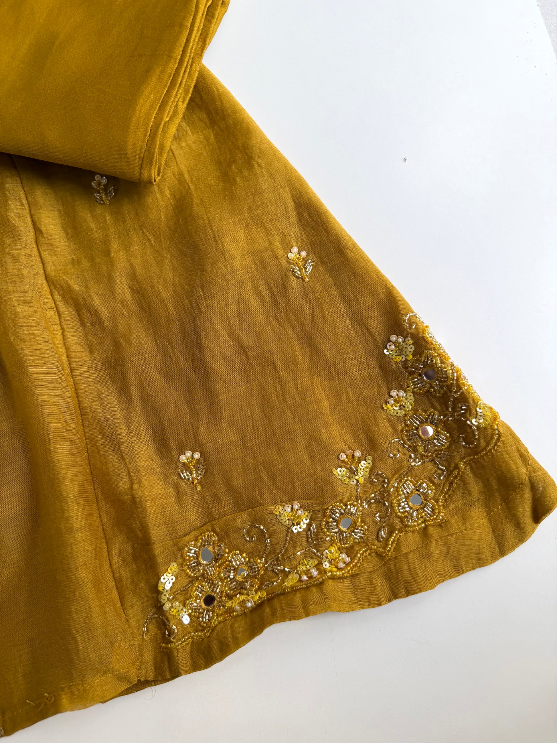 Discover the intricate artistry of Mul chanderi handwork with our K508 Kurti set. Made from soft and luxurious chanderi fabric, this set includes a stylish kurti, pants, and dupatta for a complete and elegant look. Elevate your wardrobe with this unique and expertly crafted ensemble.