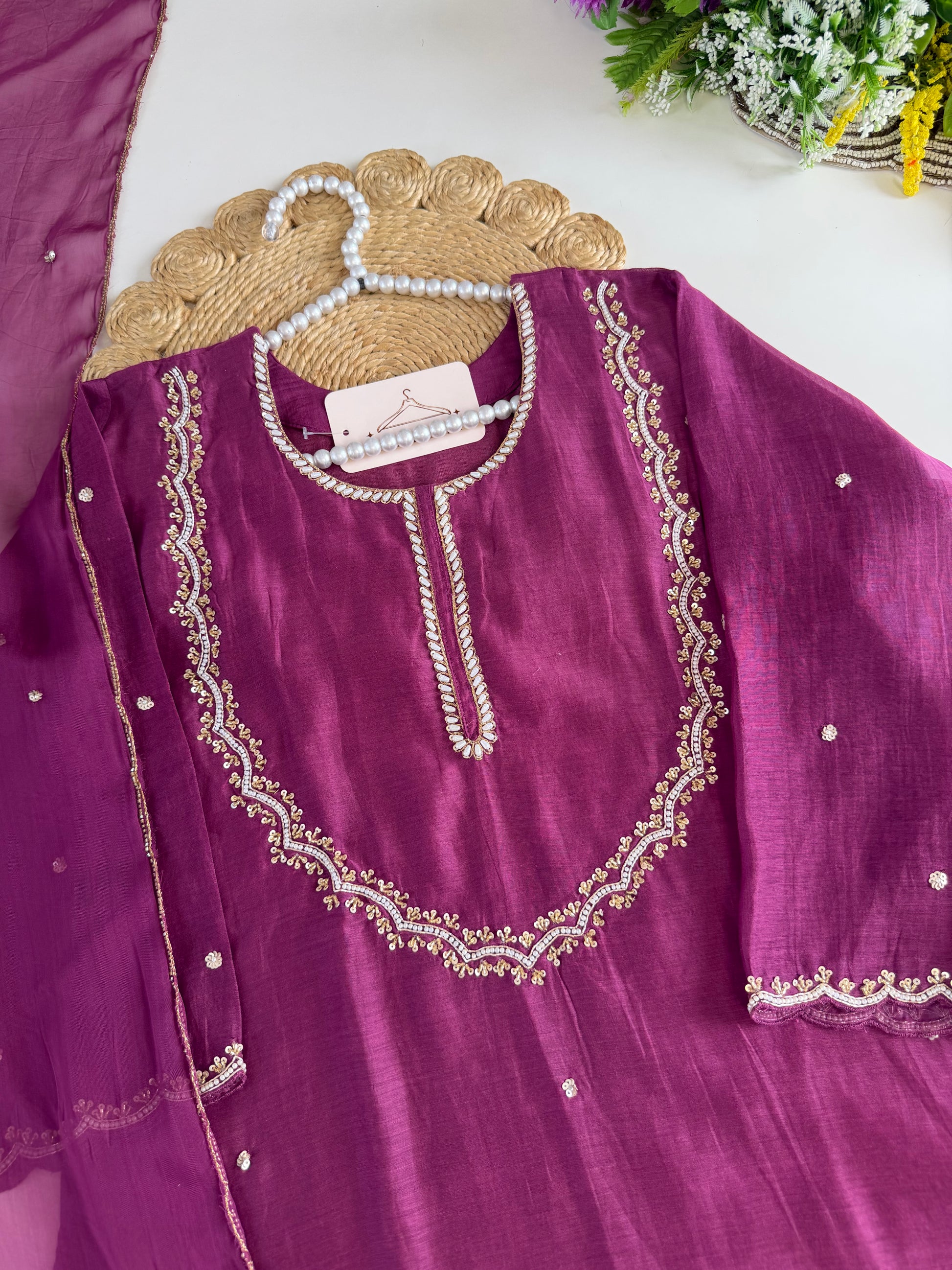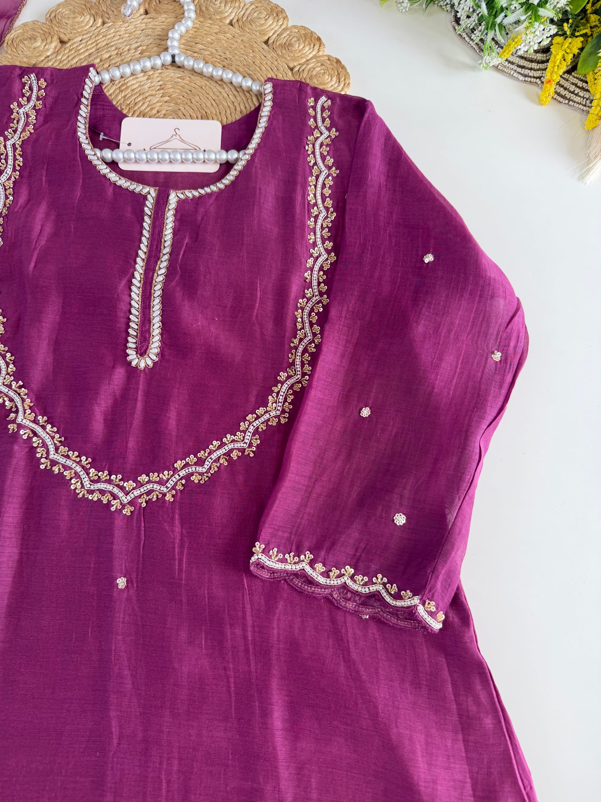 K533 - Mul chanderi handwork aline Kurti with pants and dupatta