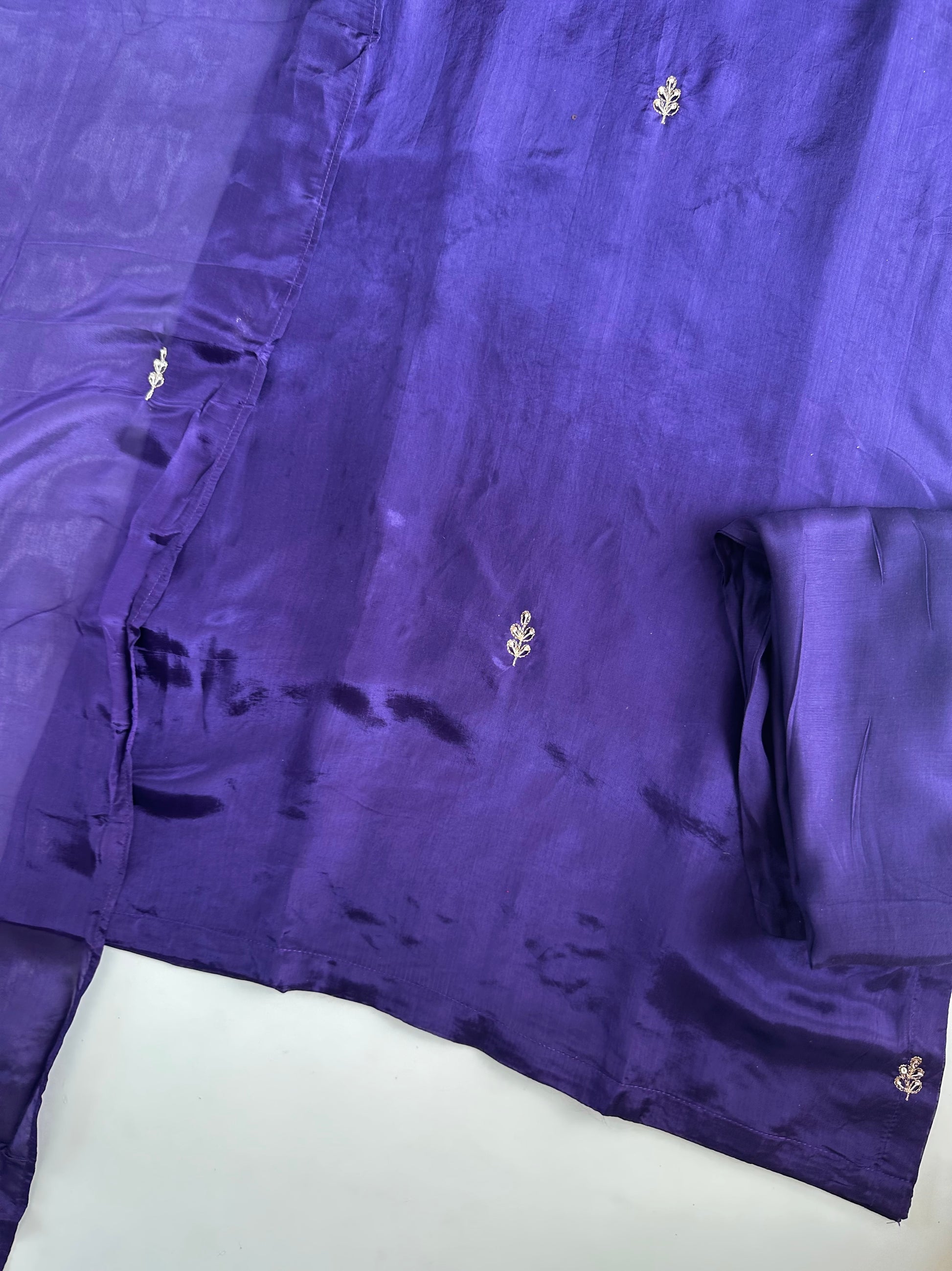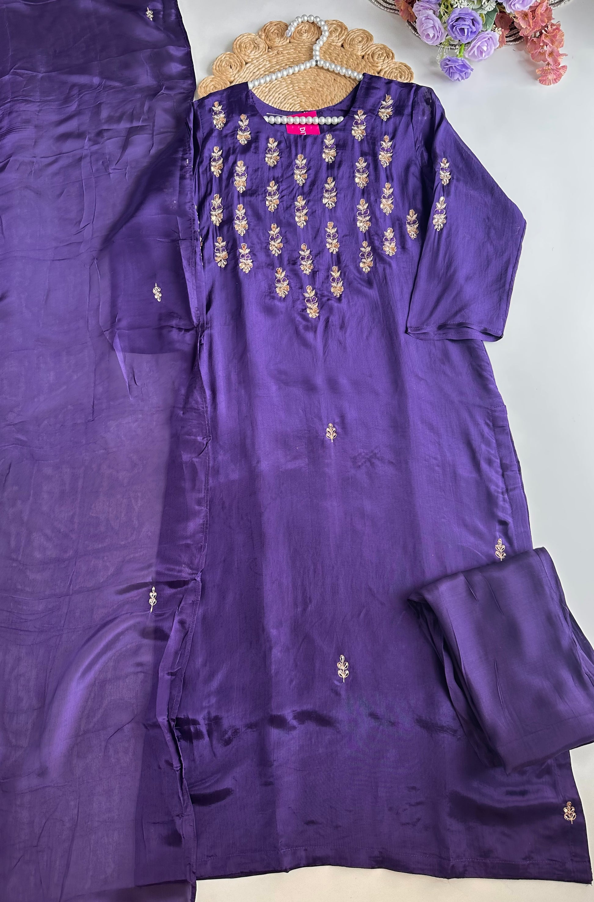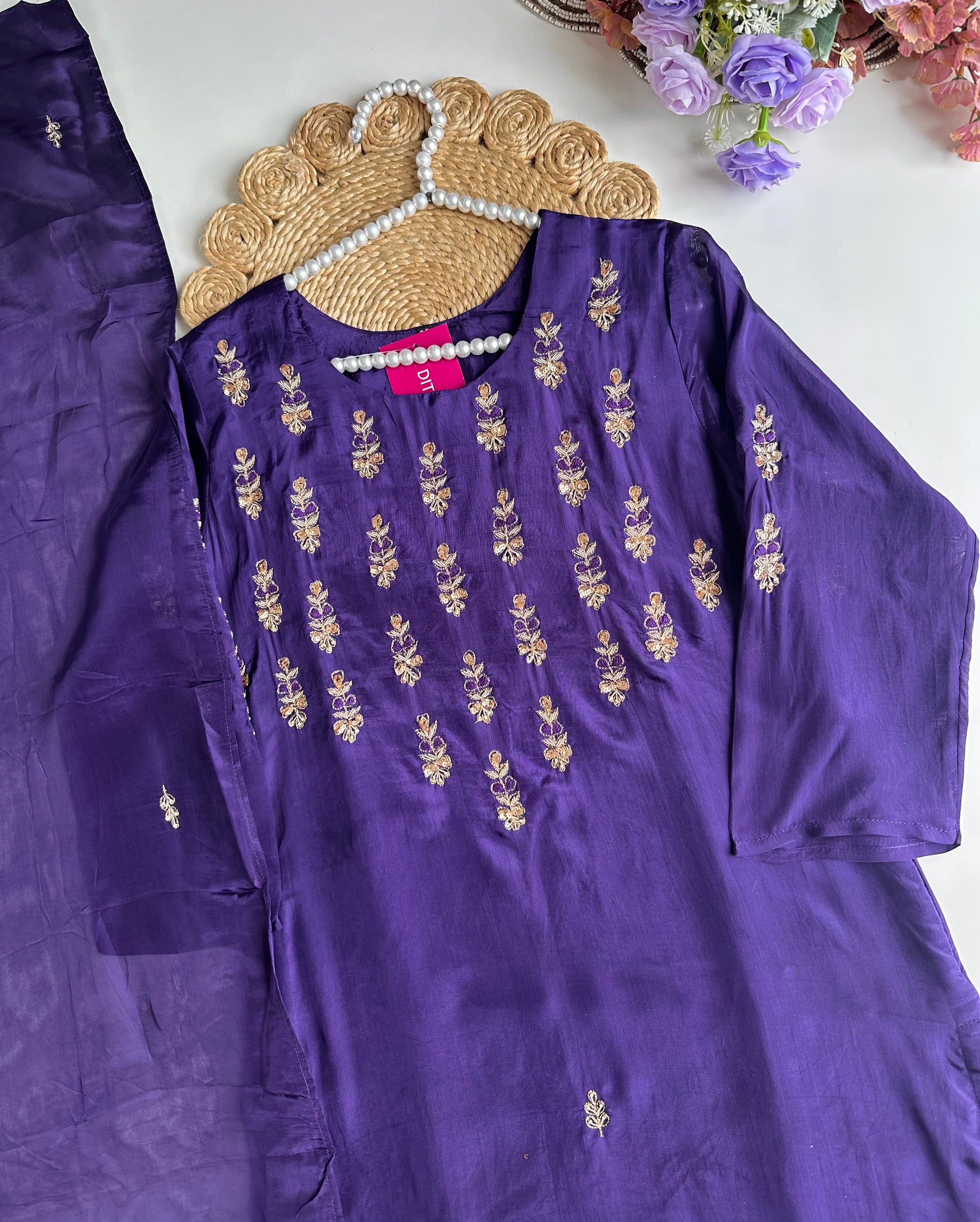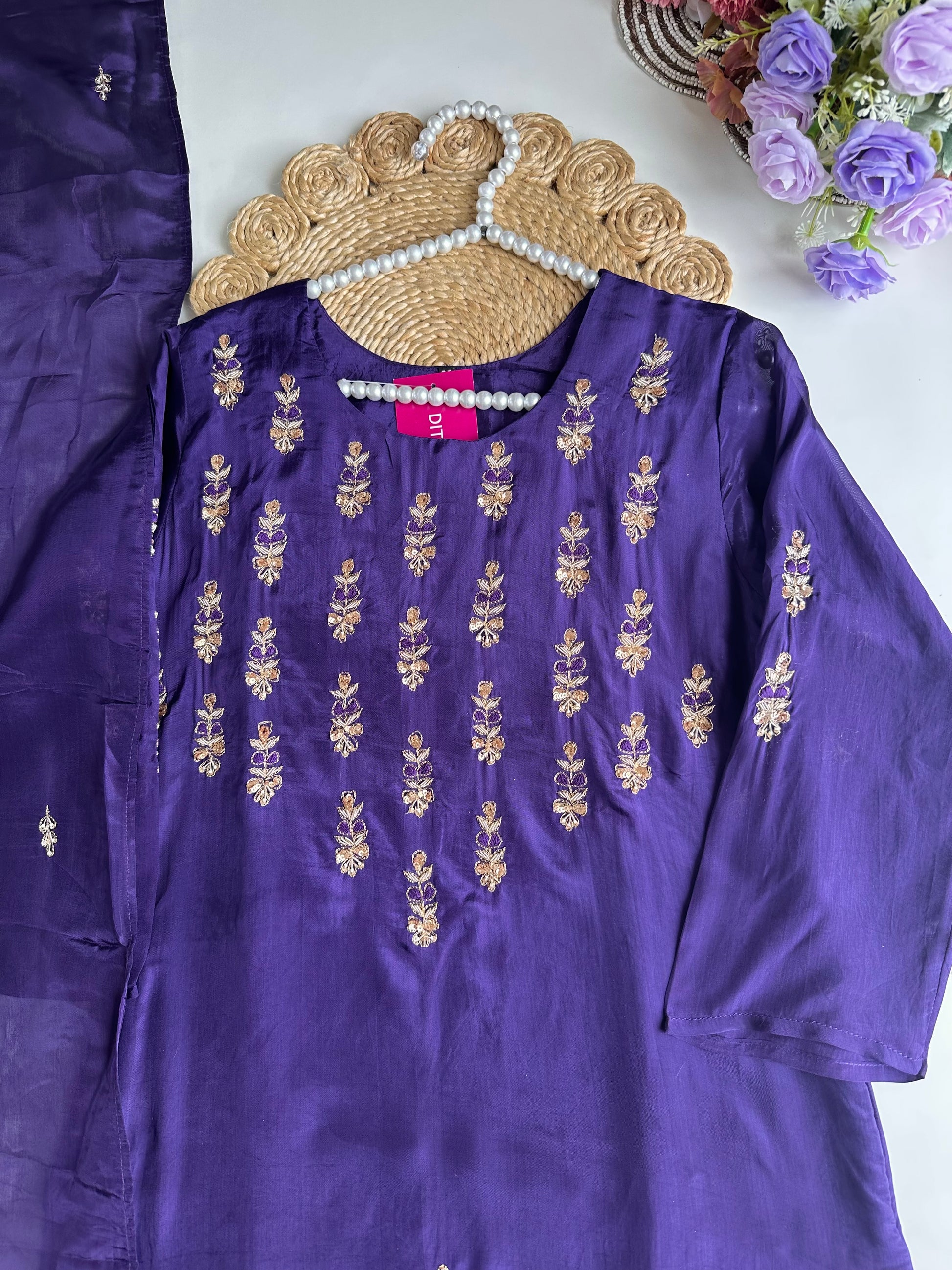 Introducing the elegant Russian silk straight Kurti with matching pants and dupatta. Handcrafted from premium Russian silk, this Kurti offers exquisite handiwork and a straight silhouette for a sophisticated look. Perfect for special occasions, this set is sure to make a statement and elevate your style.