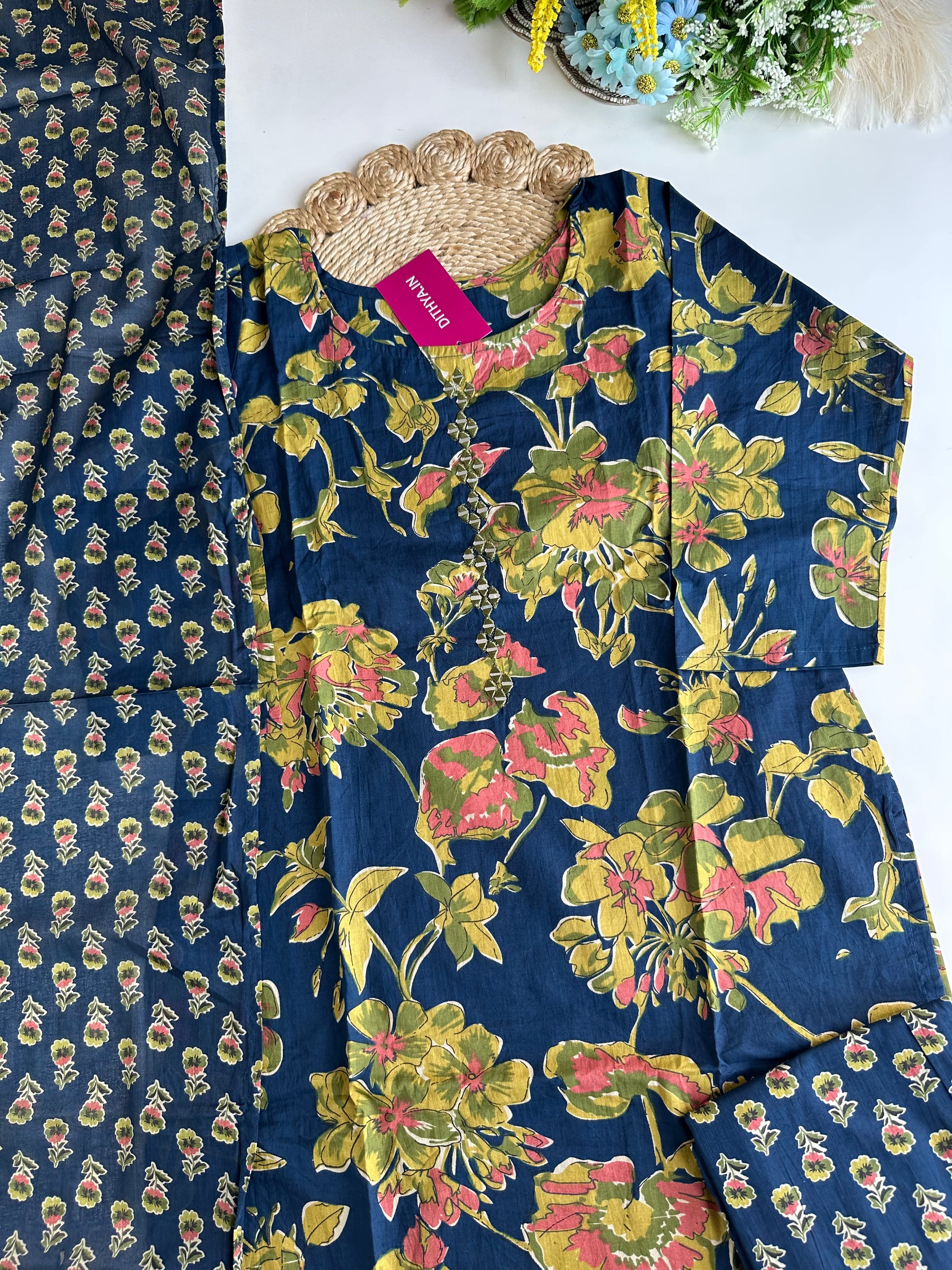 K071 - Cotton floral straight Kurti with pants and dupatta in 4 colours