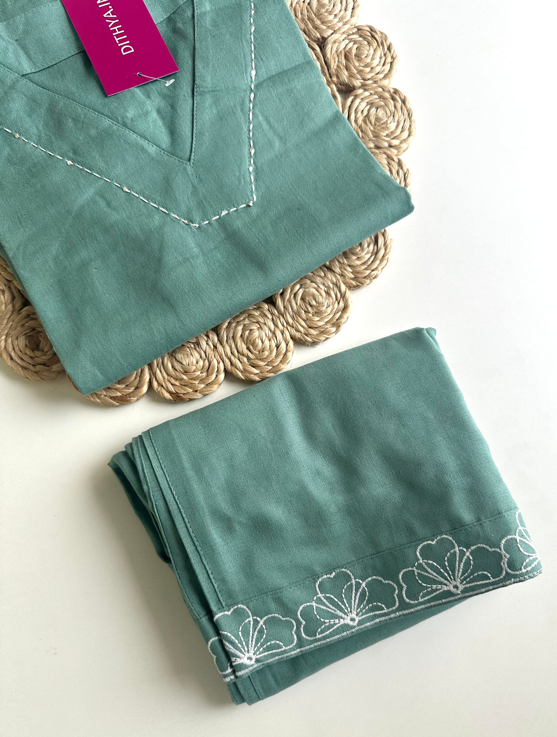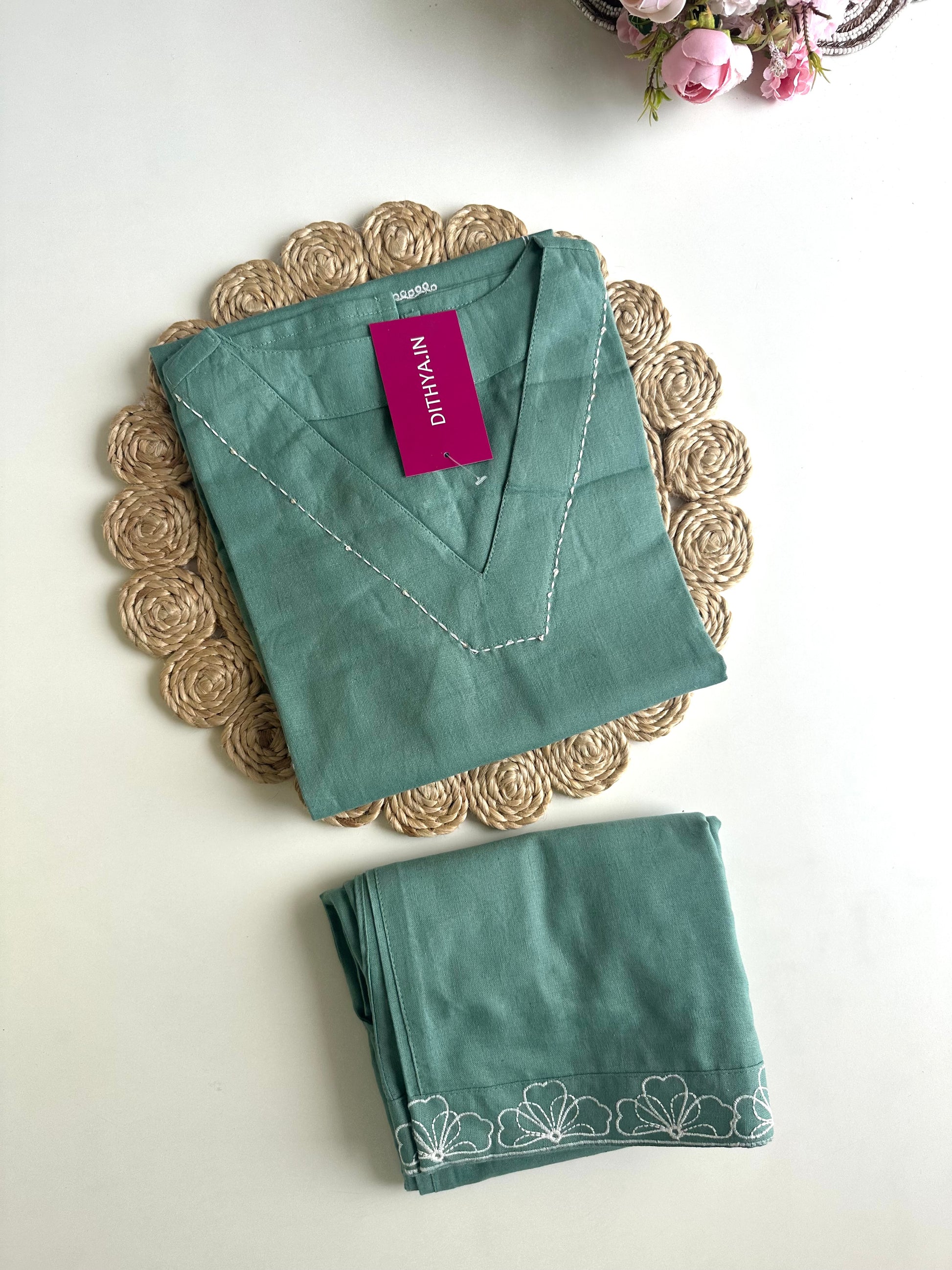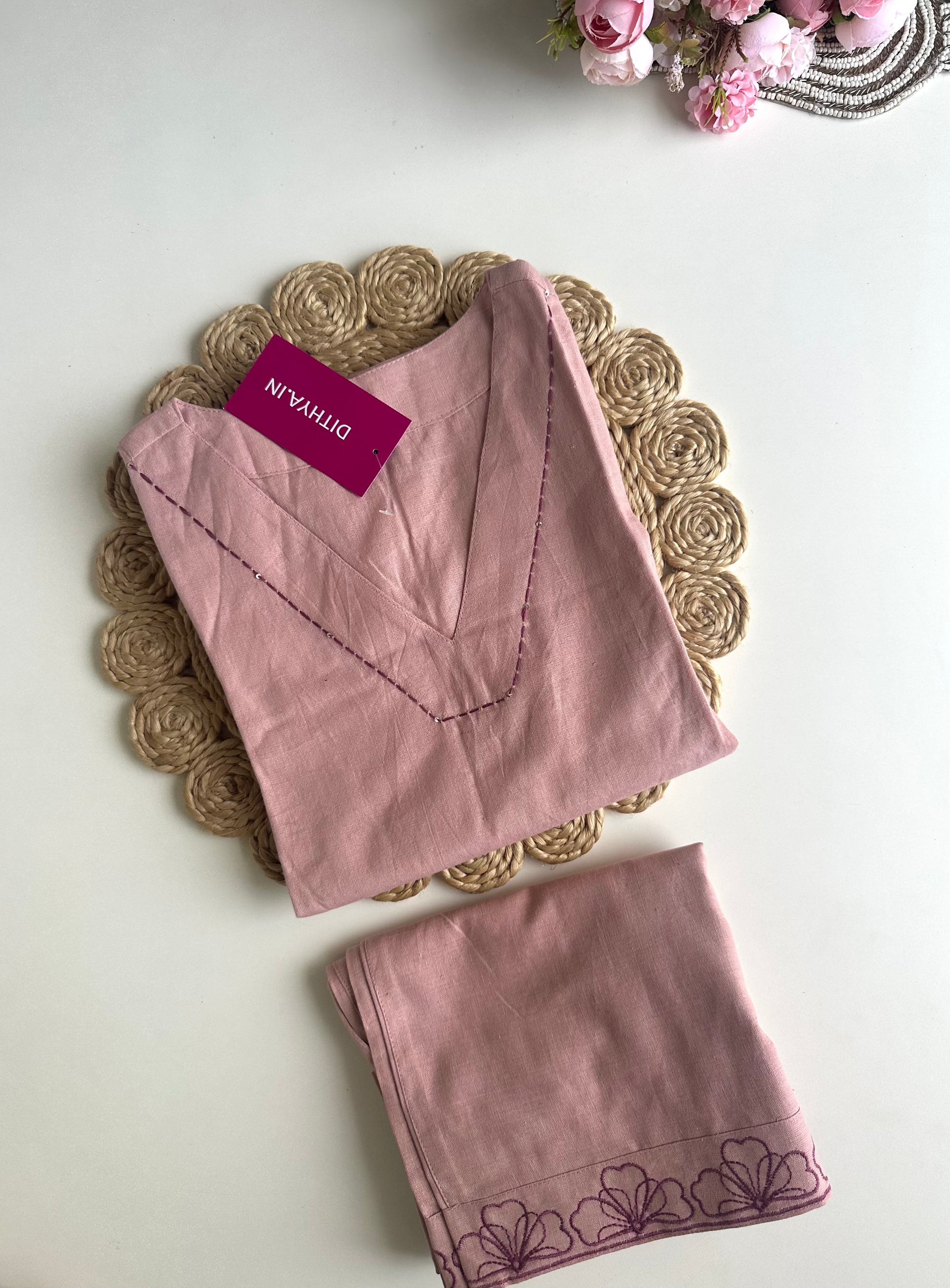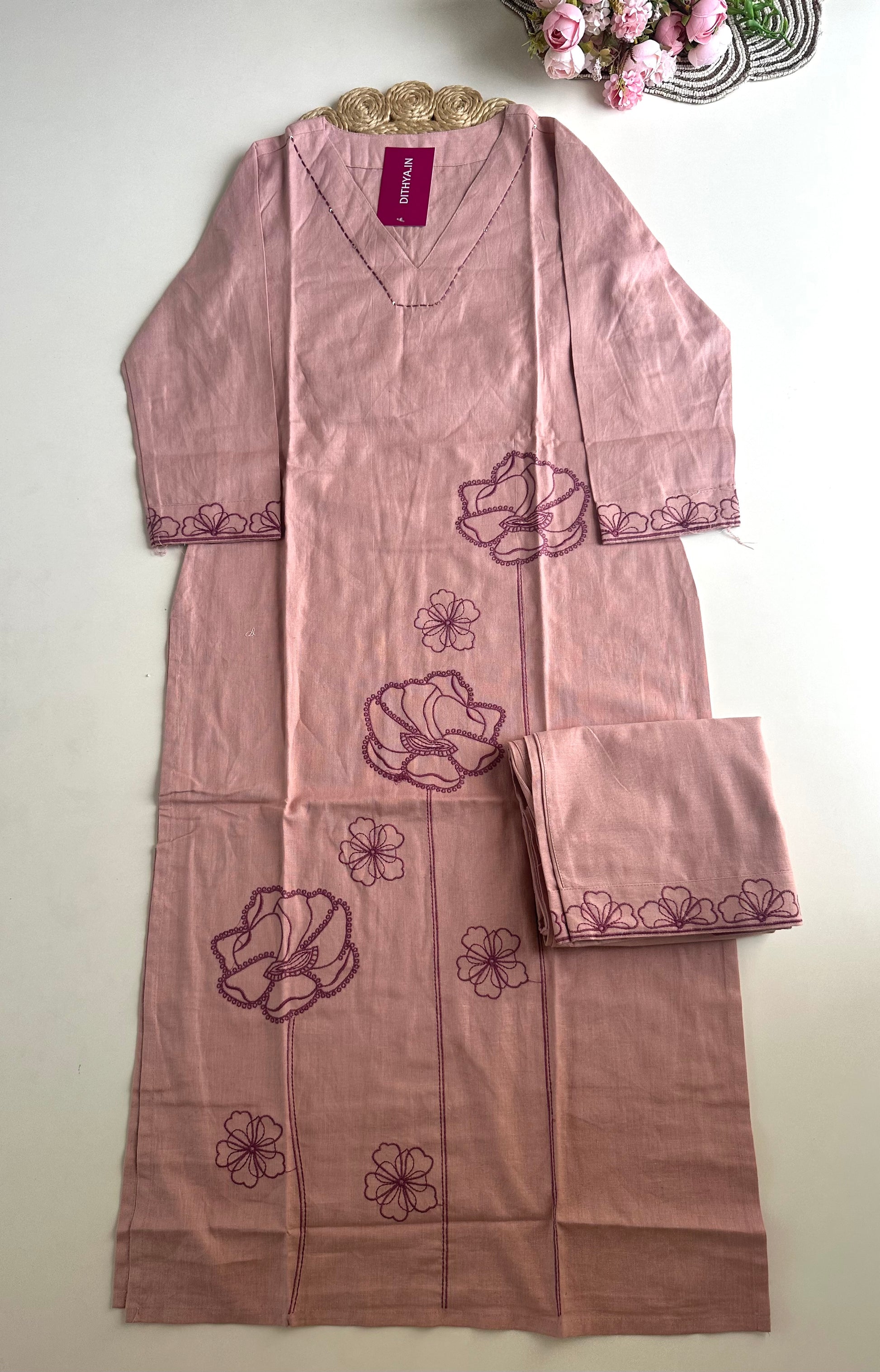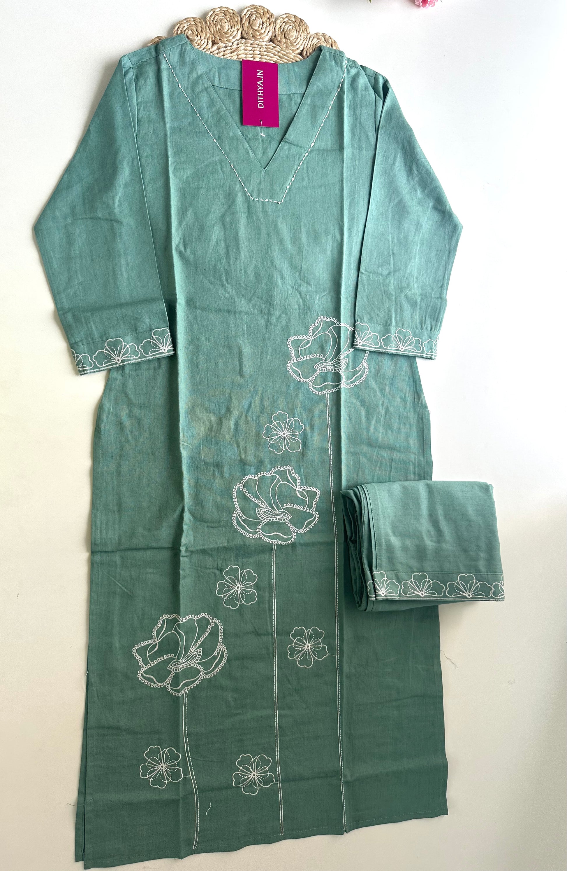 K438 - Linen cotton embroidered Aline Kurti with pants in 2 colours