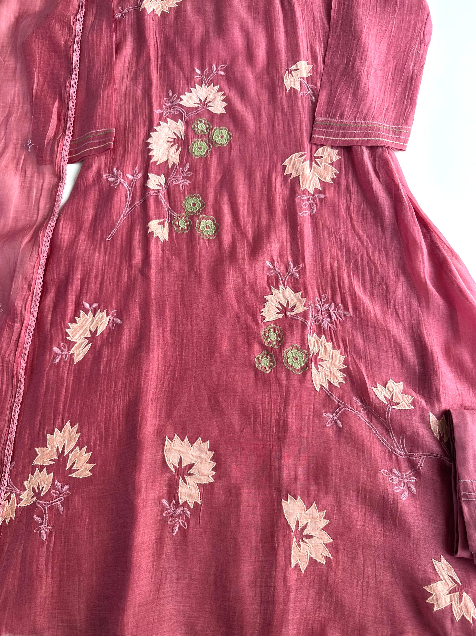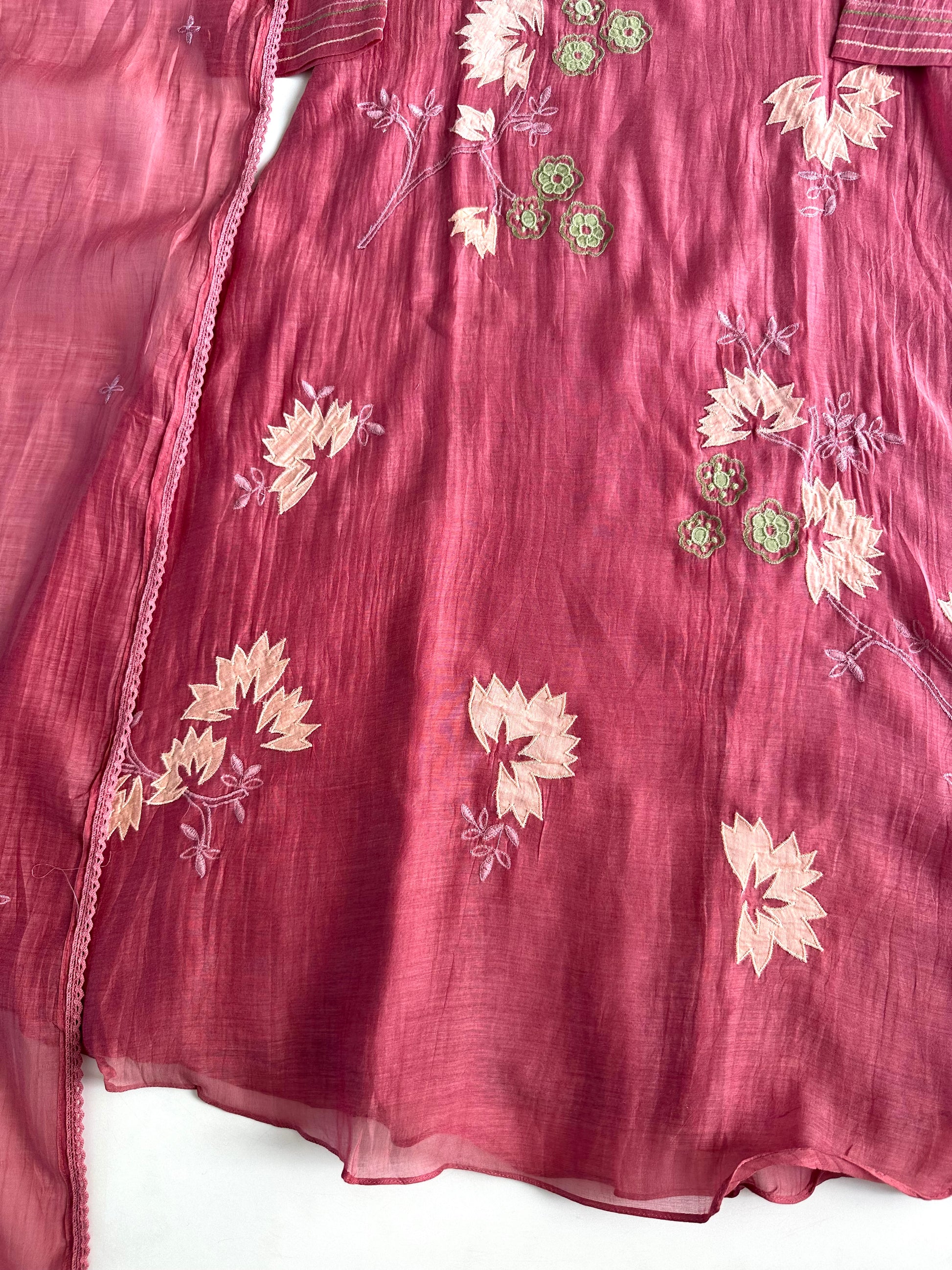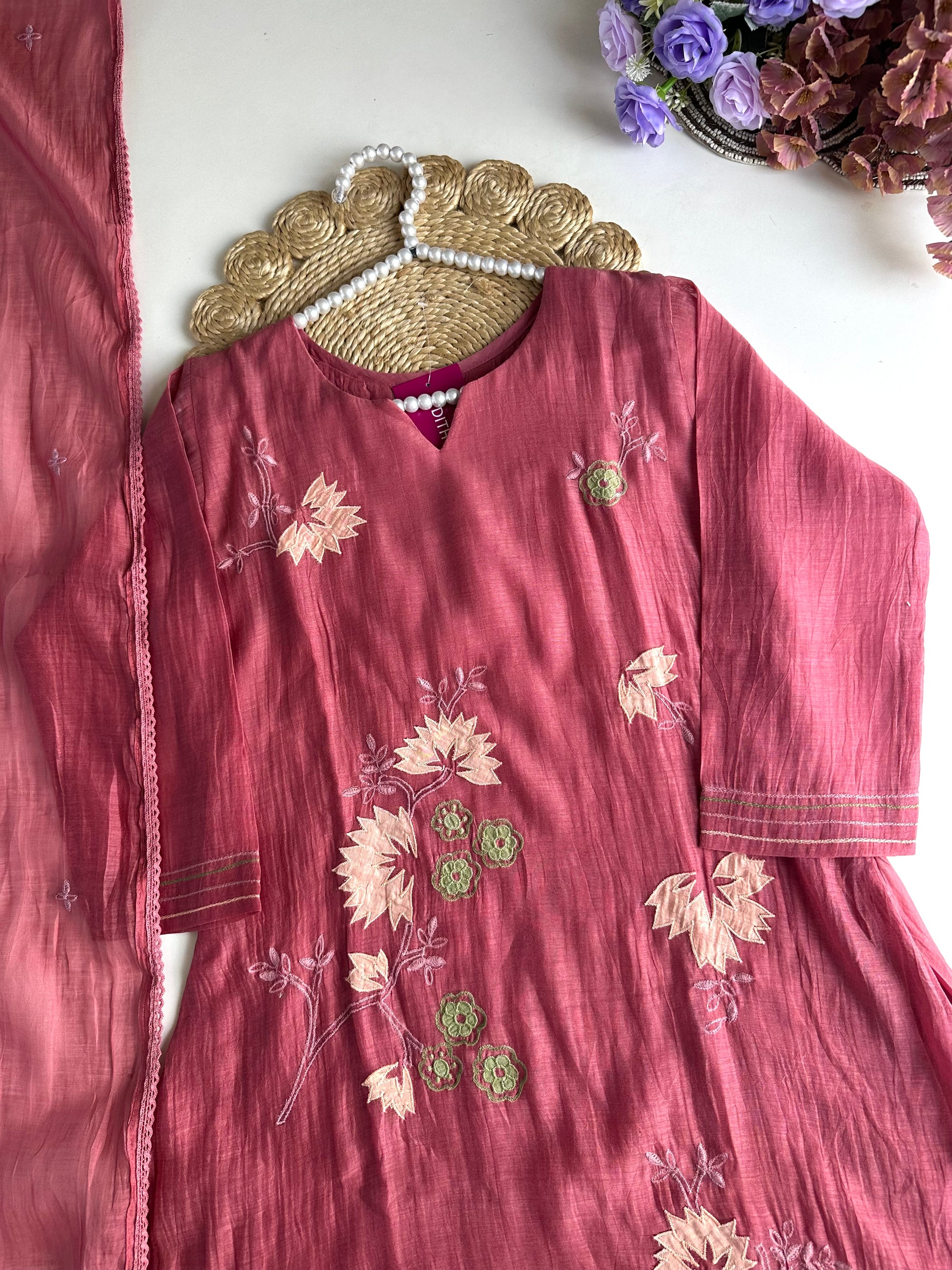 K030 - Mul Chanderi Appliqué work Aline Kurti with pants and dupatta