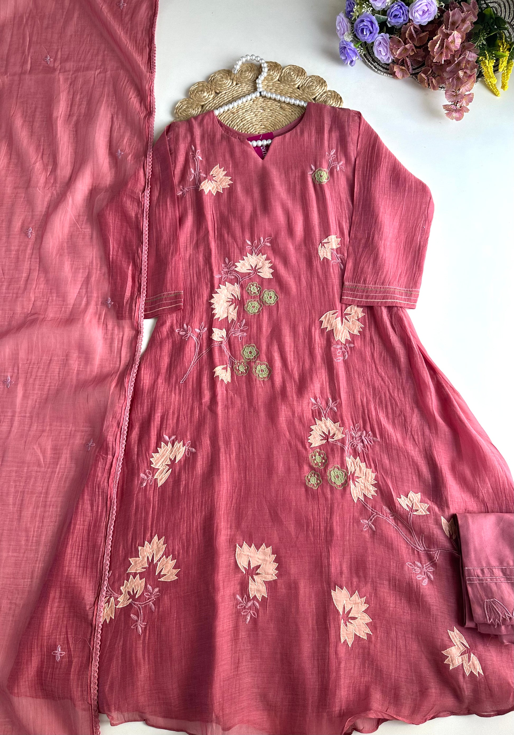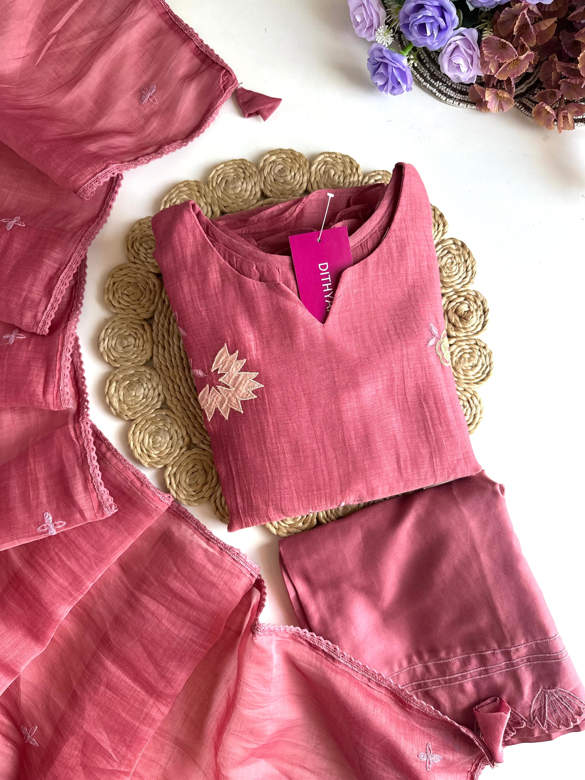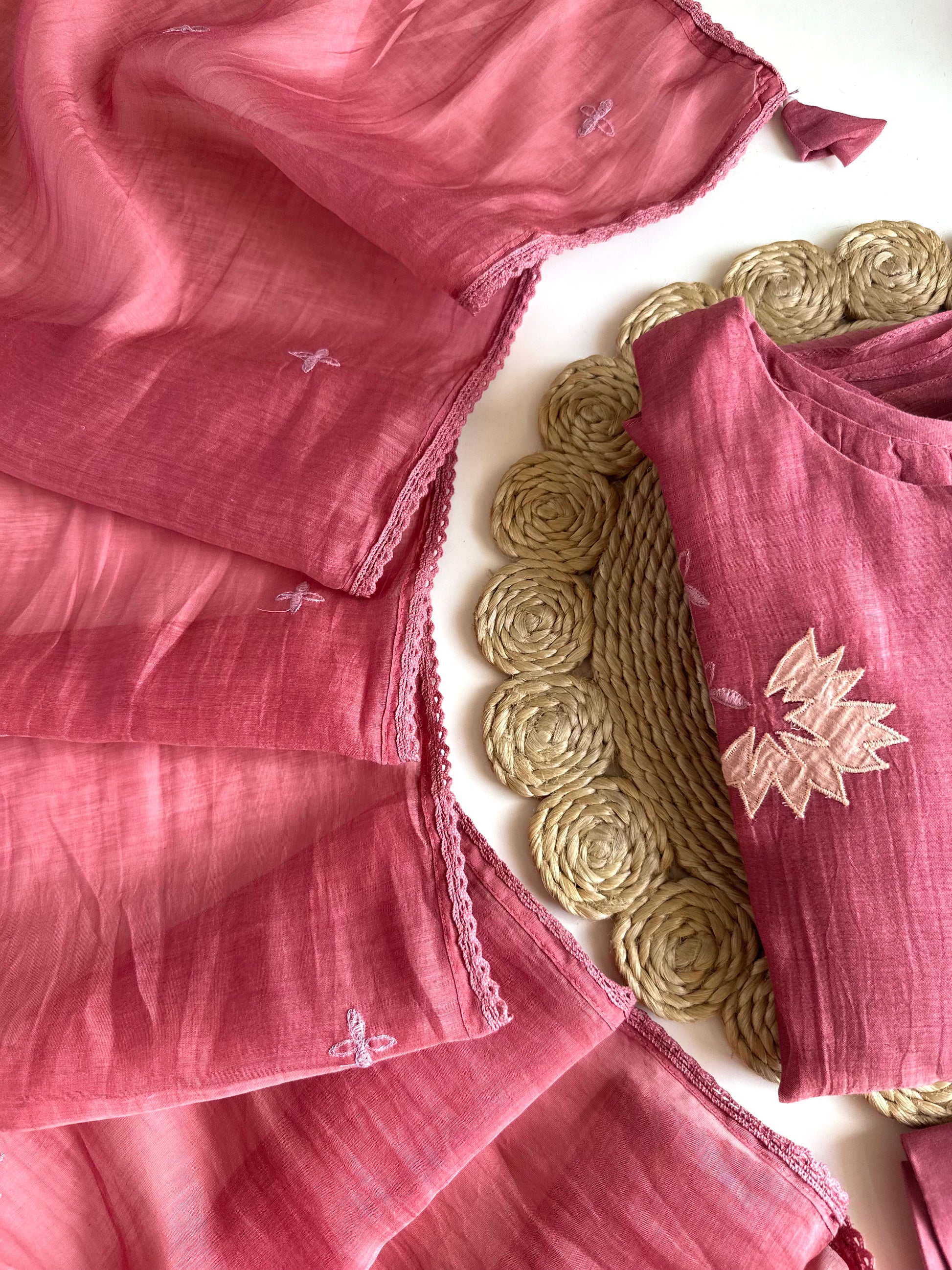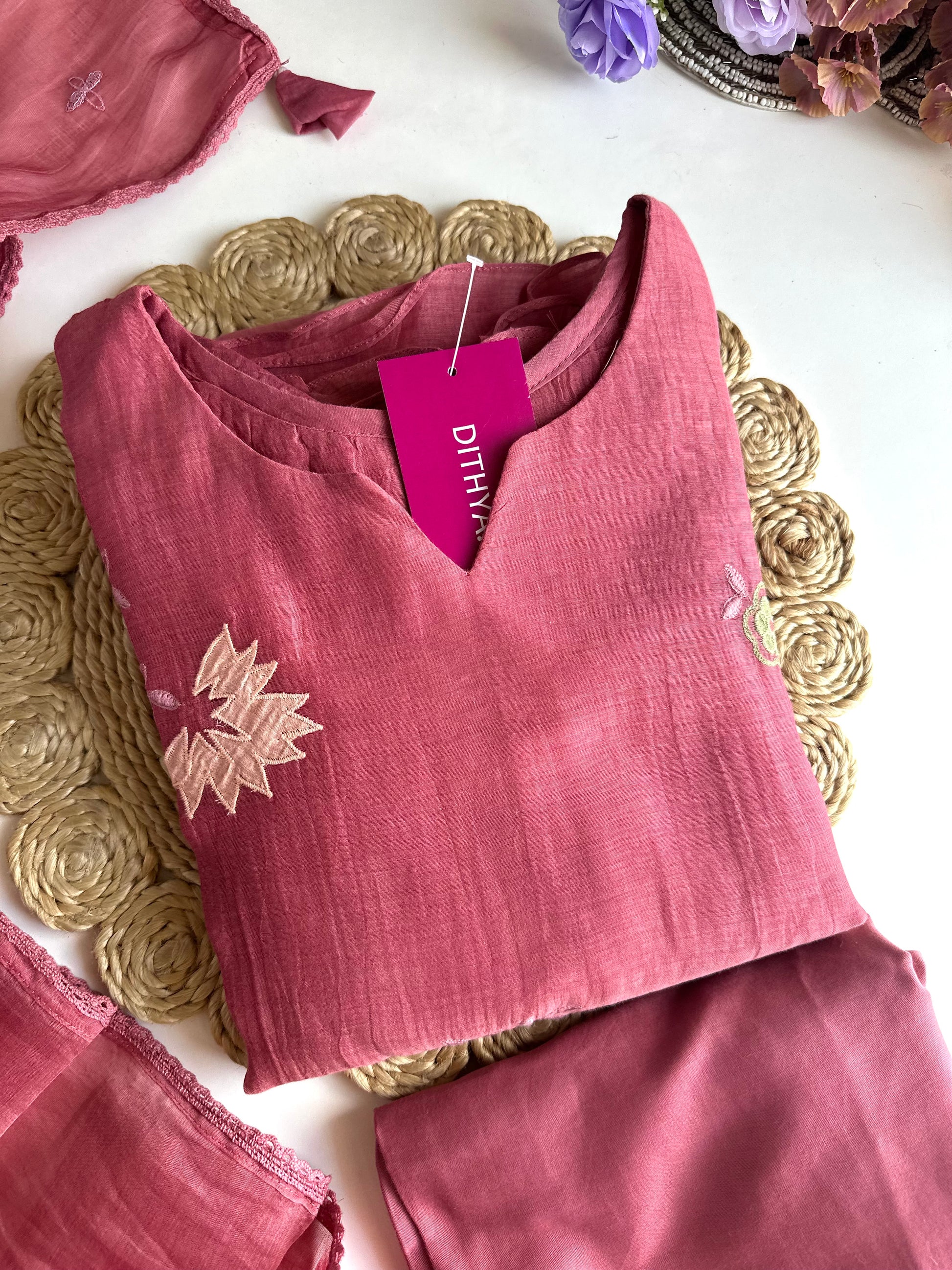 K030 - Mul Chanderi Appliqué work Aline Kurti with pants and dupatta