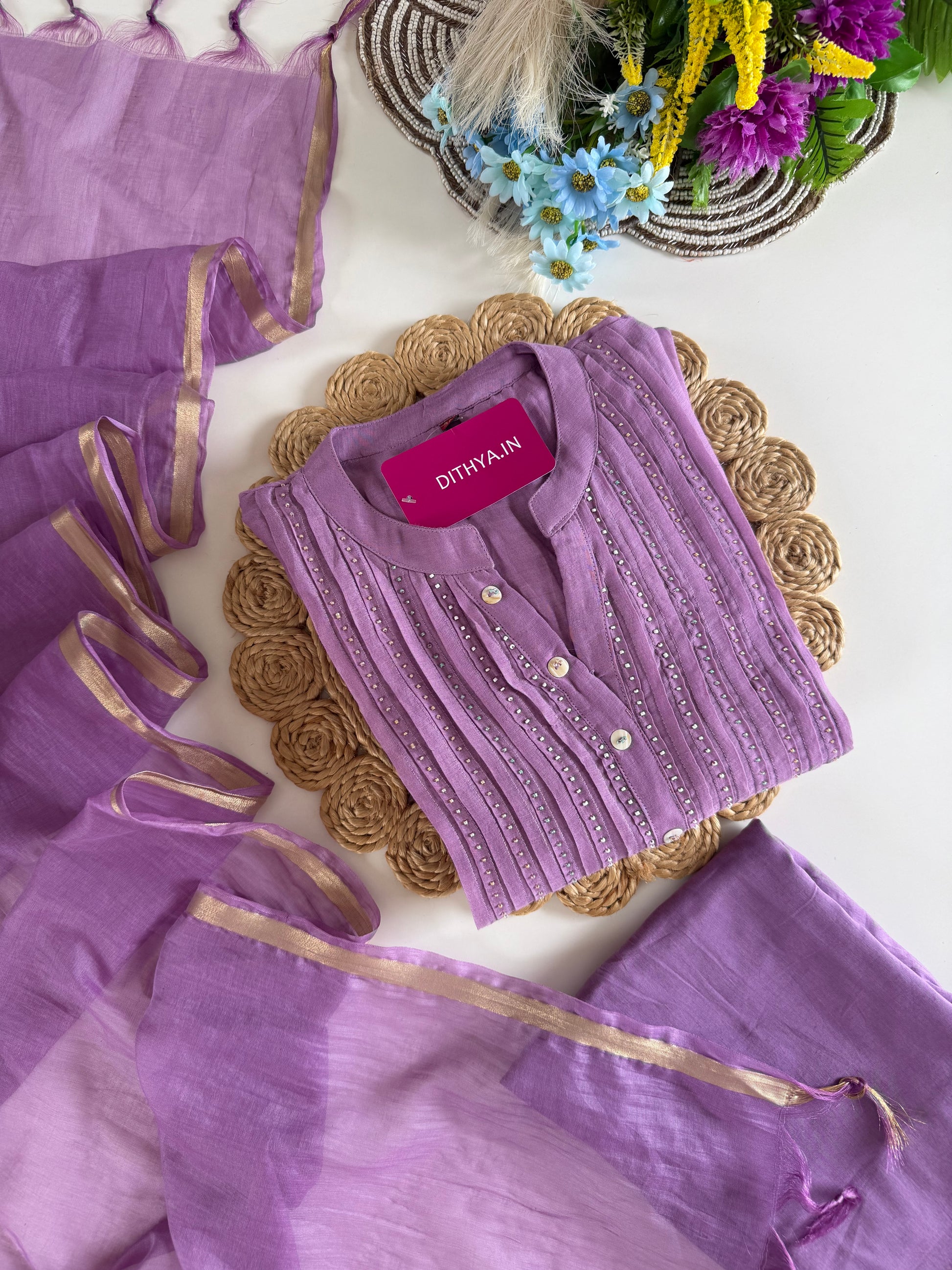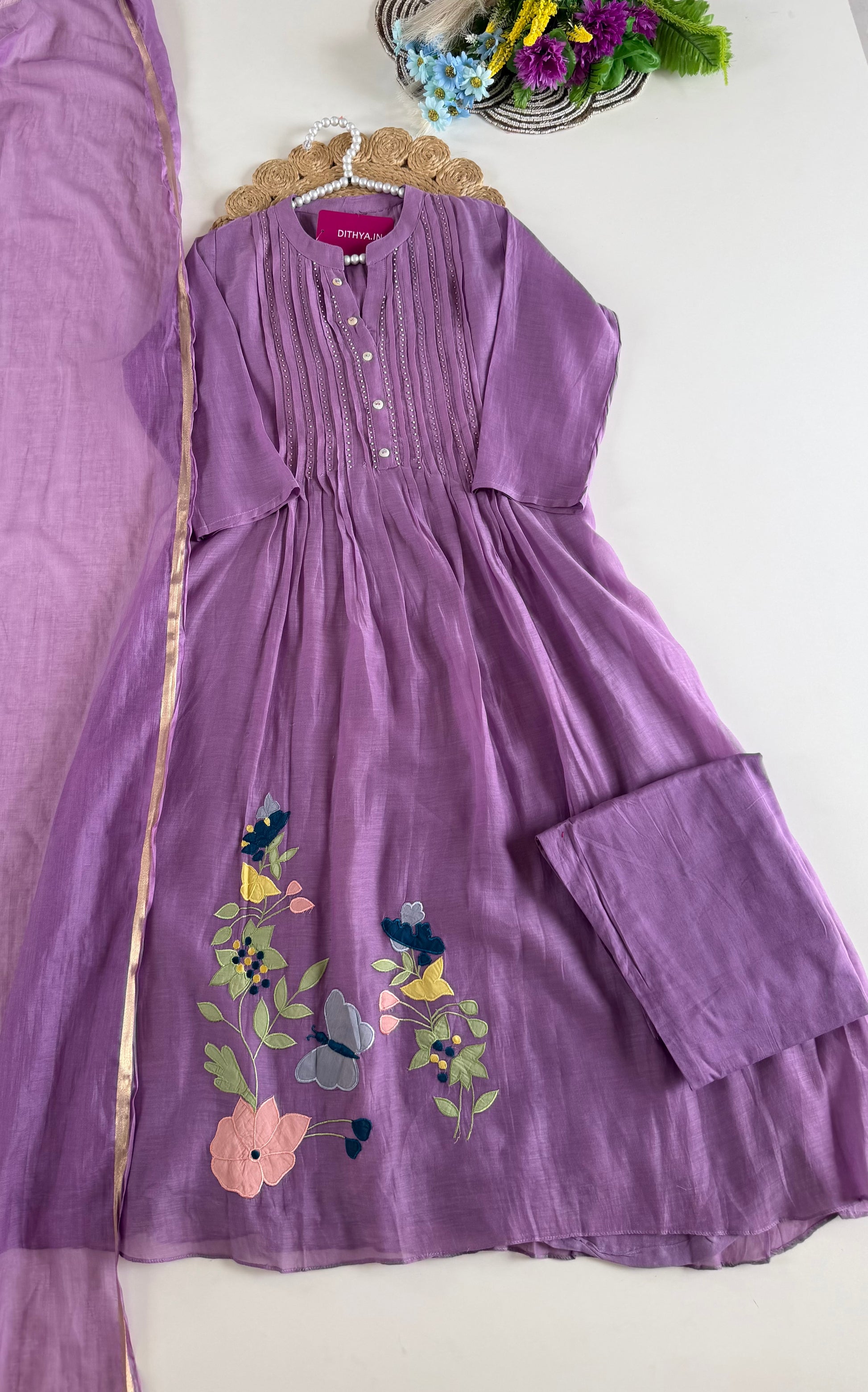 K616 - Mul chanderi appliqué work aline Kurti with pants and dupatta