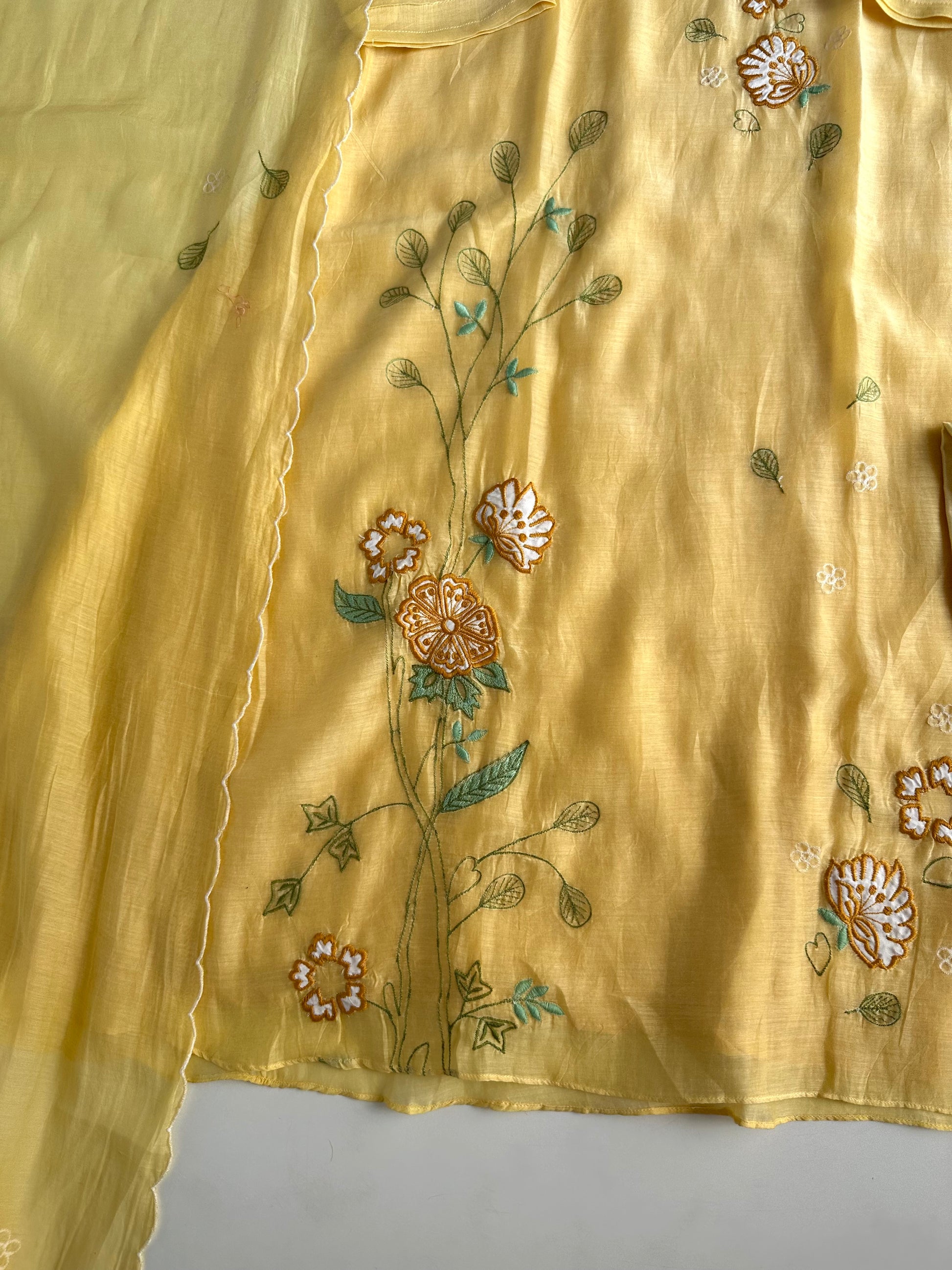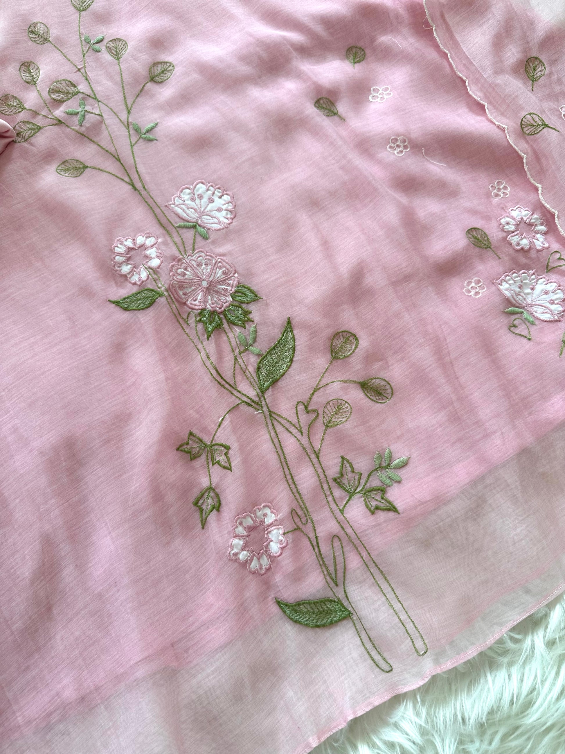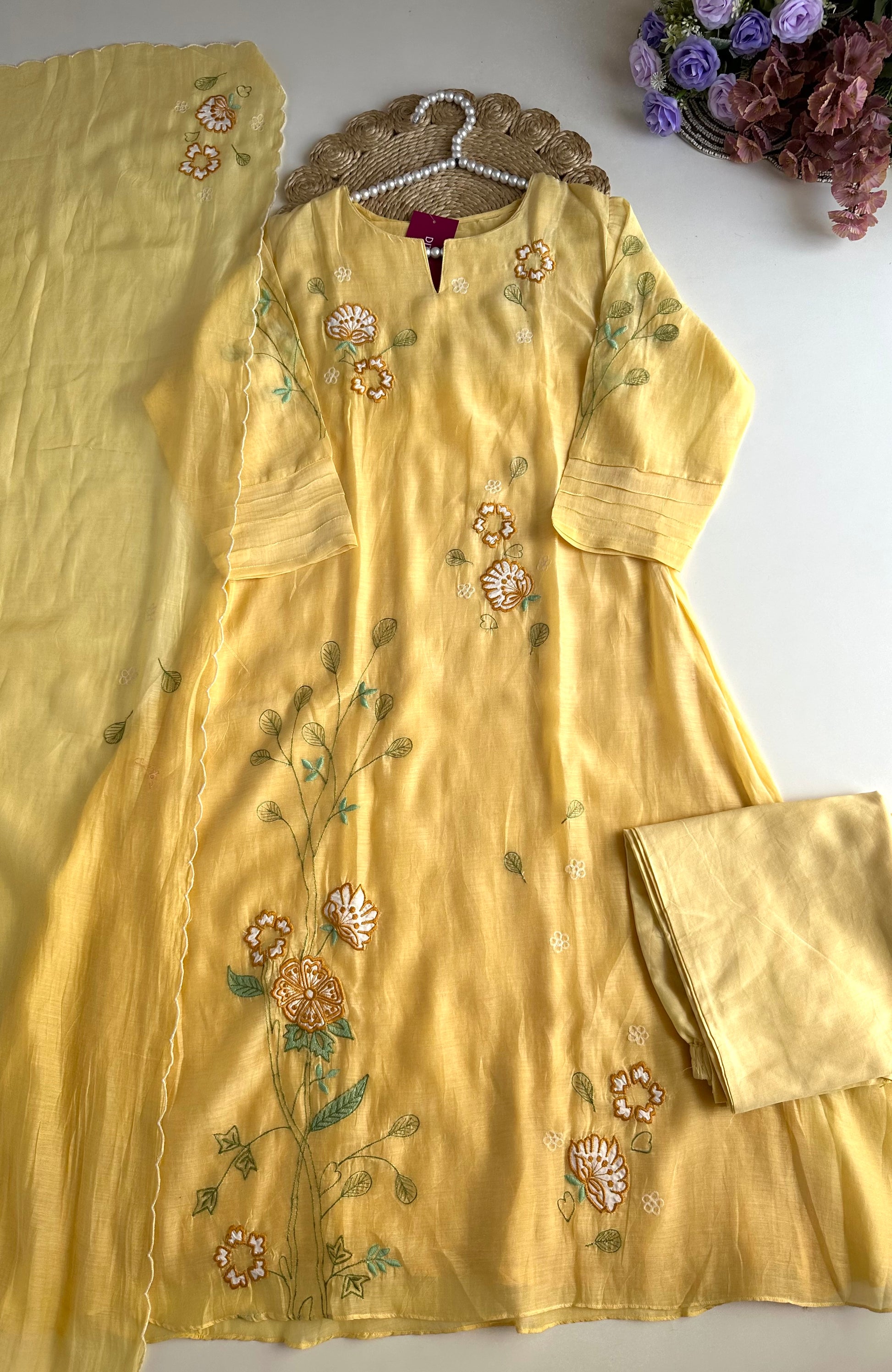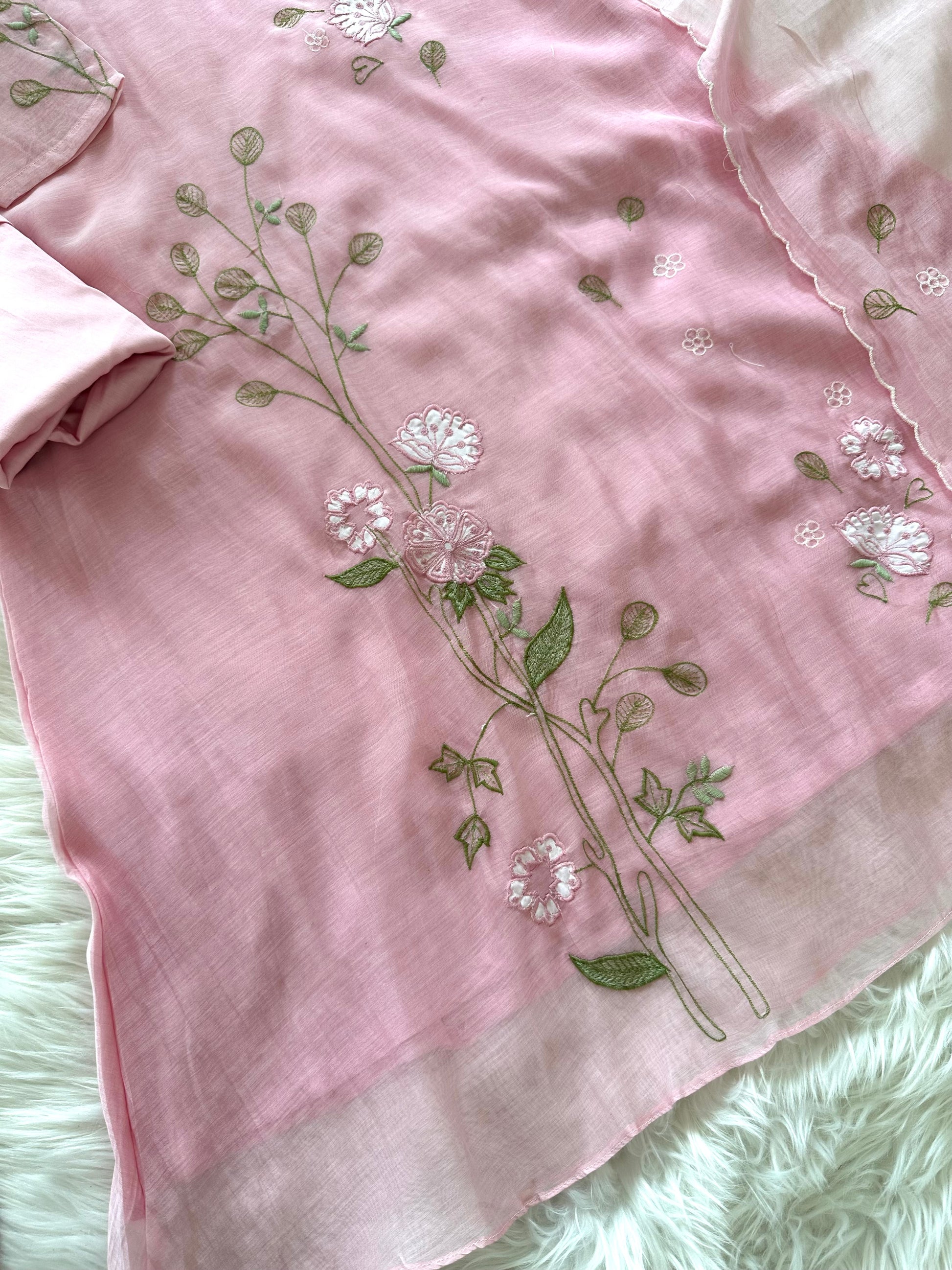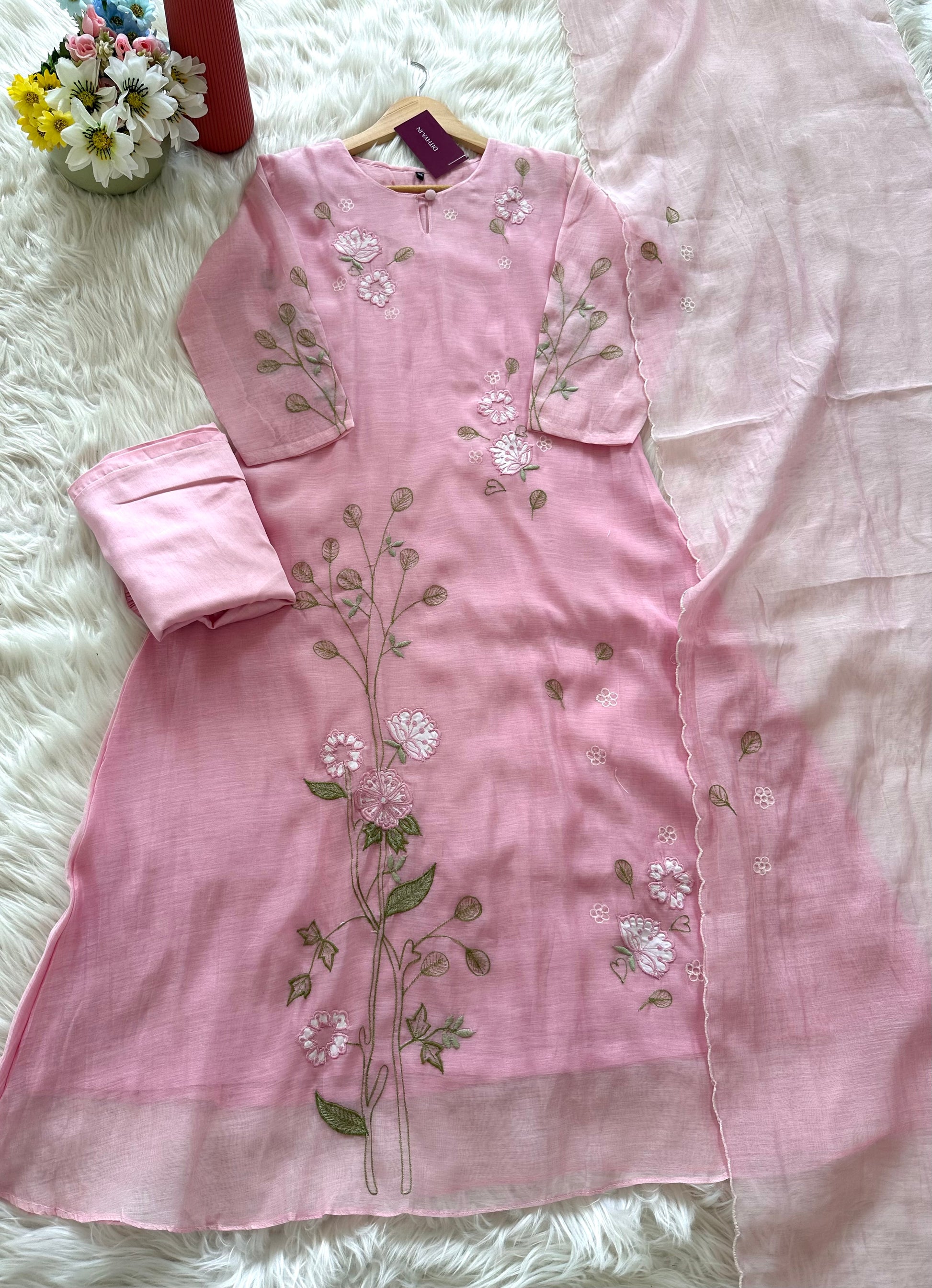 K086 - Mul Chanderi Appliqué work Aline Kurti with pants and dupatta