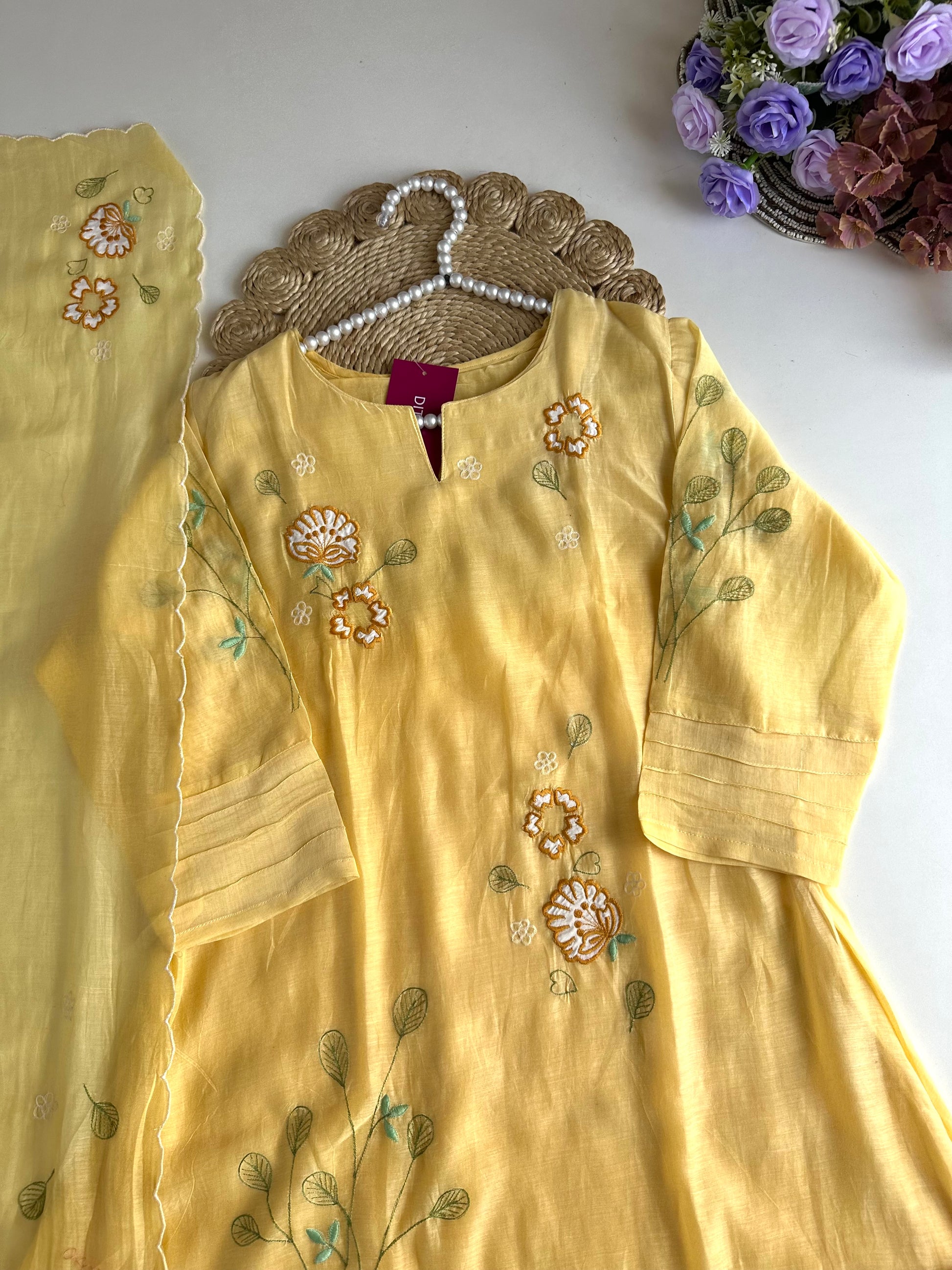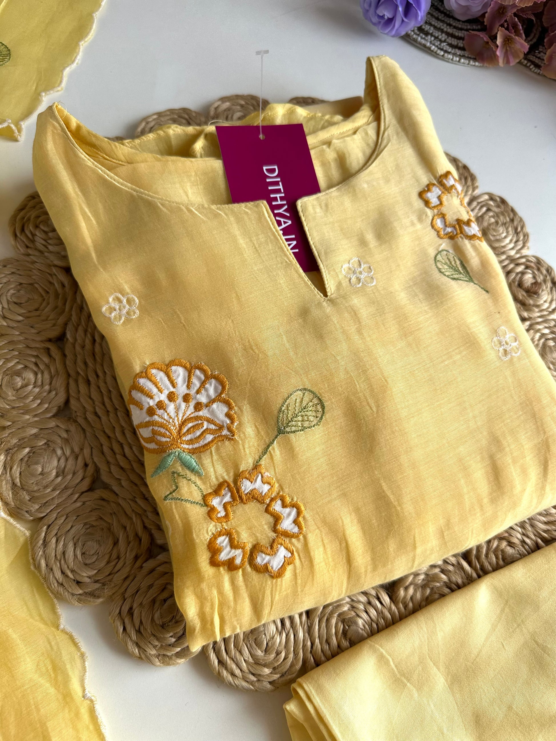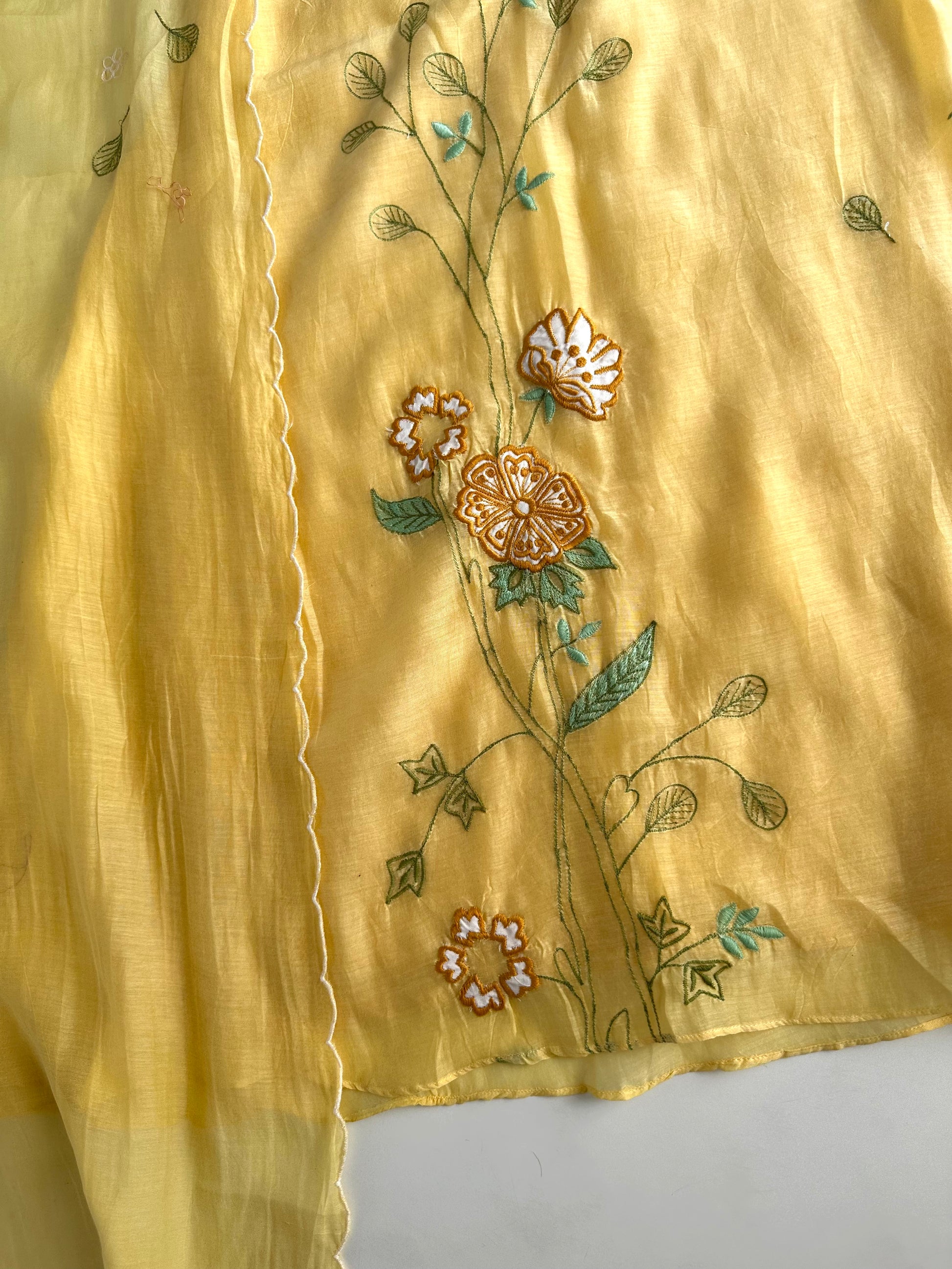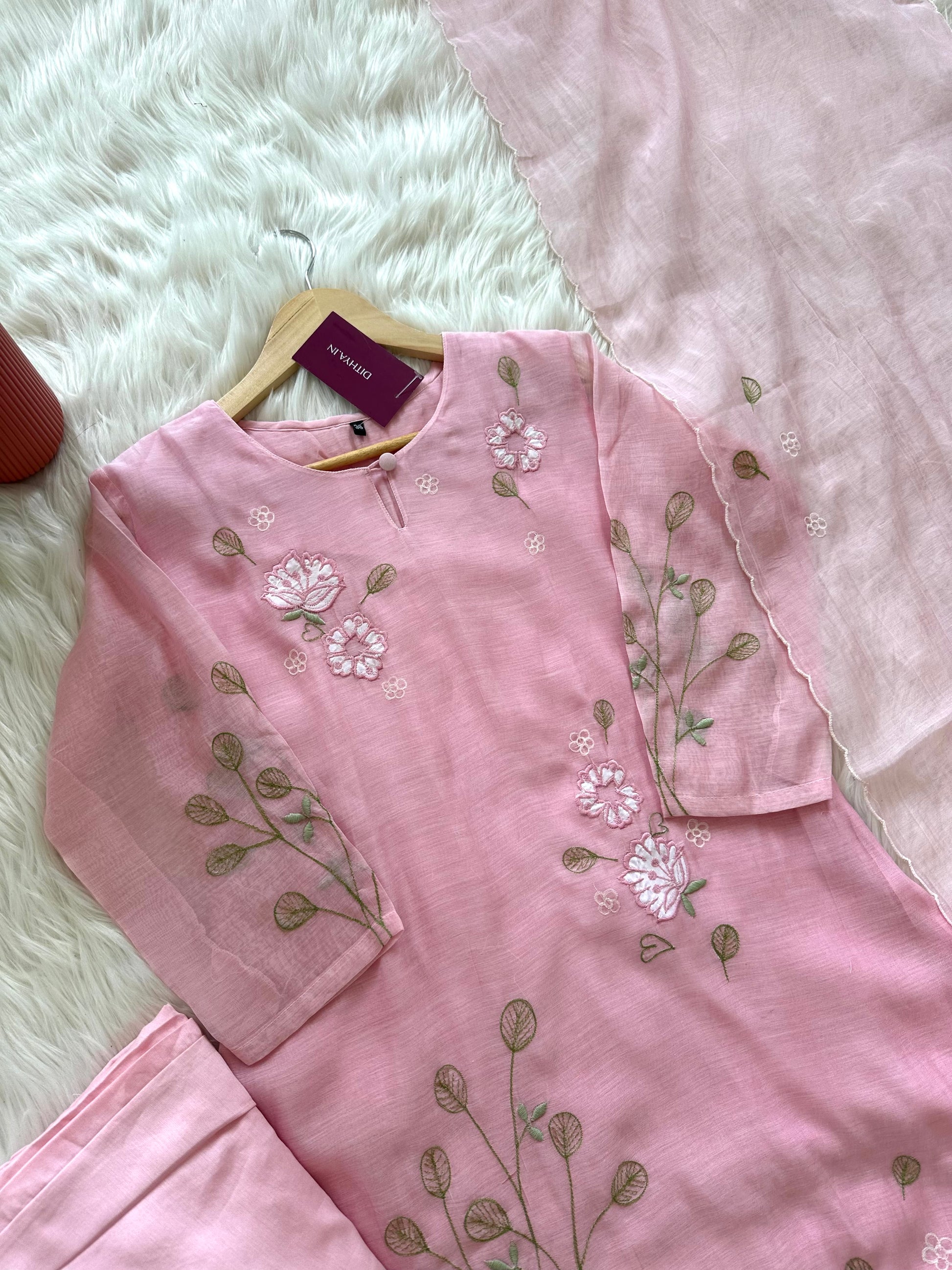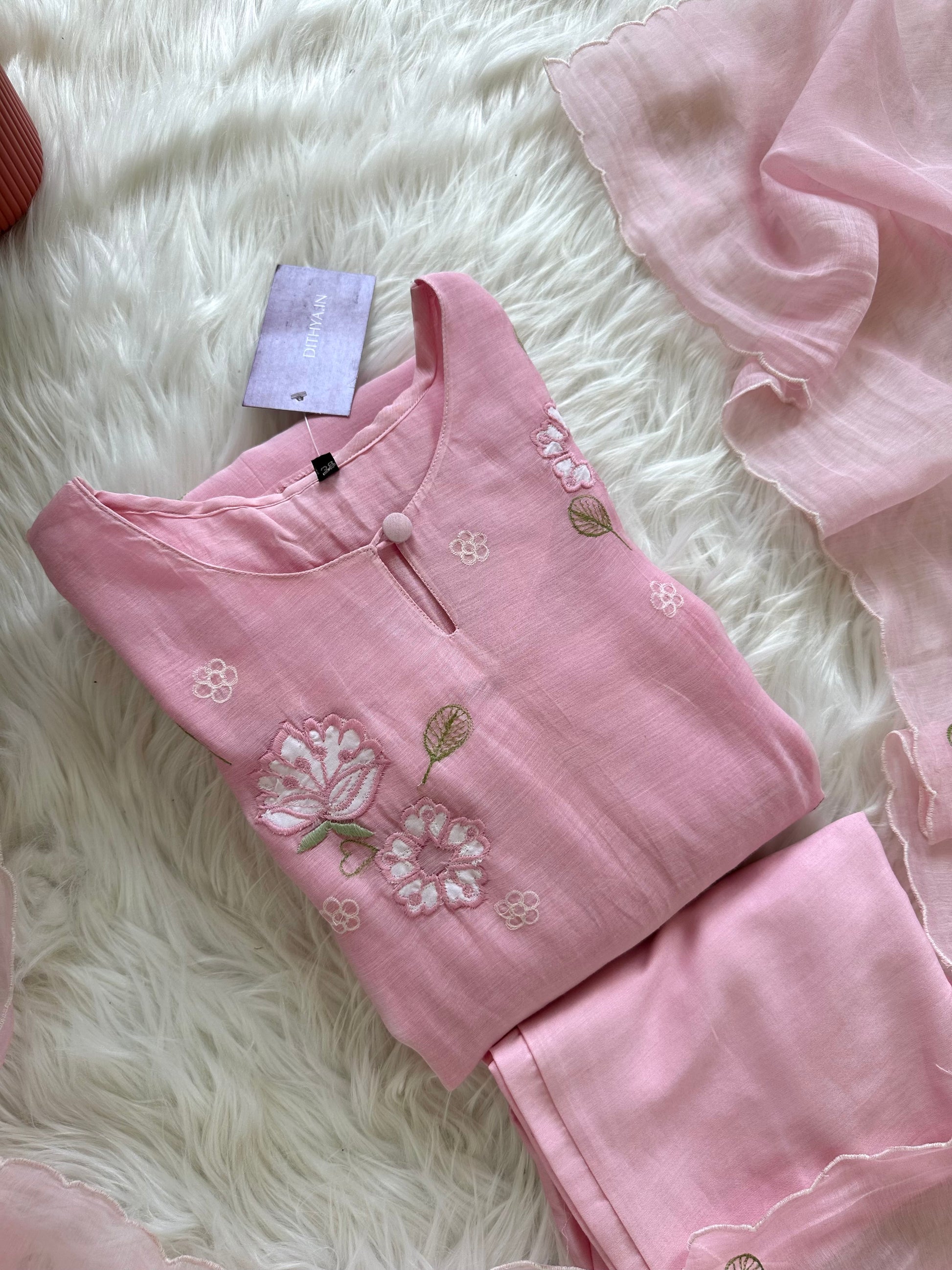 K086 - Mul Chanderi Appliqué work Aline Kurti with pants and dupatta