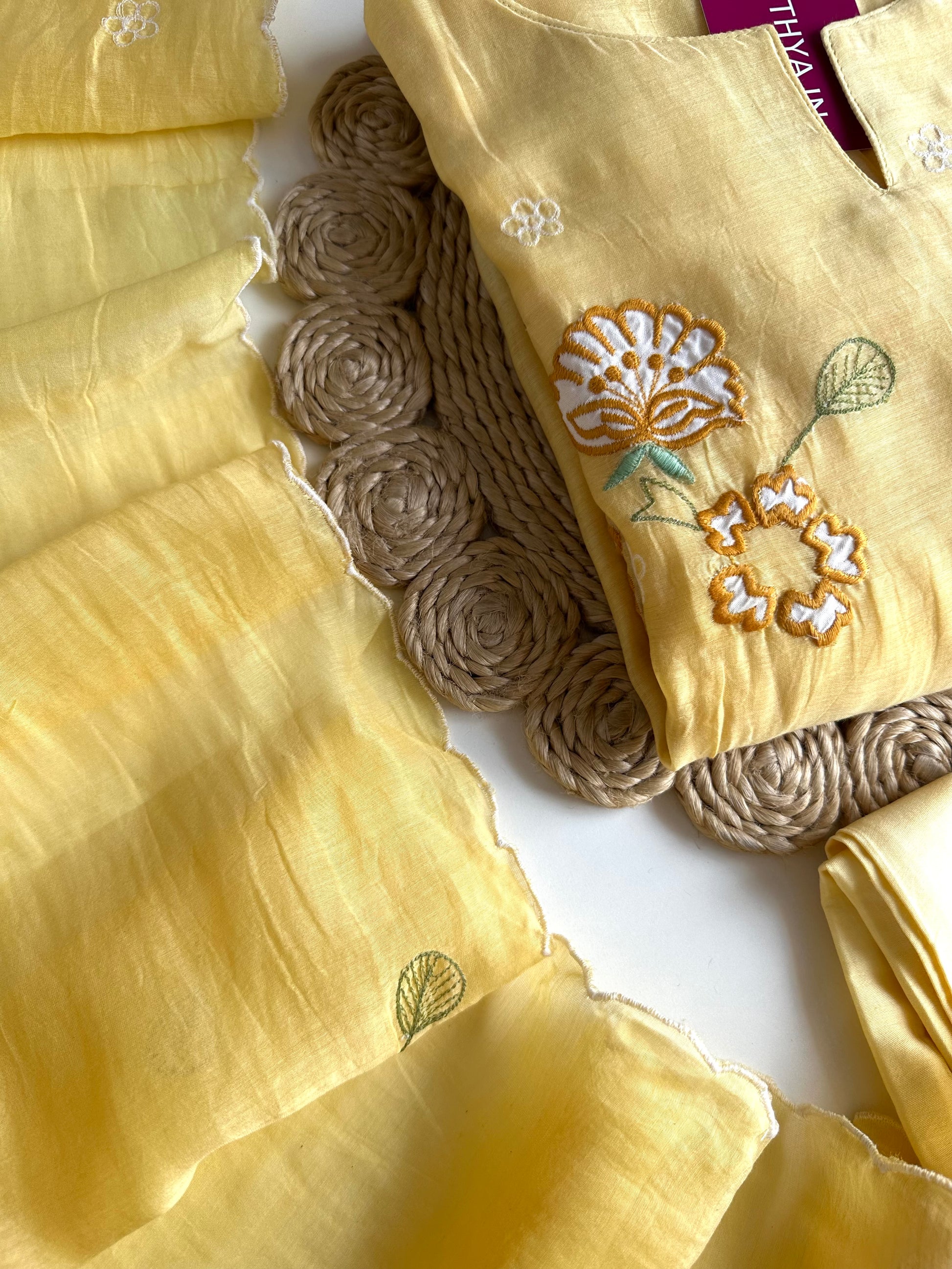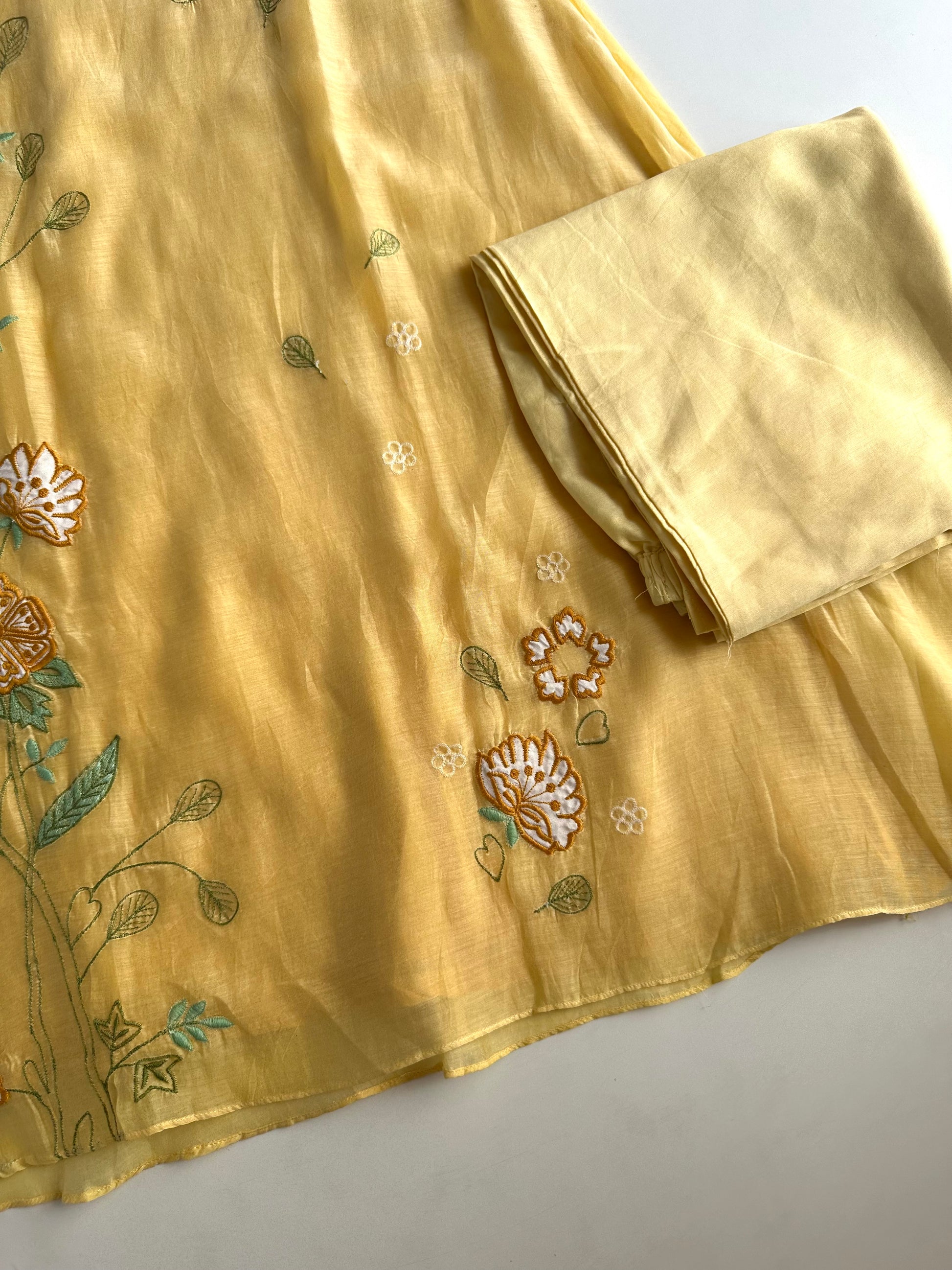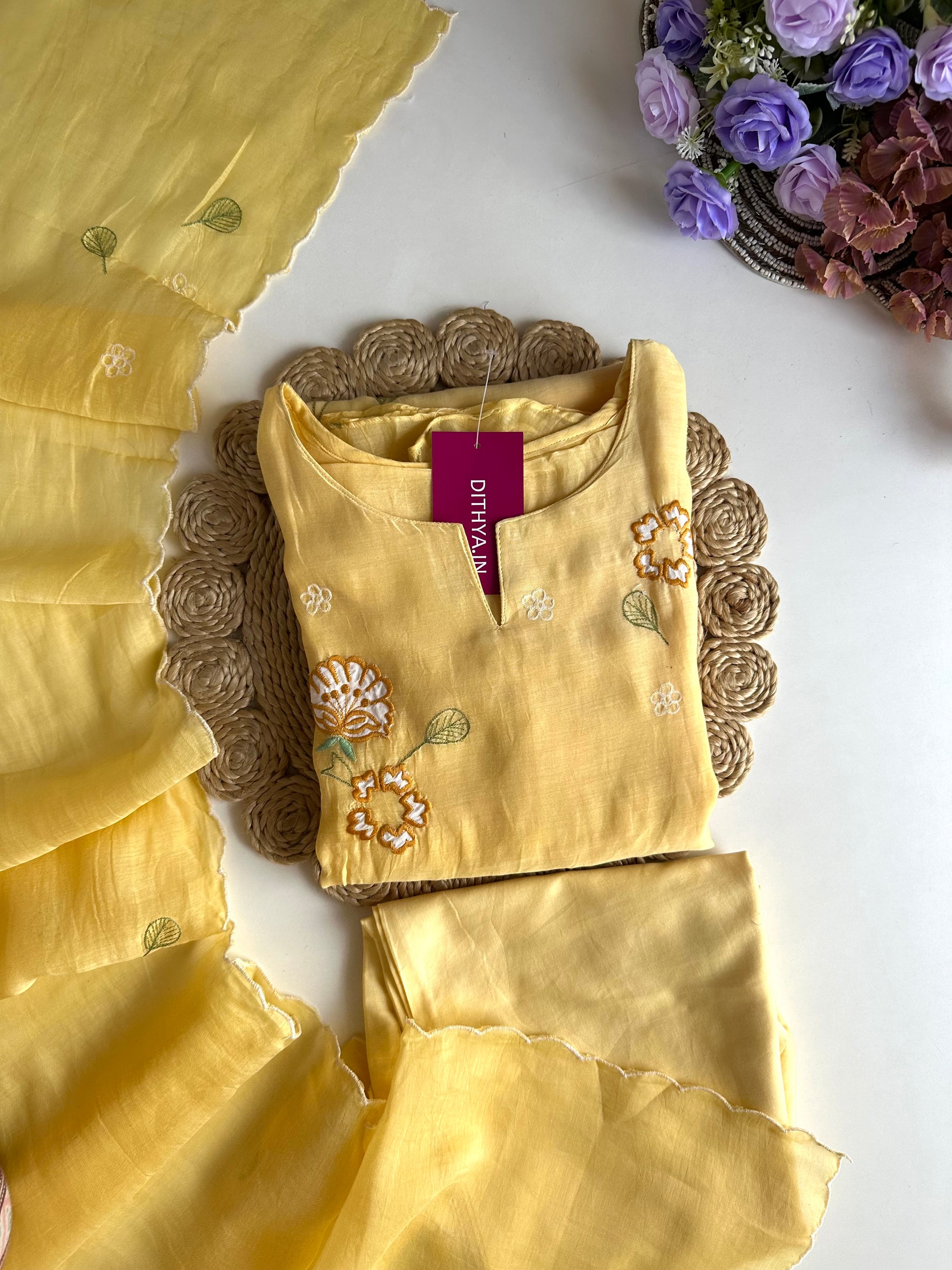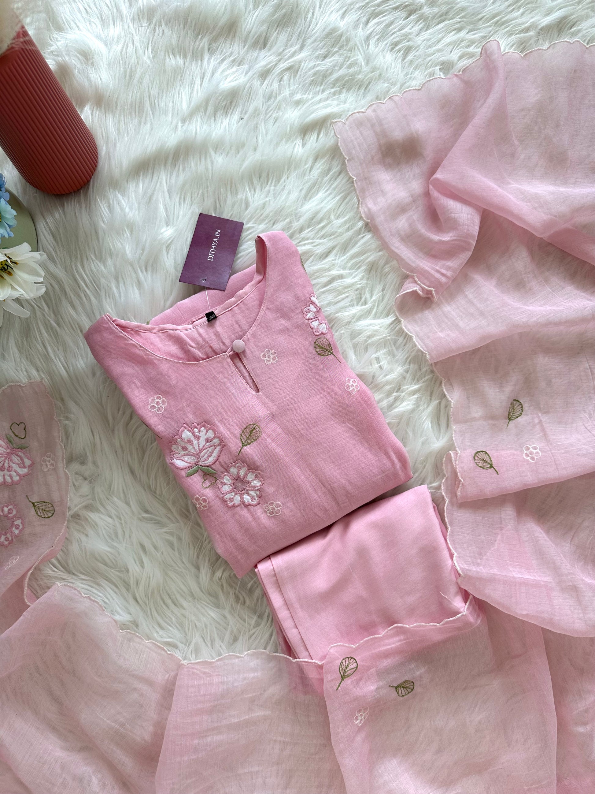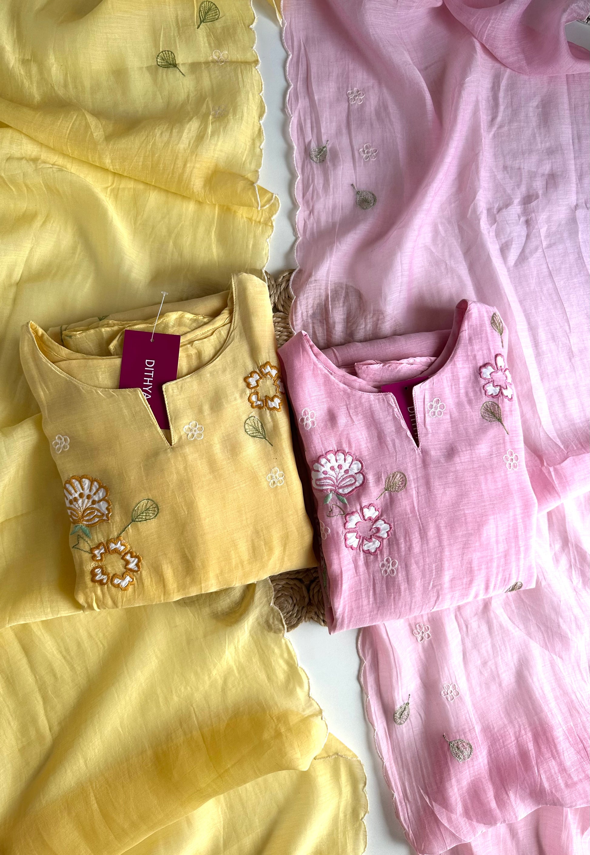 K086 - Mul Chanderi Appliqué work Aline Kurti with pants and dupatta