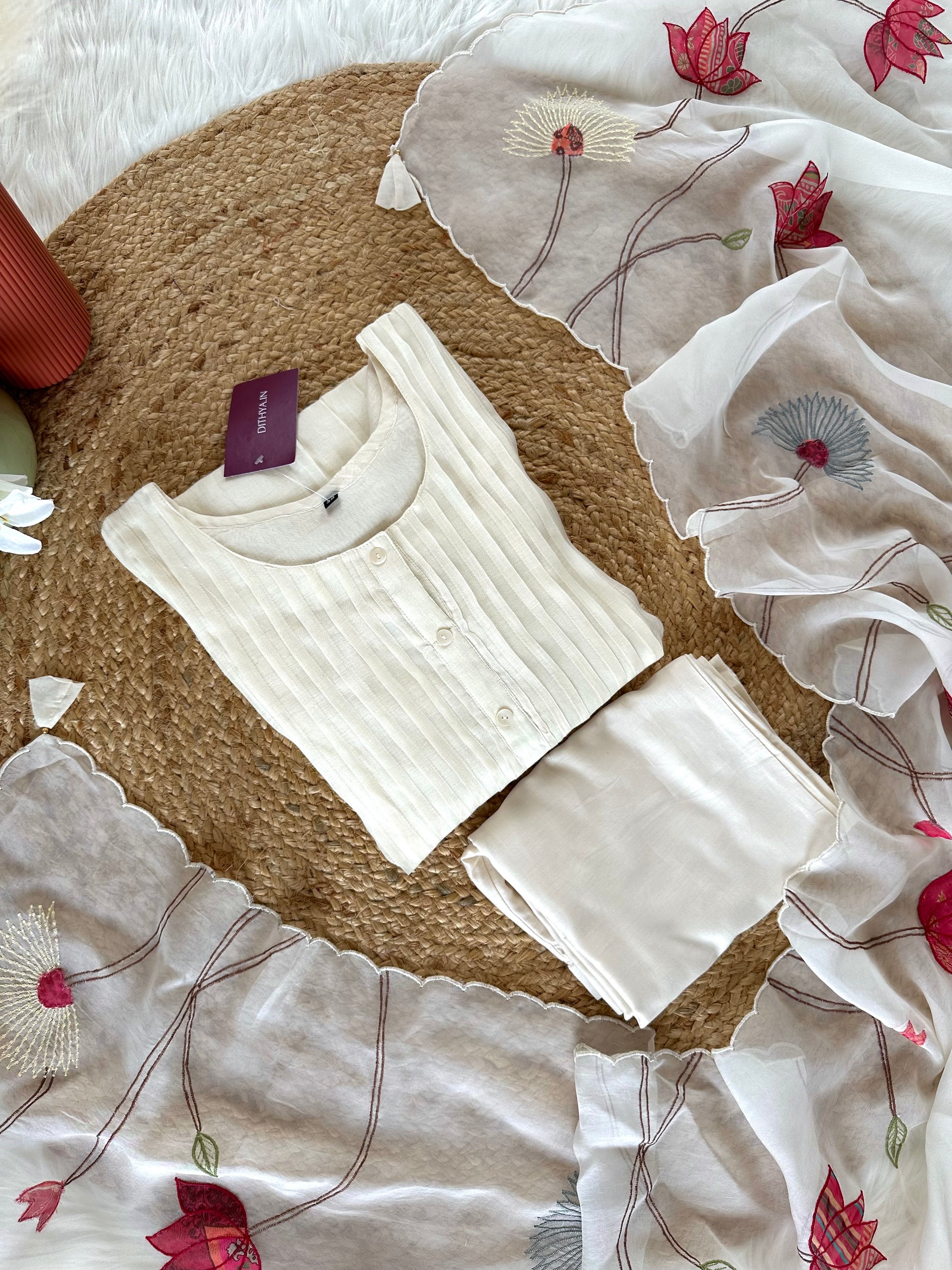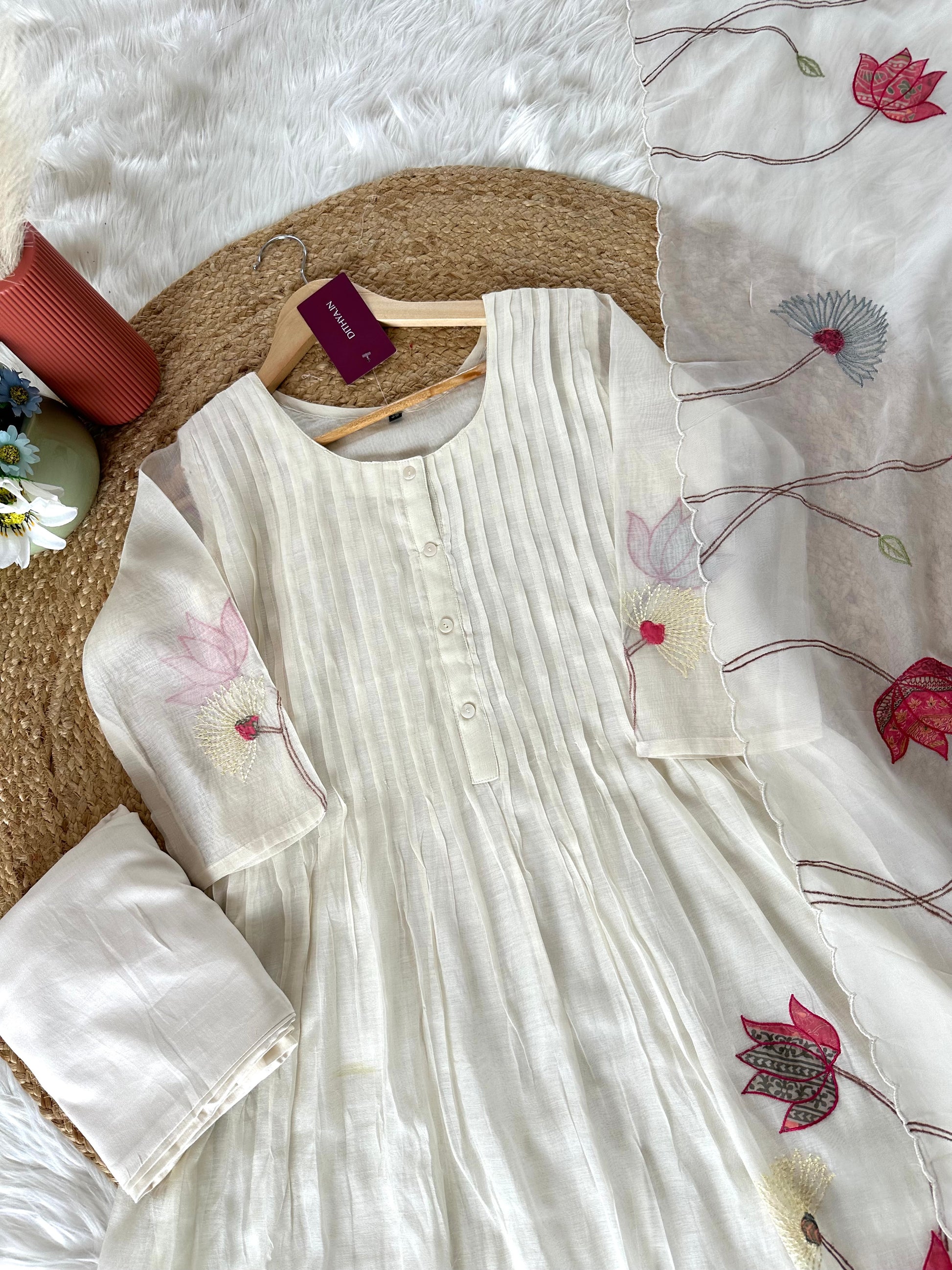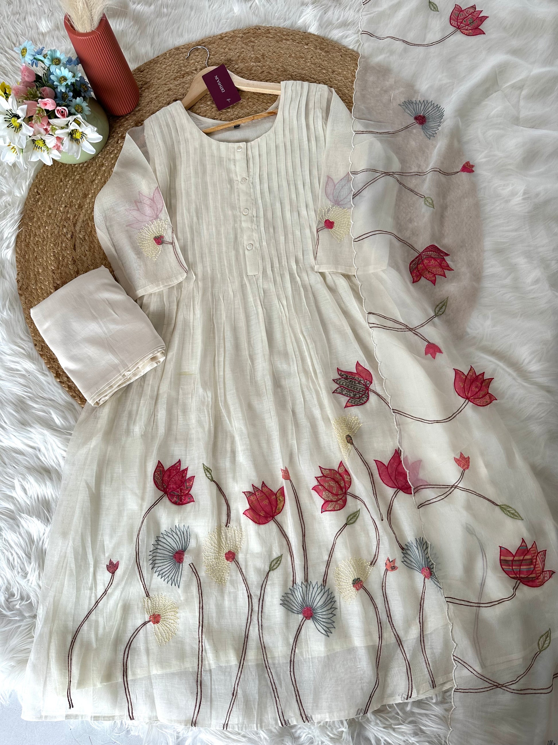K304 - Mul Chanderi appliqué work Aline Kurti with pants and dupatta in 2 colours