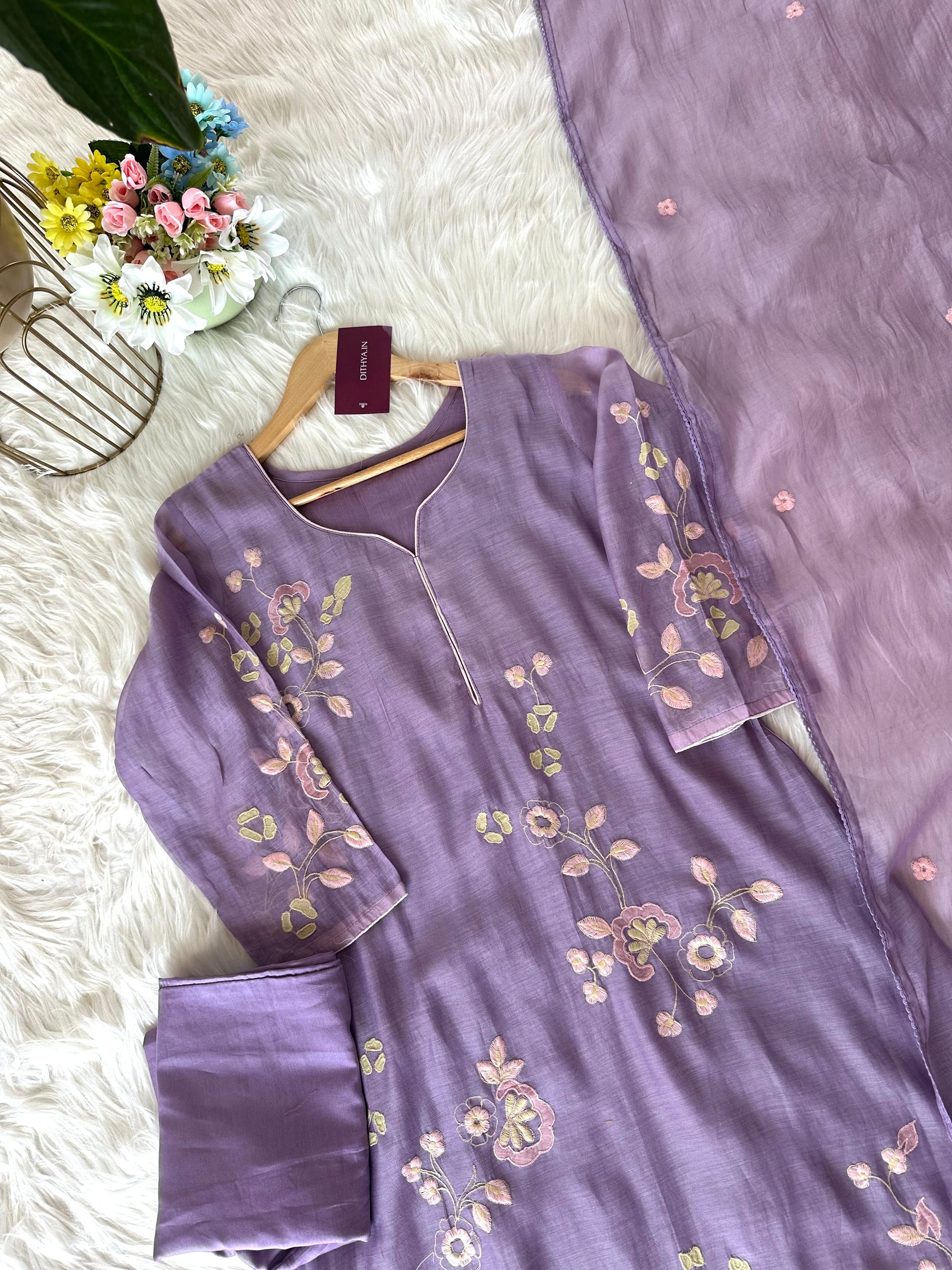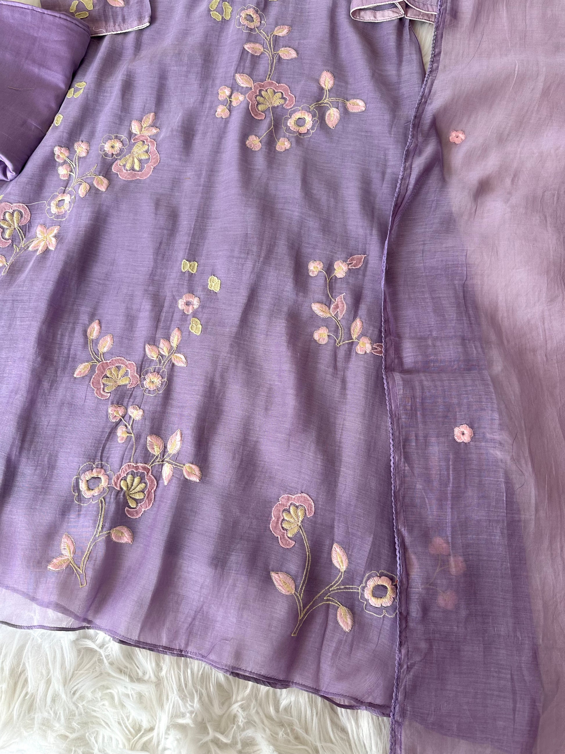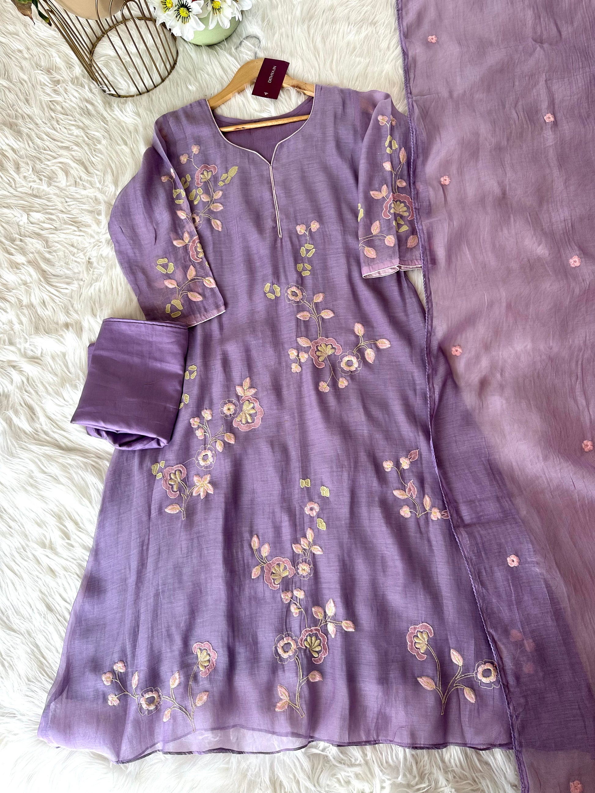 K337 - Mul Chanderi Appliqué work Anarkali with pants and dupatta
