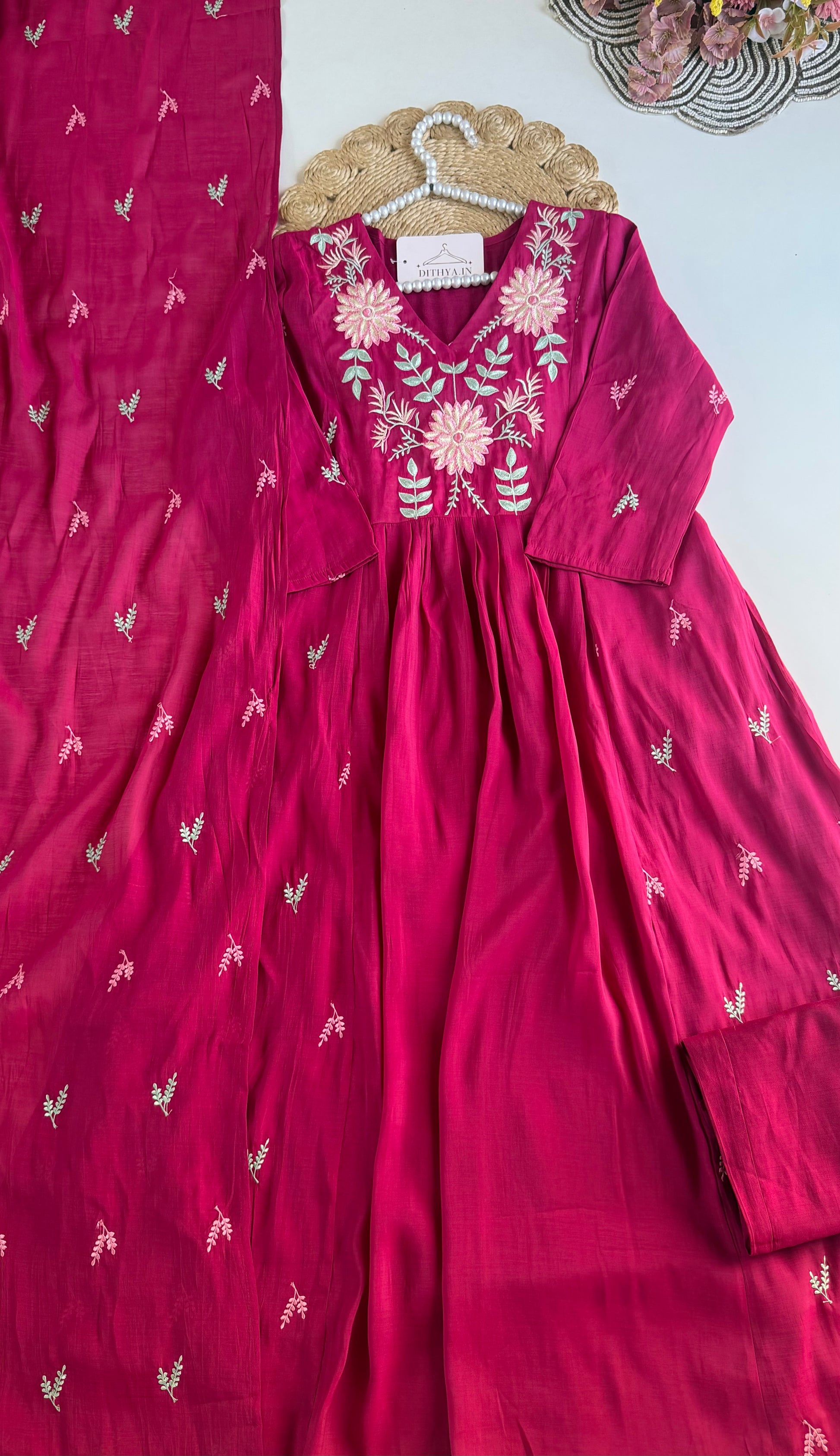 K477 - Mul chanderi appliqué work embroidered Anarkali with pants and dupatta