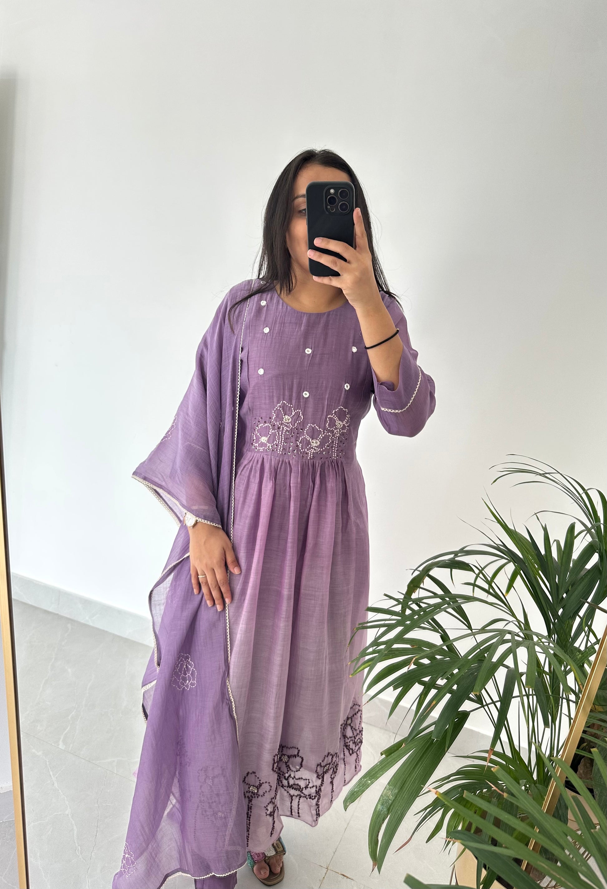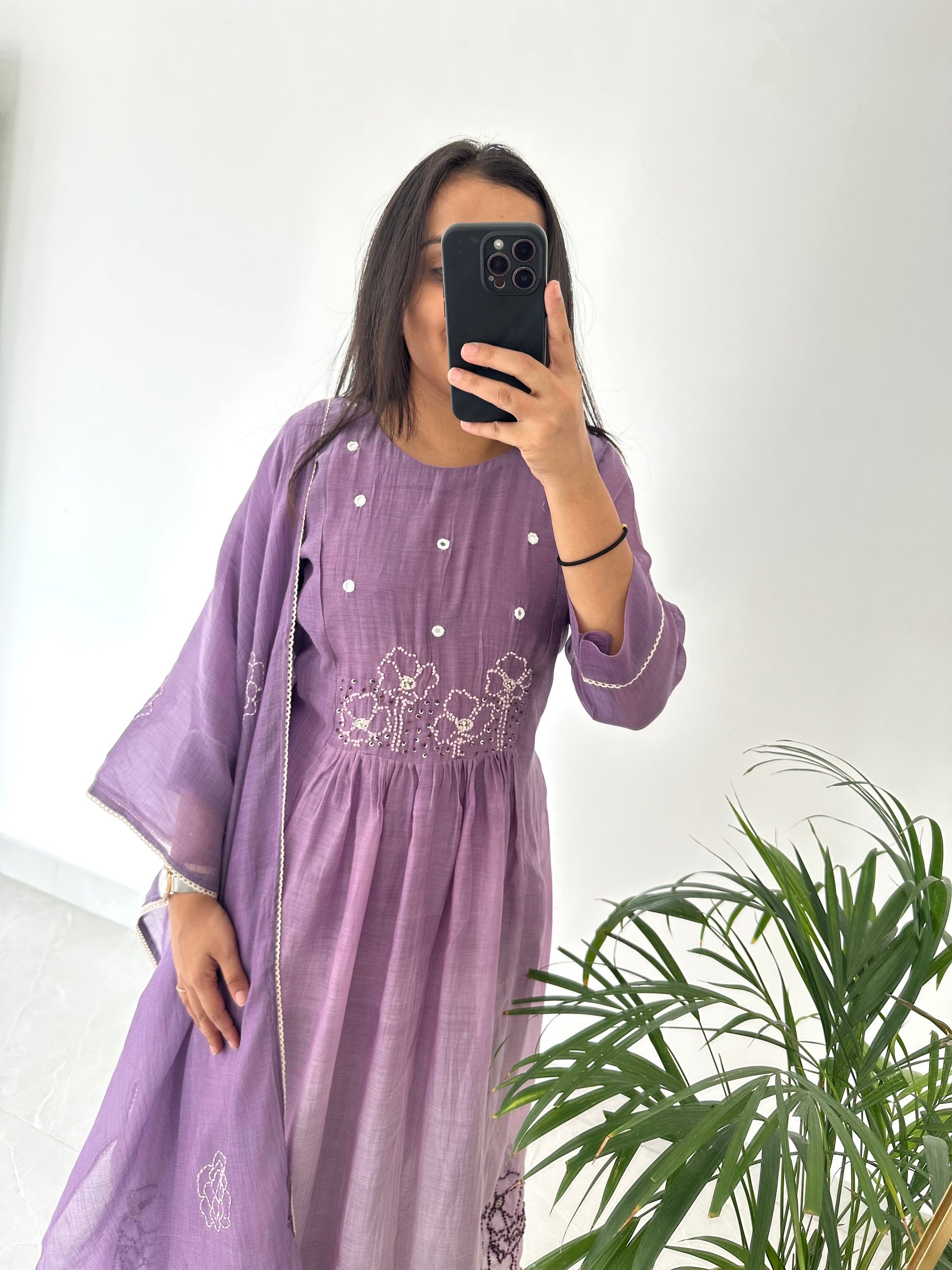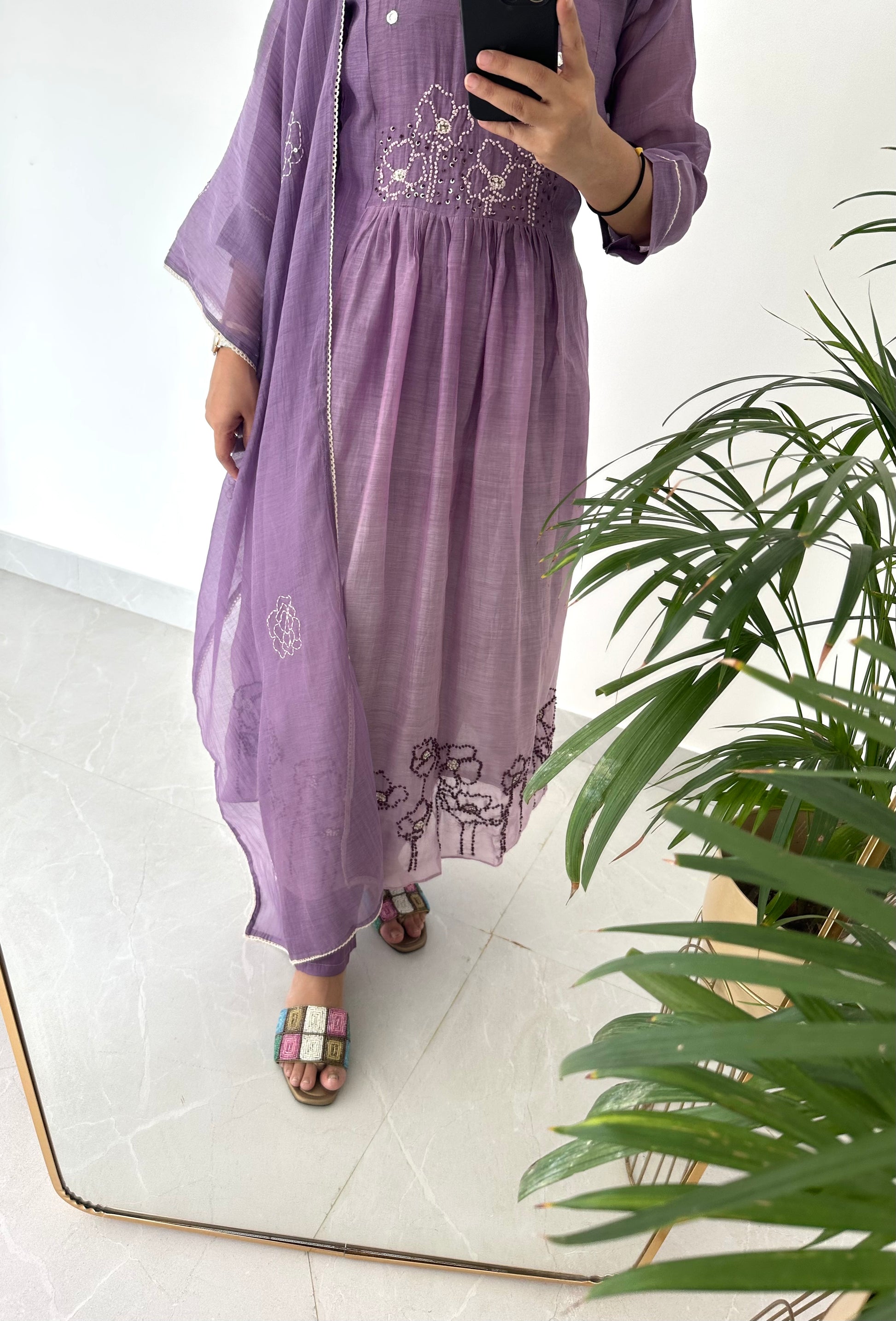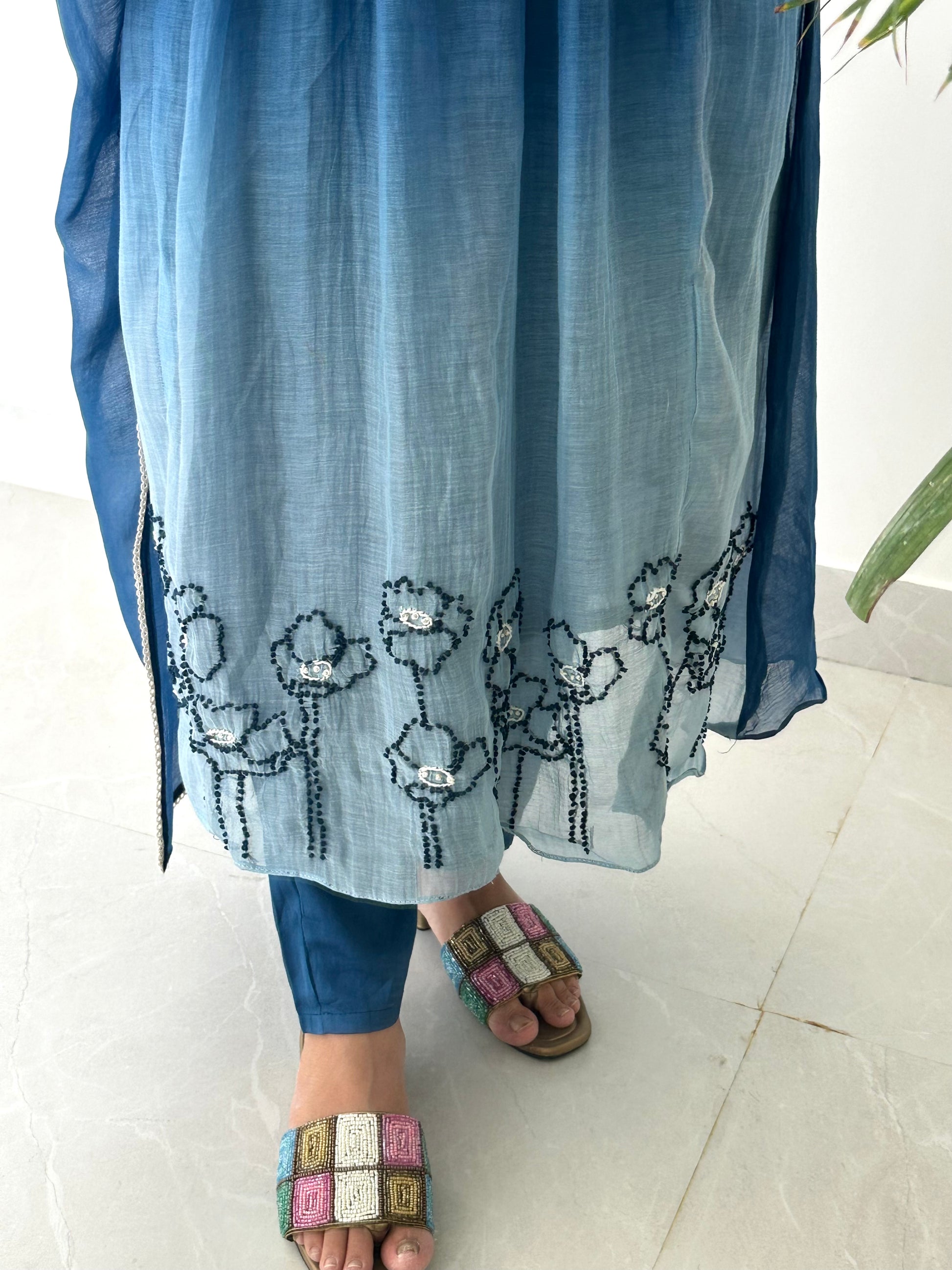 K226 - Mul Chanderi embroidered Aline Kurti with pants and dupatta
