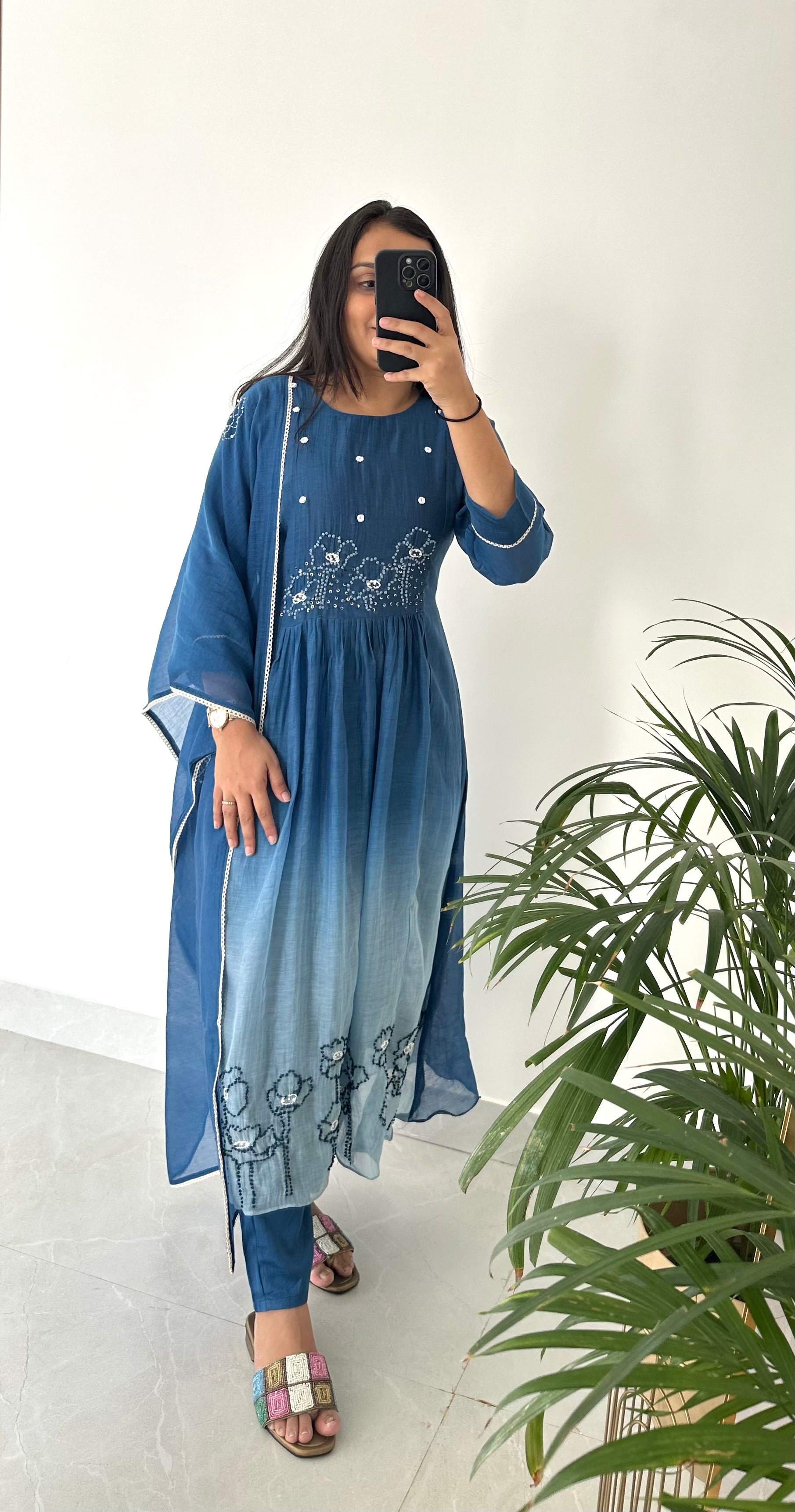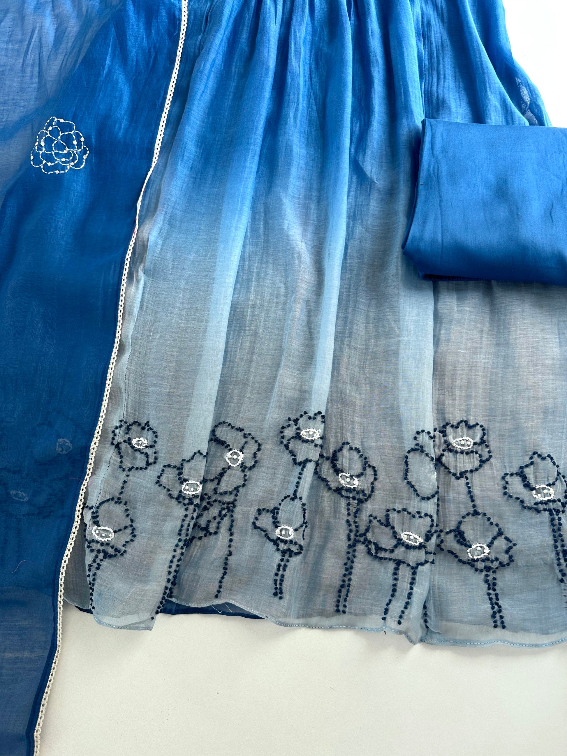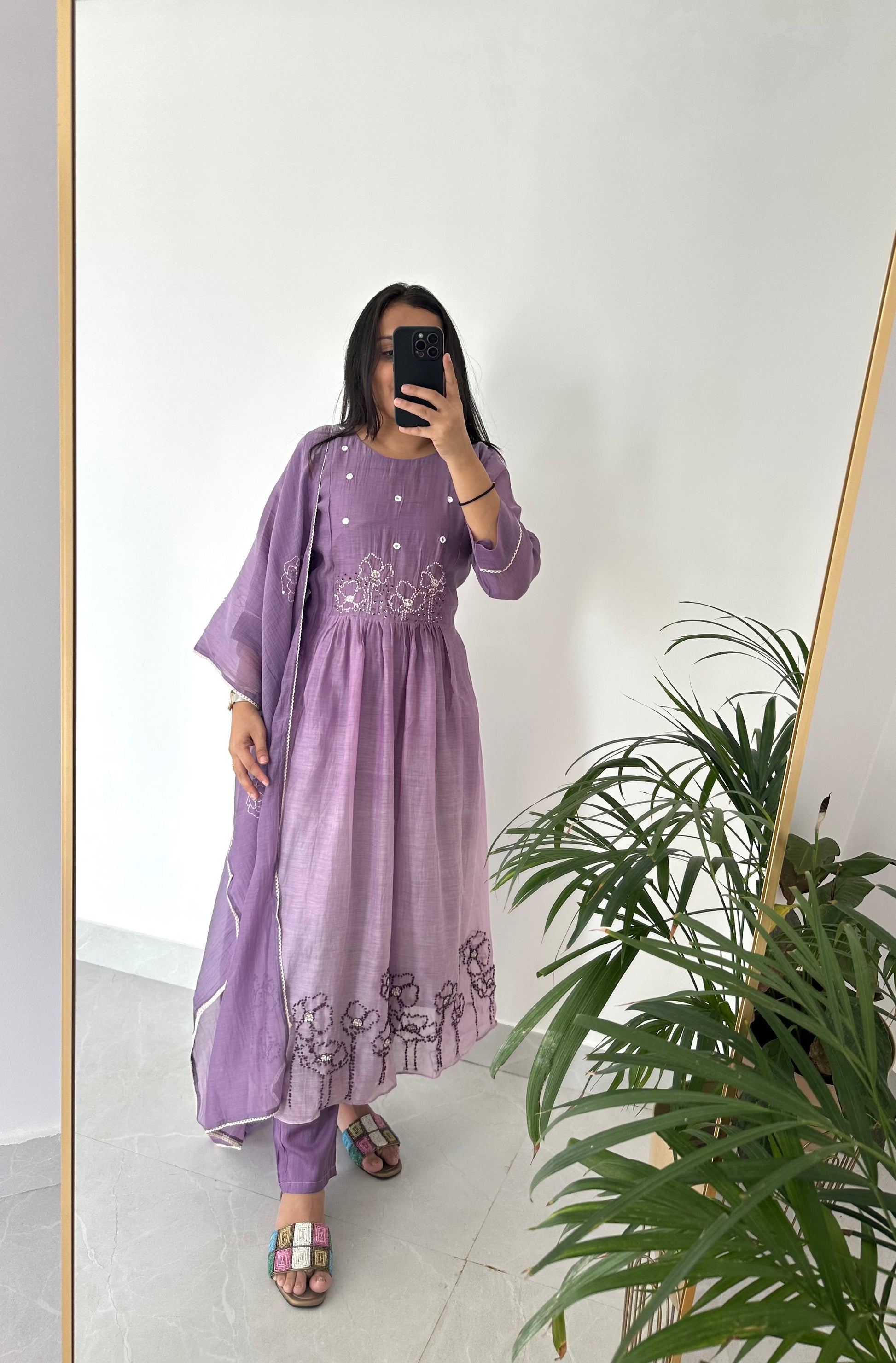 K226 - Mul Chanderi embroidered Aline Kurti with pants and dupatta
