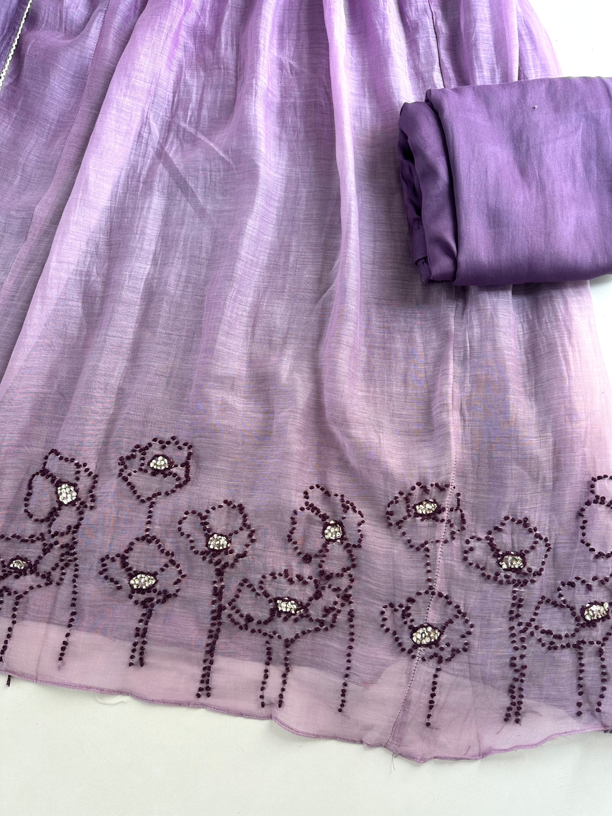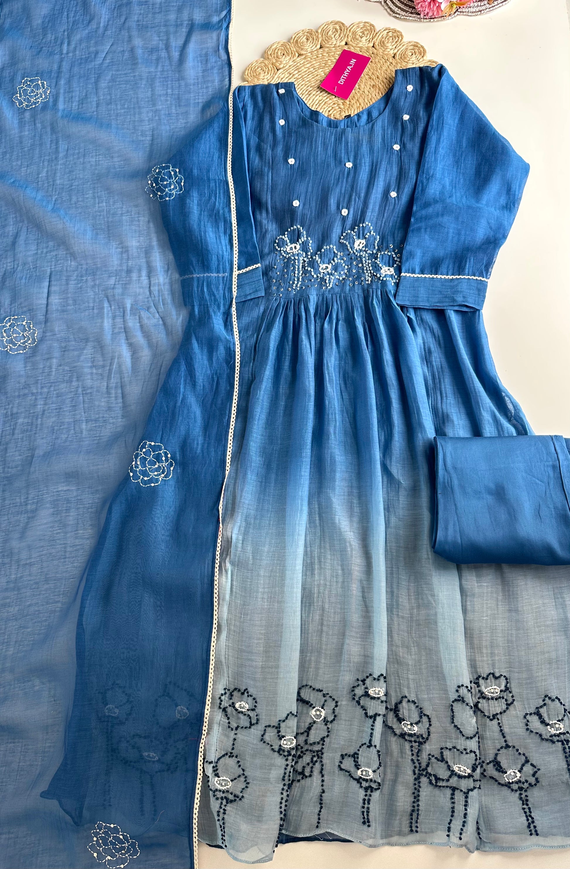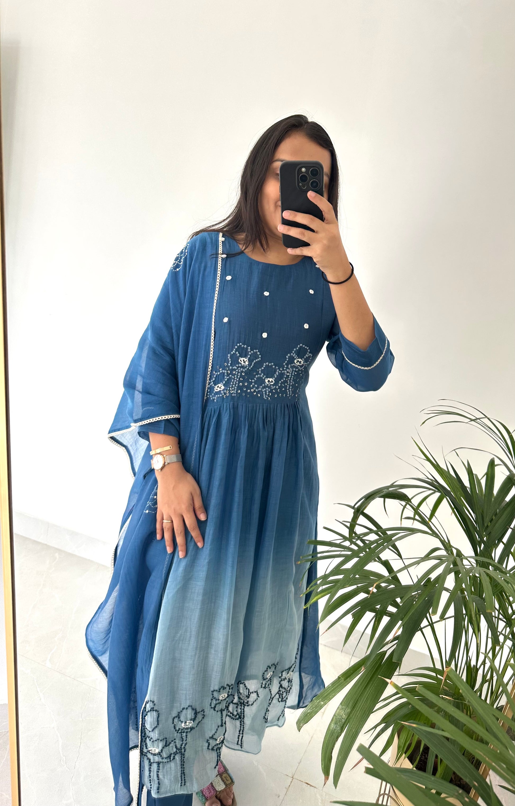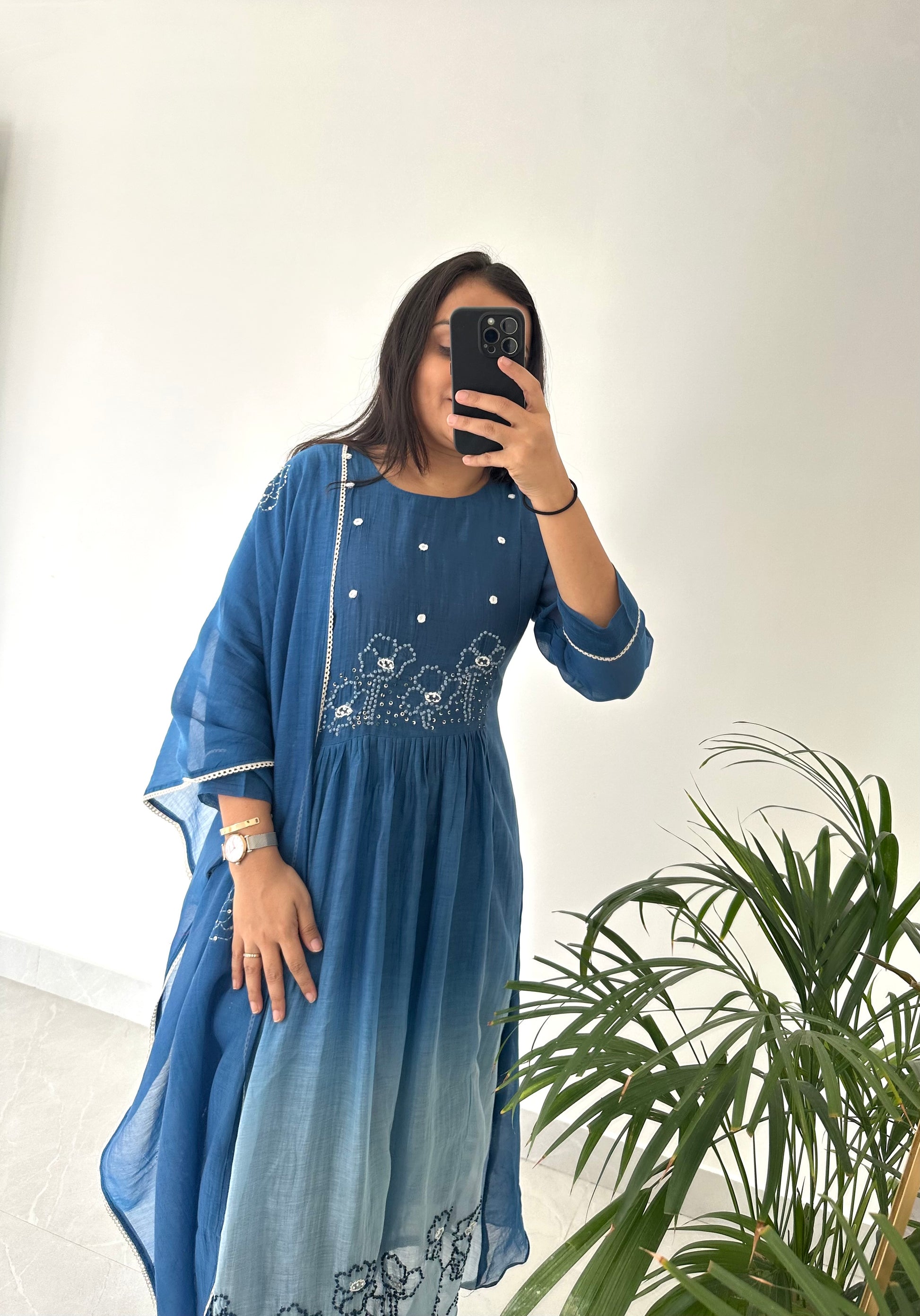 K226 - Mul Chanderi embroidered Aline Kurti with pants and dupatta