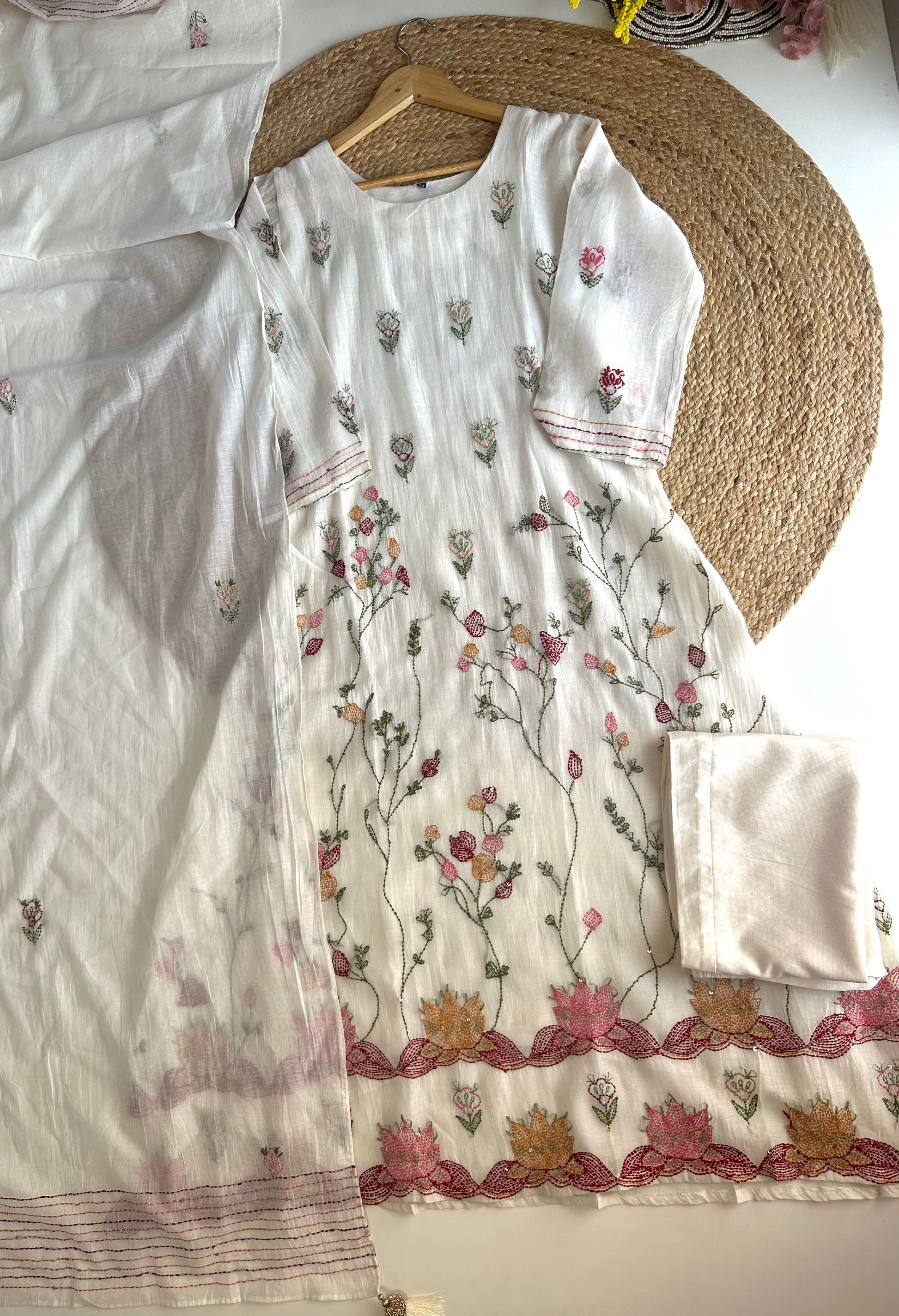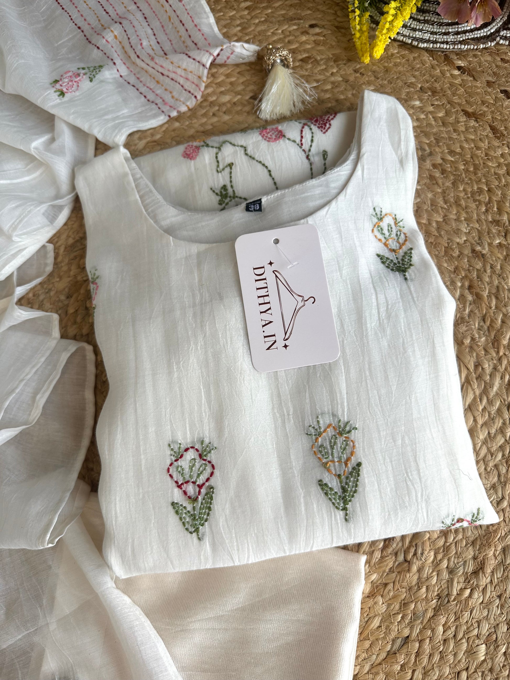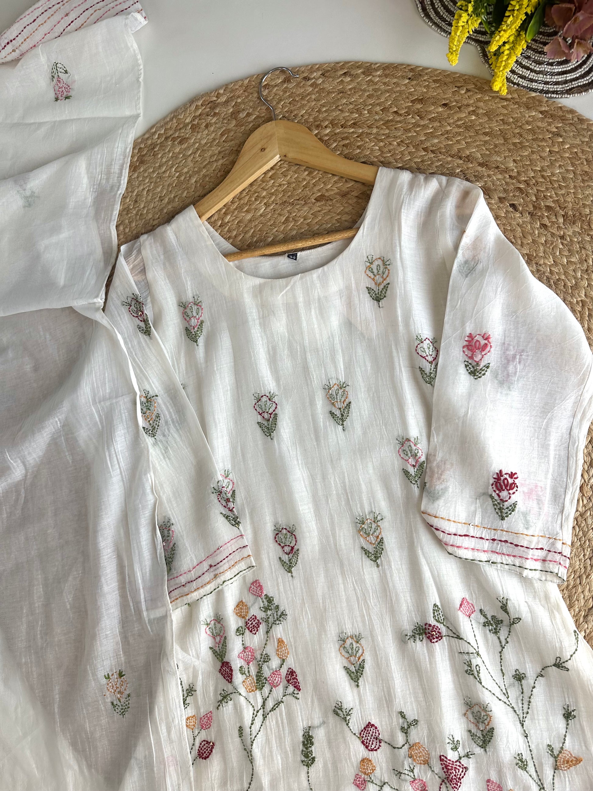 K463 - Mul Chanderi embroidered Aline Kurti with pants and dupatta
