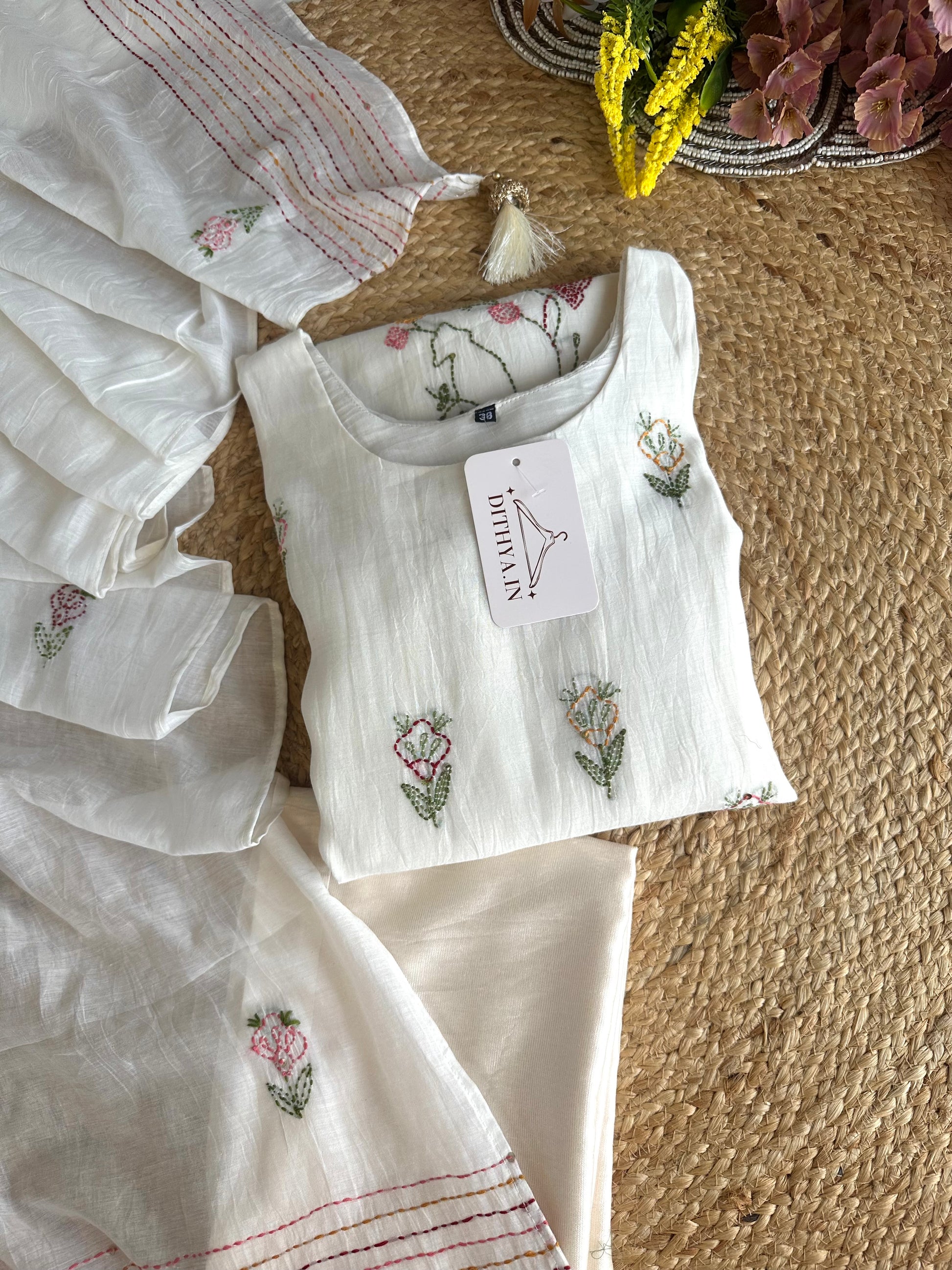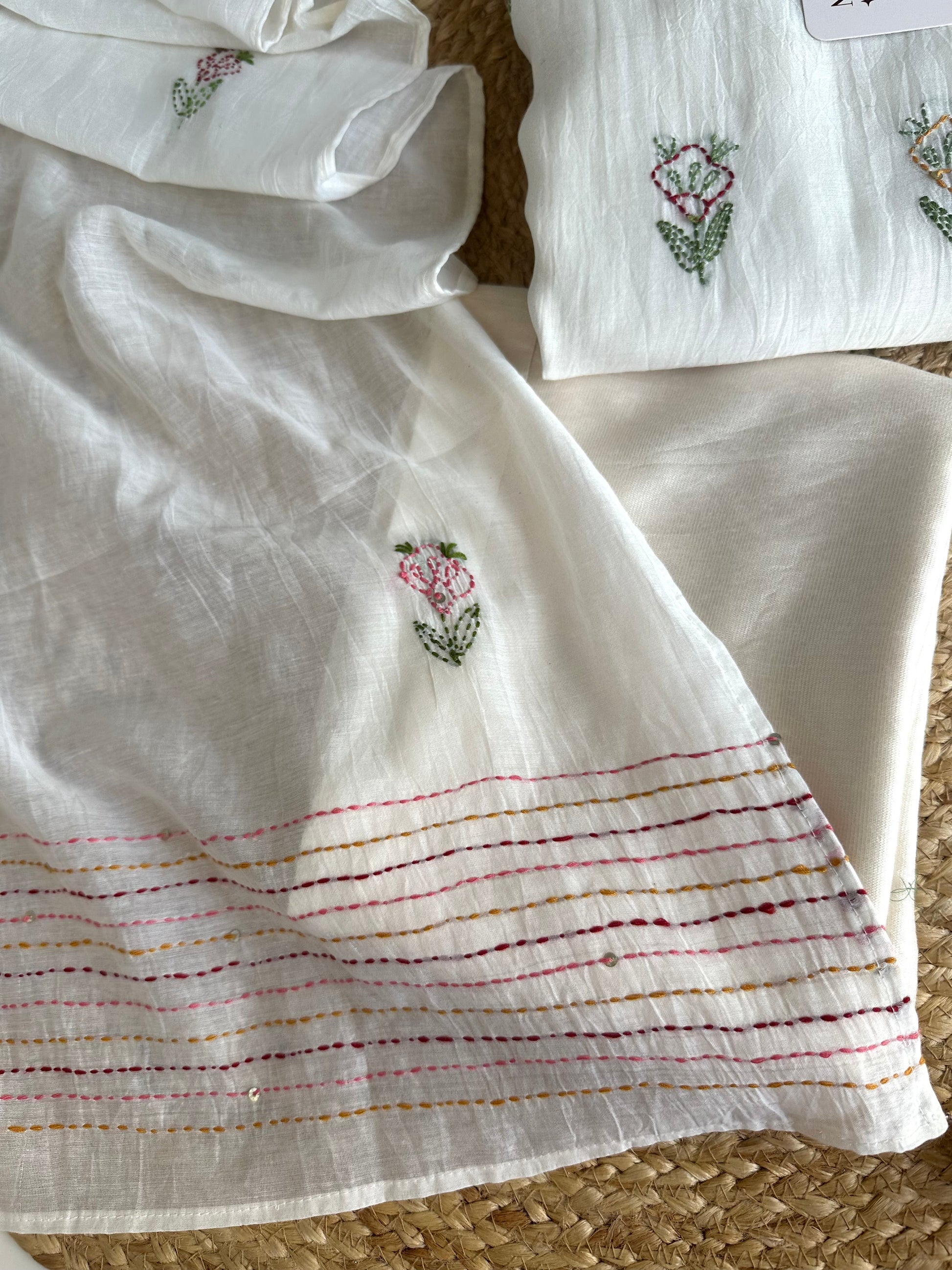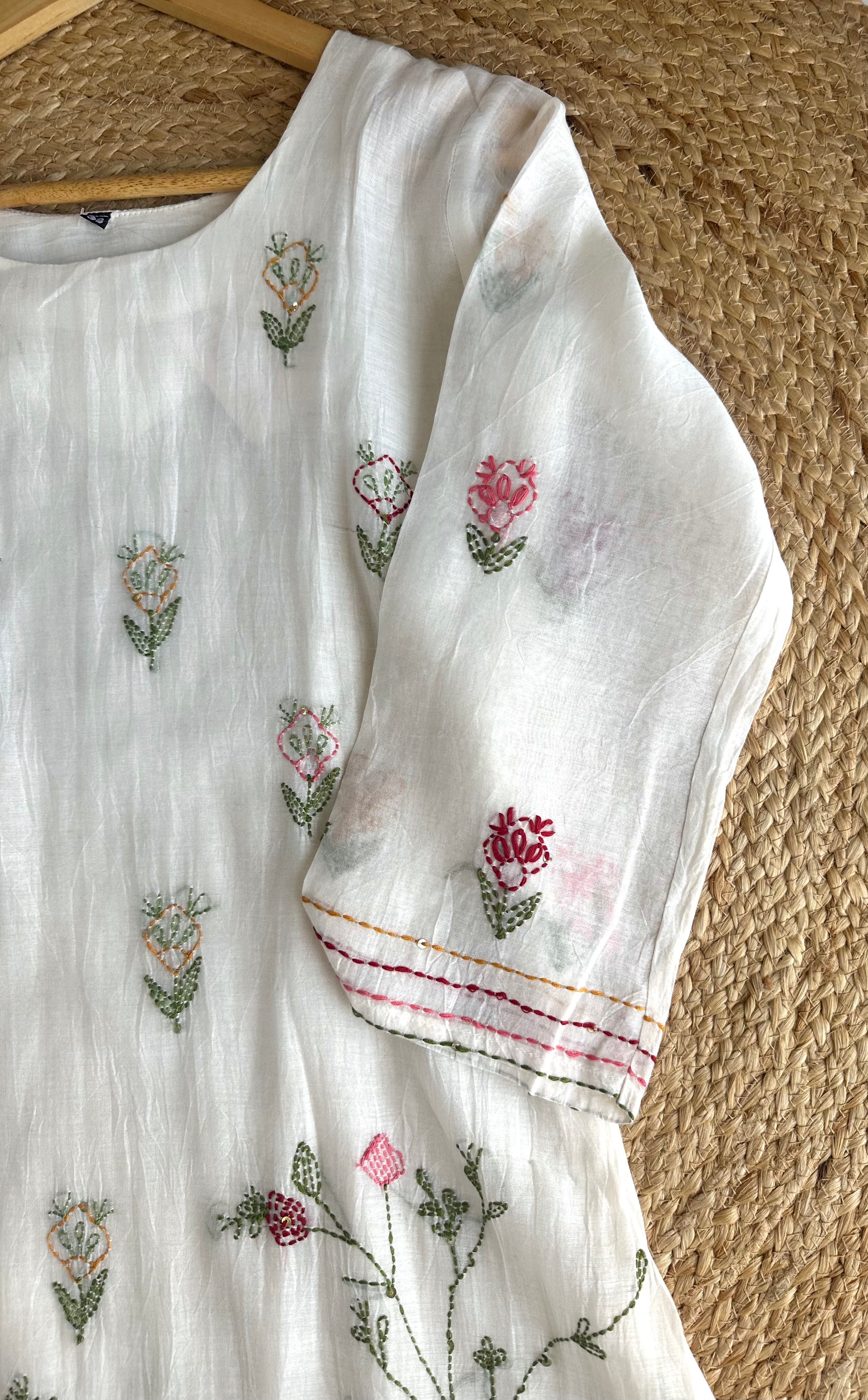 K463 - Mul Chanderi embroidered Aline Kurti with pants and dupatta