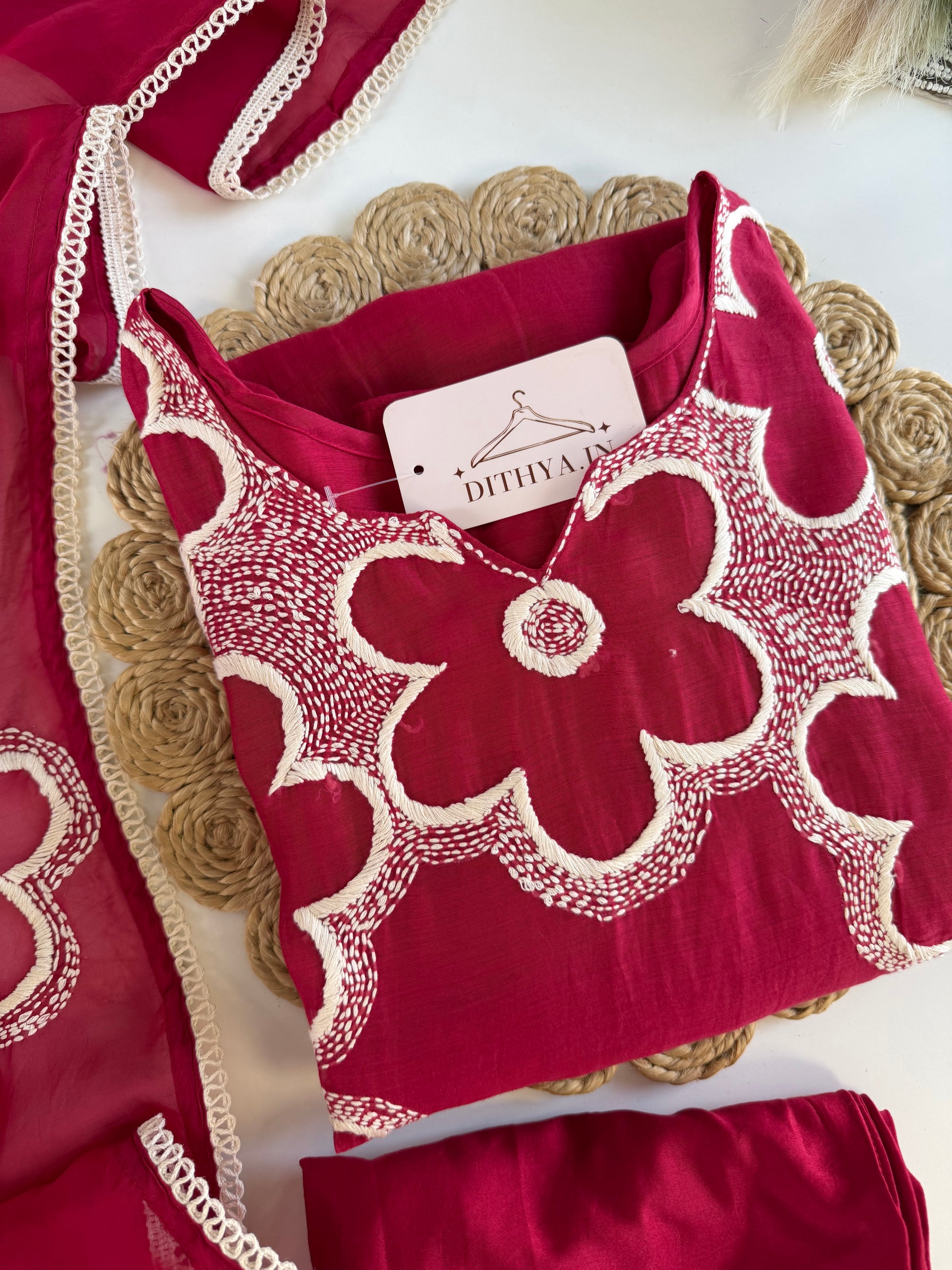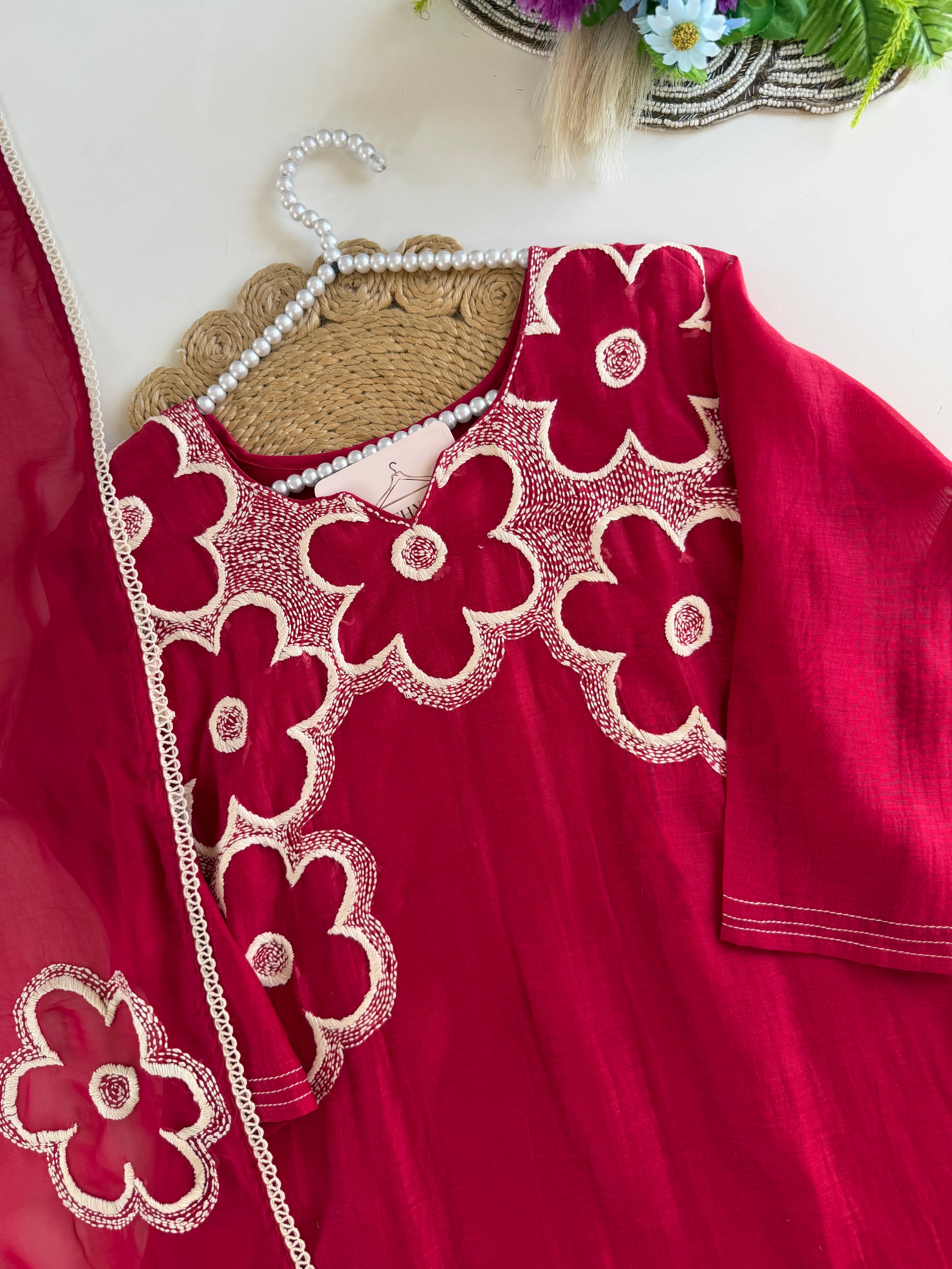 K609 - Mul chanderi embroidered Aline Kurti with pants and dupatta