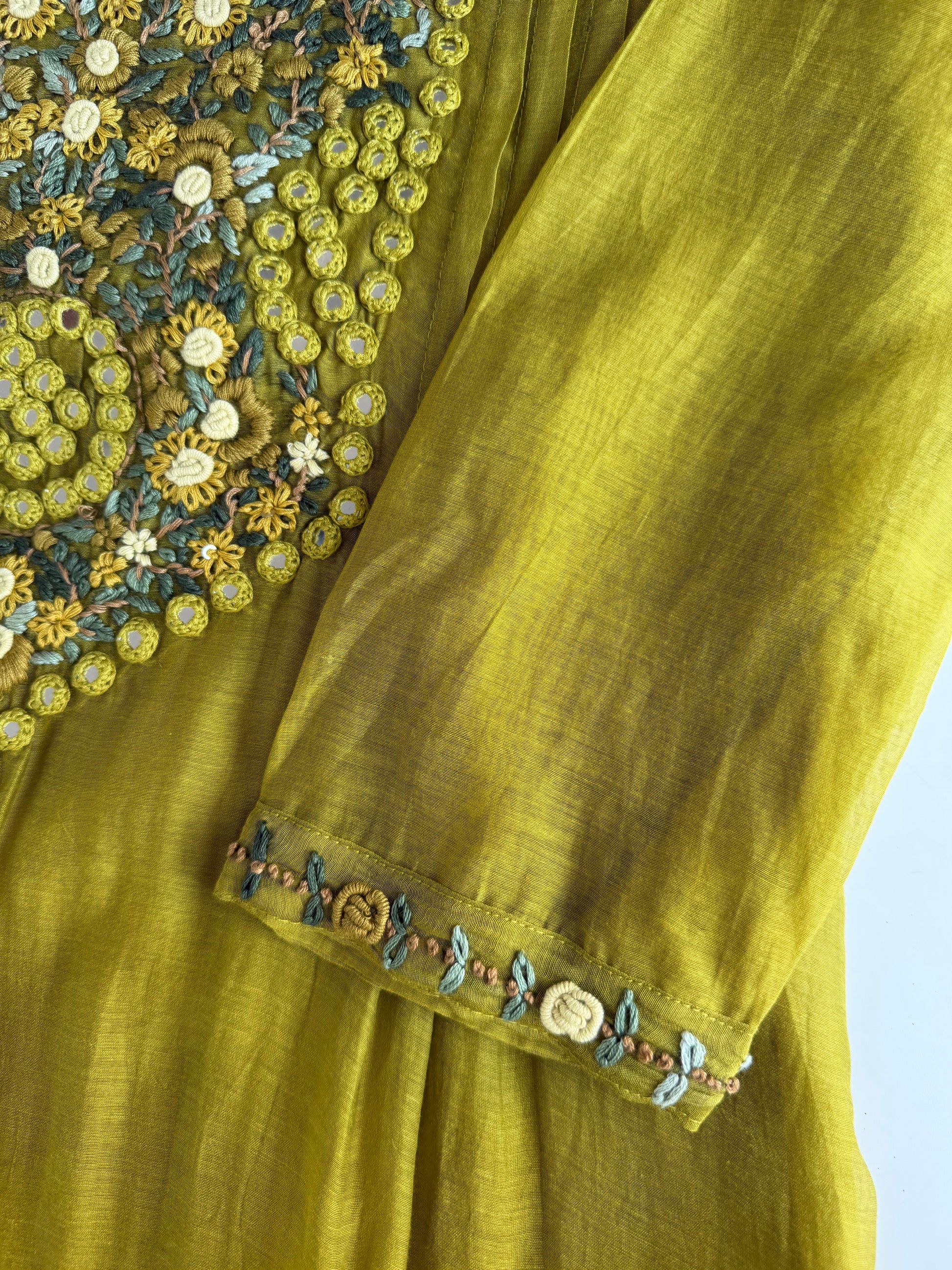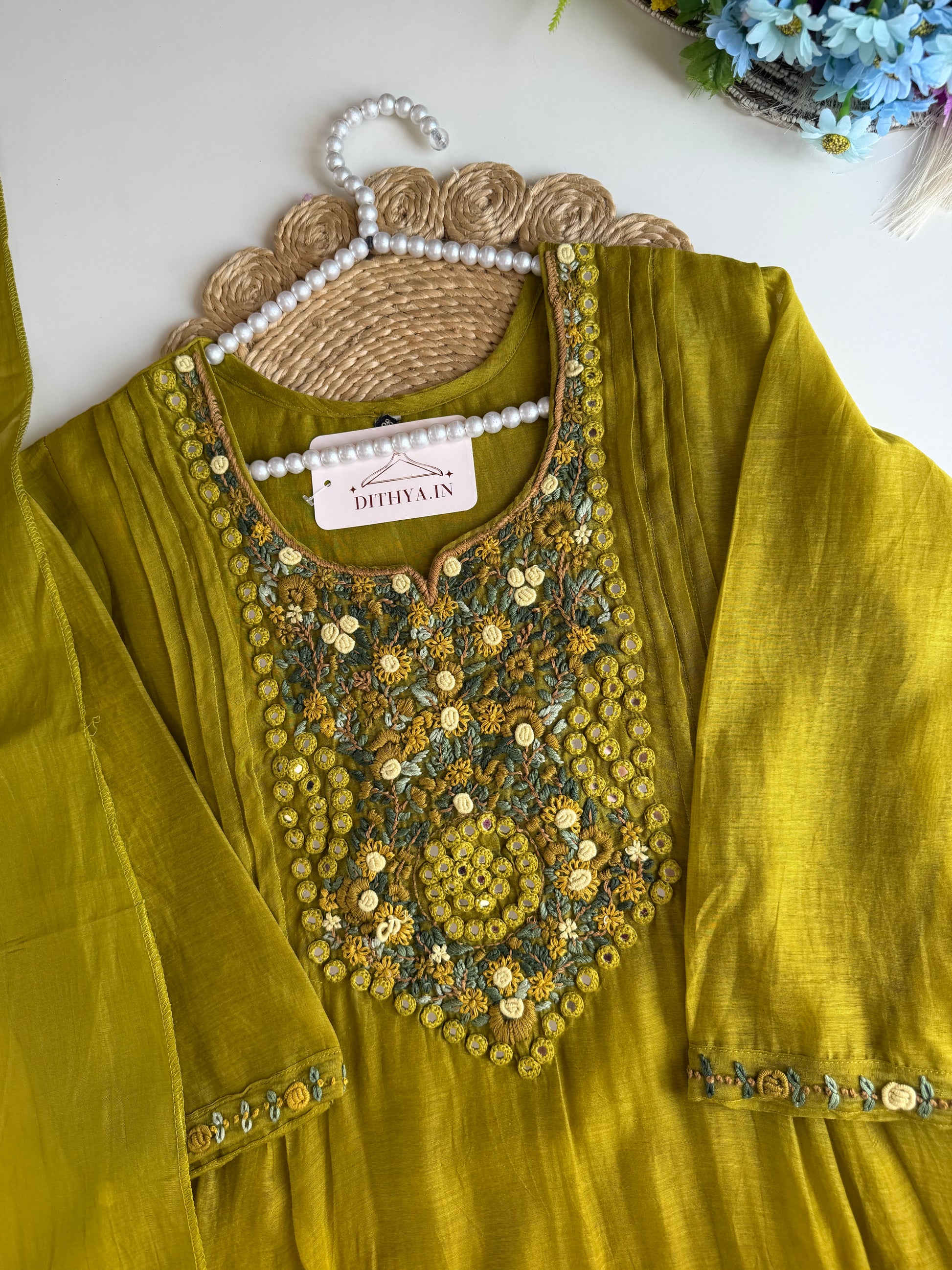 K604 - Mul chanderi embroidered Aline Kurti with pants and dupatta