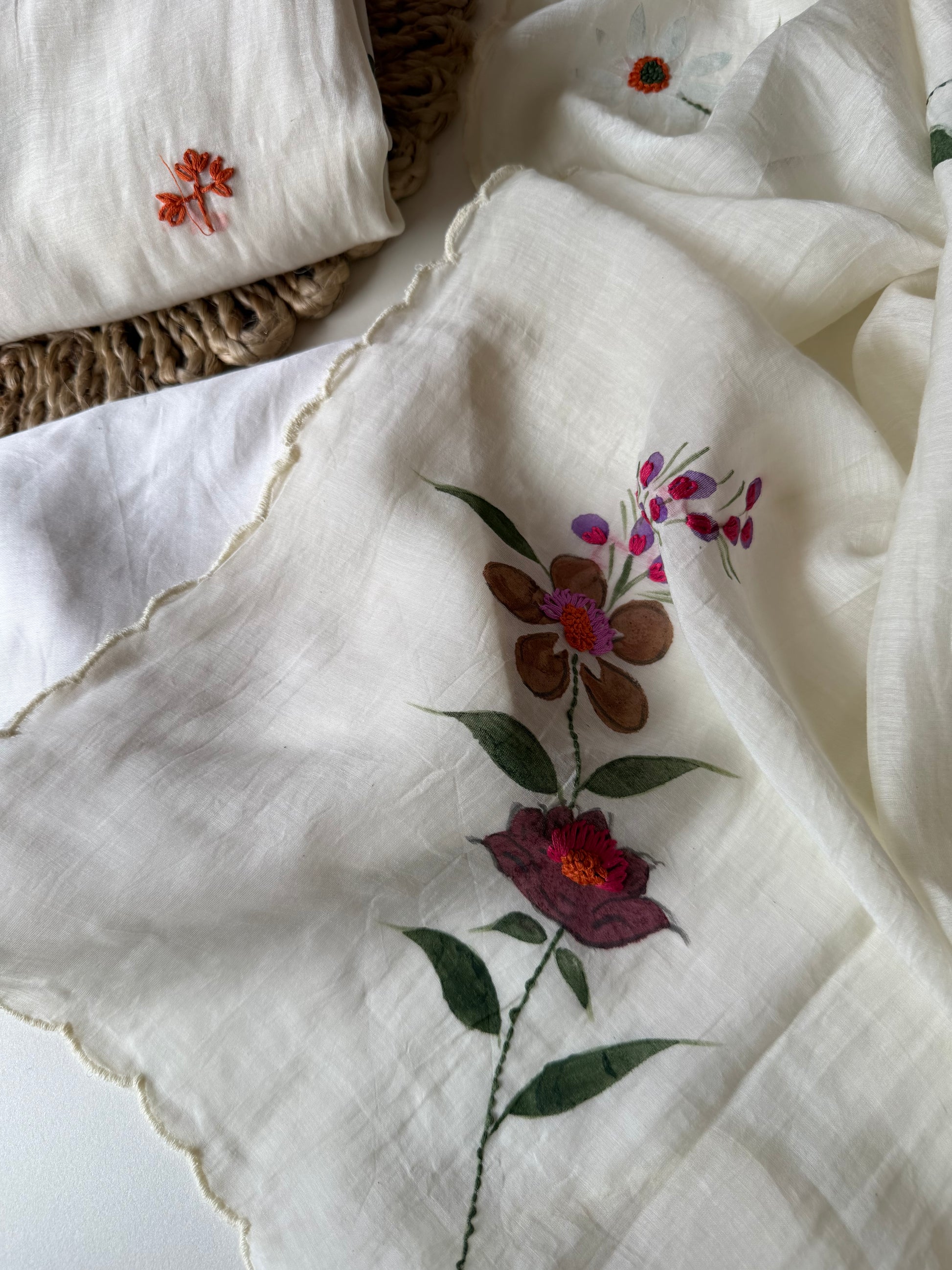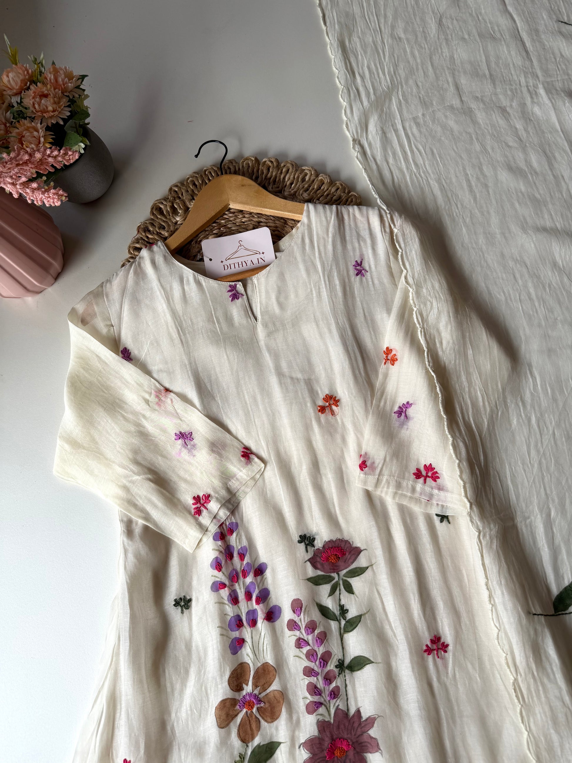 K611 - Mul chanderi embroidered Aline Kurti with pants and dupatta