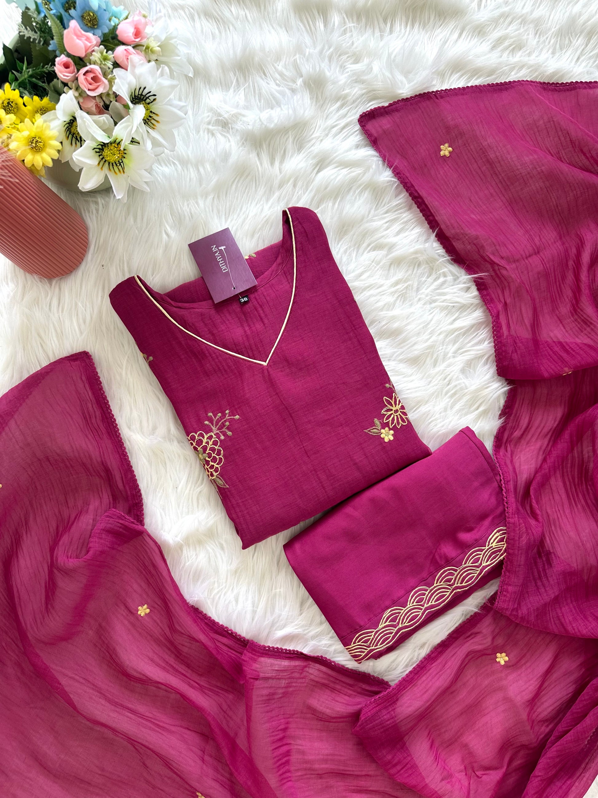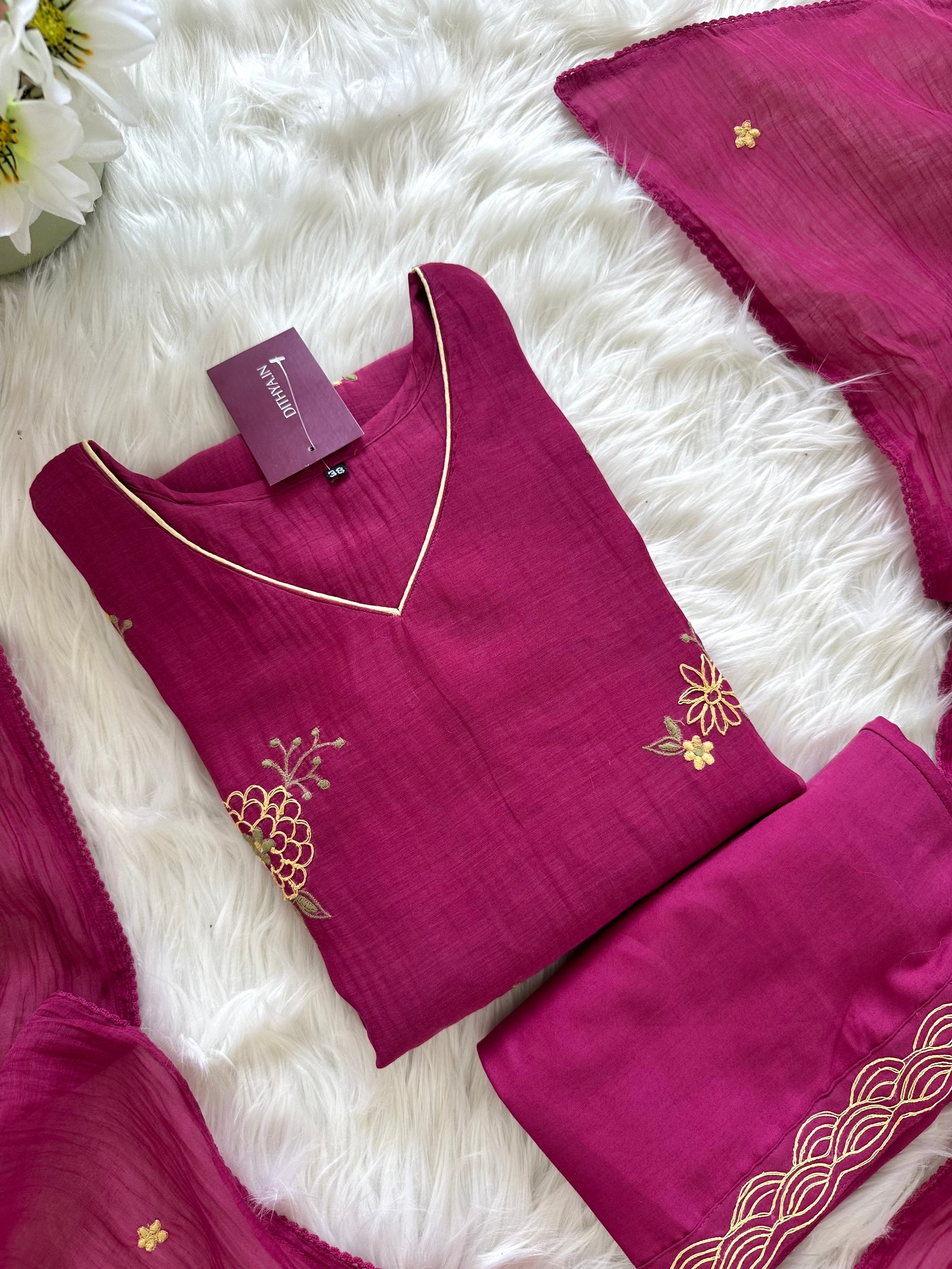This Mul Chanderi embroidered Aline kurti, paired with pants and dupatta, is the perfect addition to your wardrobe. Crafted with intricate embroidery, this kurti exudes elegance and style. Made from high-quality Mul Chanderi fabric, it offers comfort and durability. Elevate your traditional wear game with this stunning ensemble.