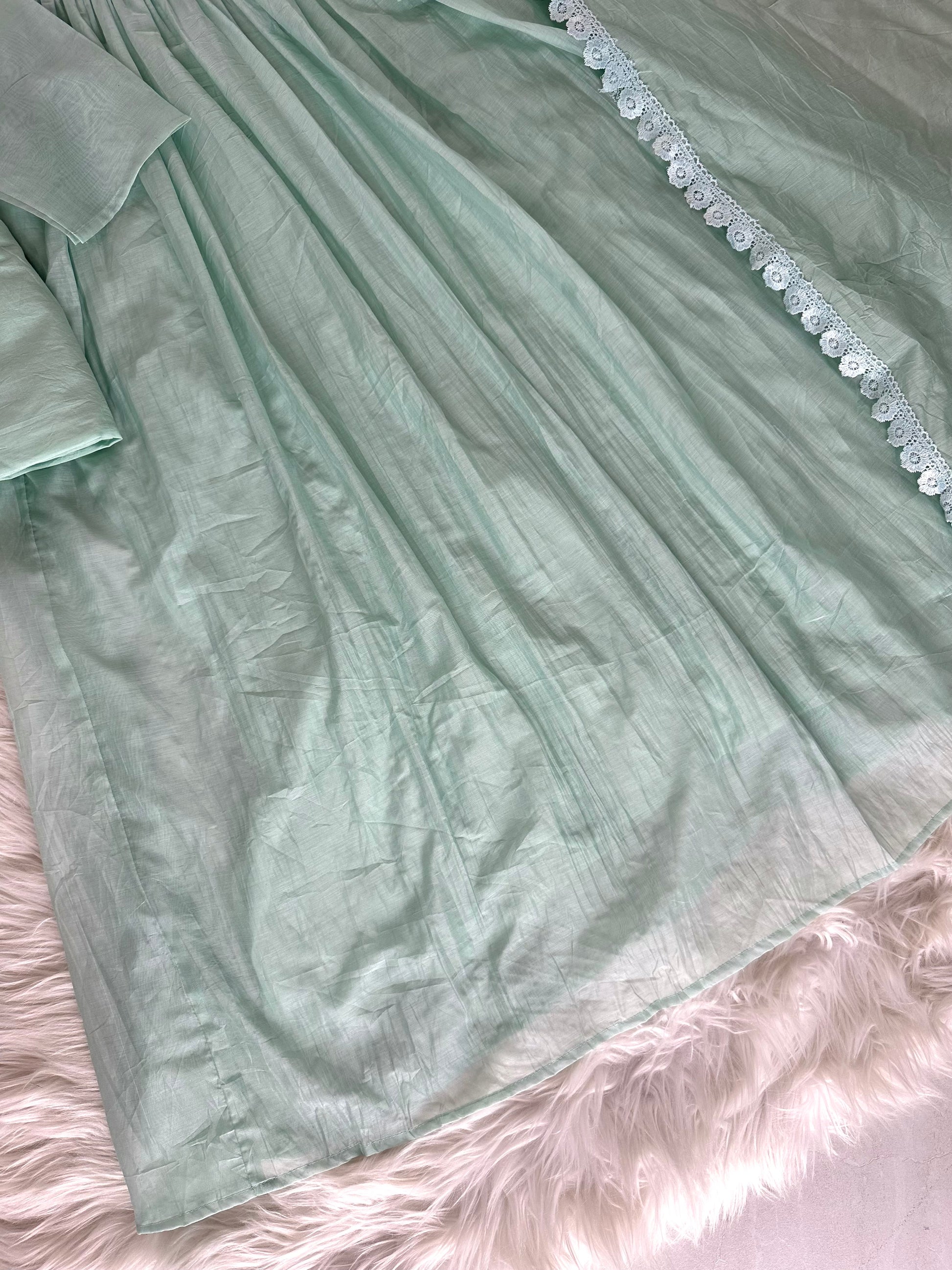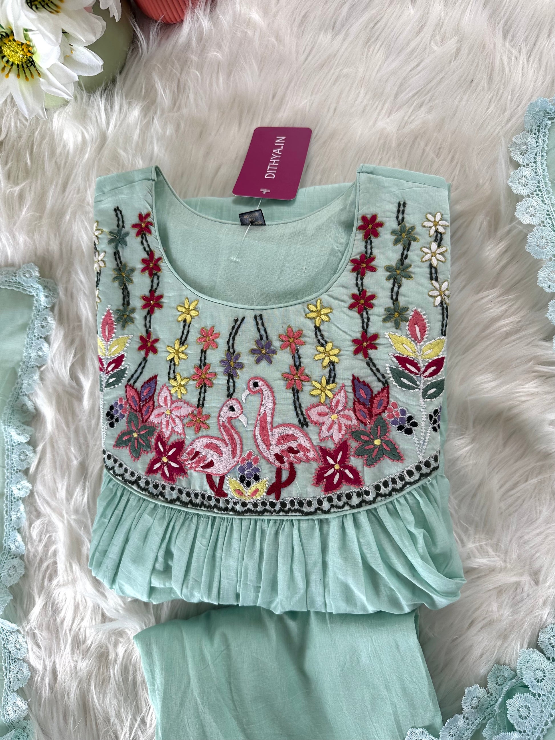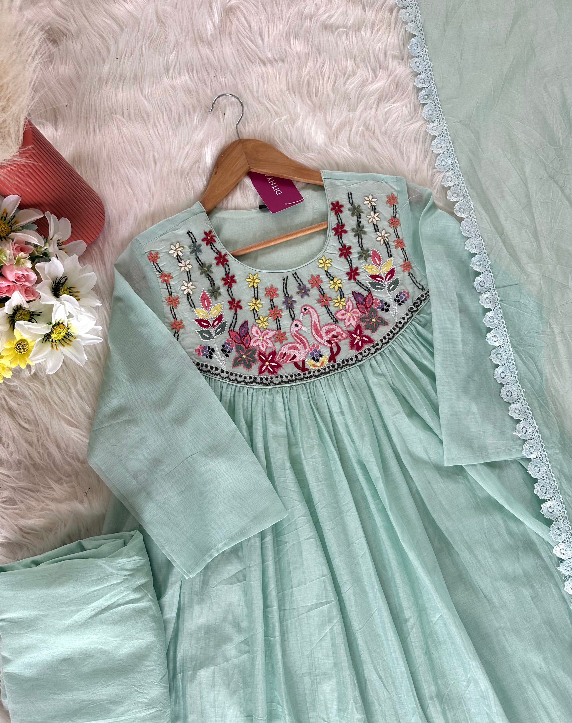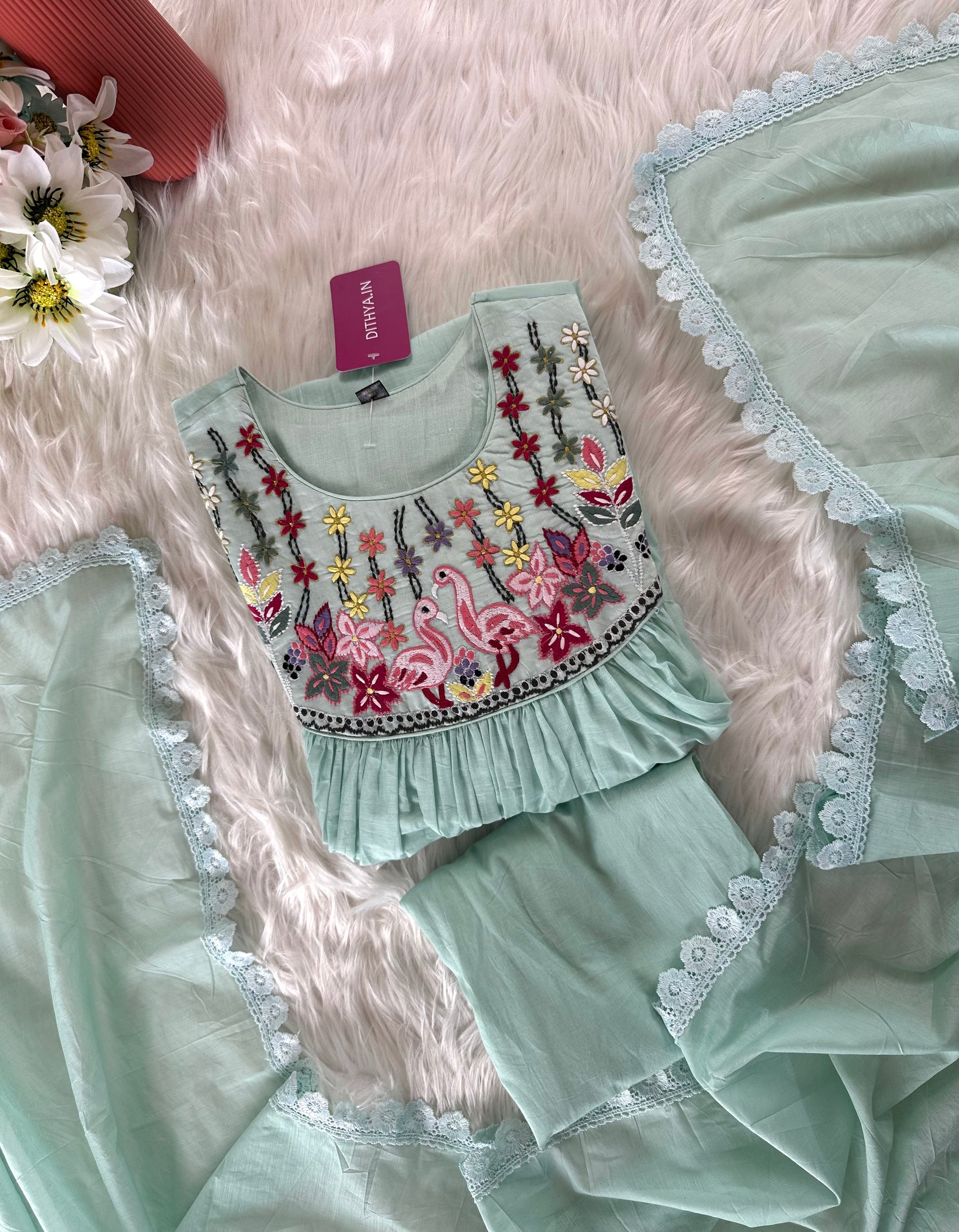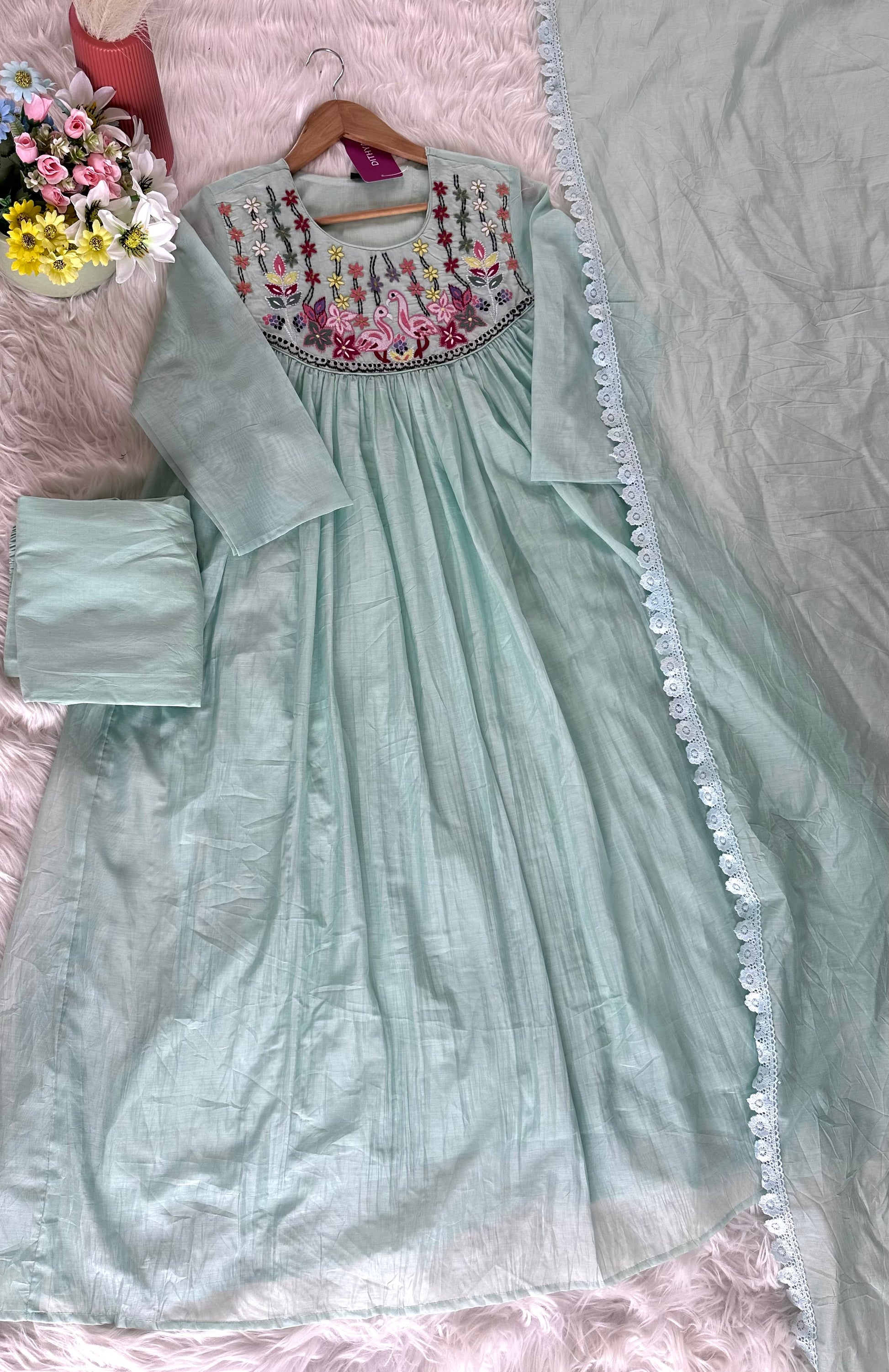 Expertly crafted with delicate Mul Chanderi fabric, this Aline Kurti comes adorned with beautiful embroidery details. Paired with comfy pants and a matching dupatta, this ensemble exudes elegance and grace. Perfect for any occasion, its timeless design and high-quality materials make it a must-have in your wardrobe.