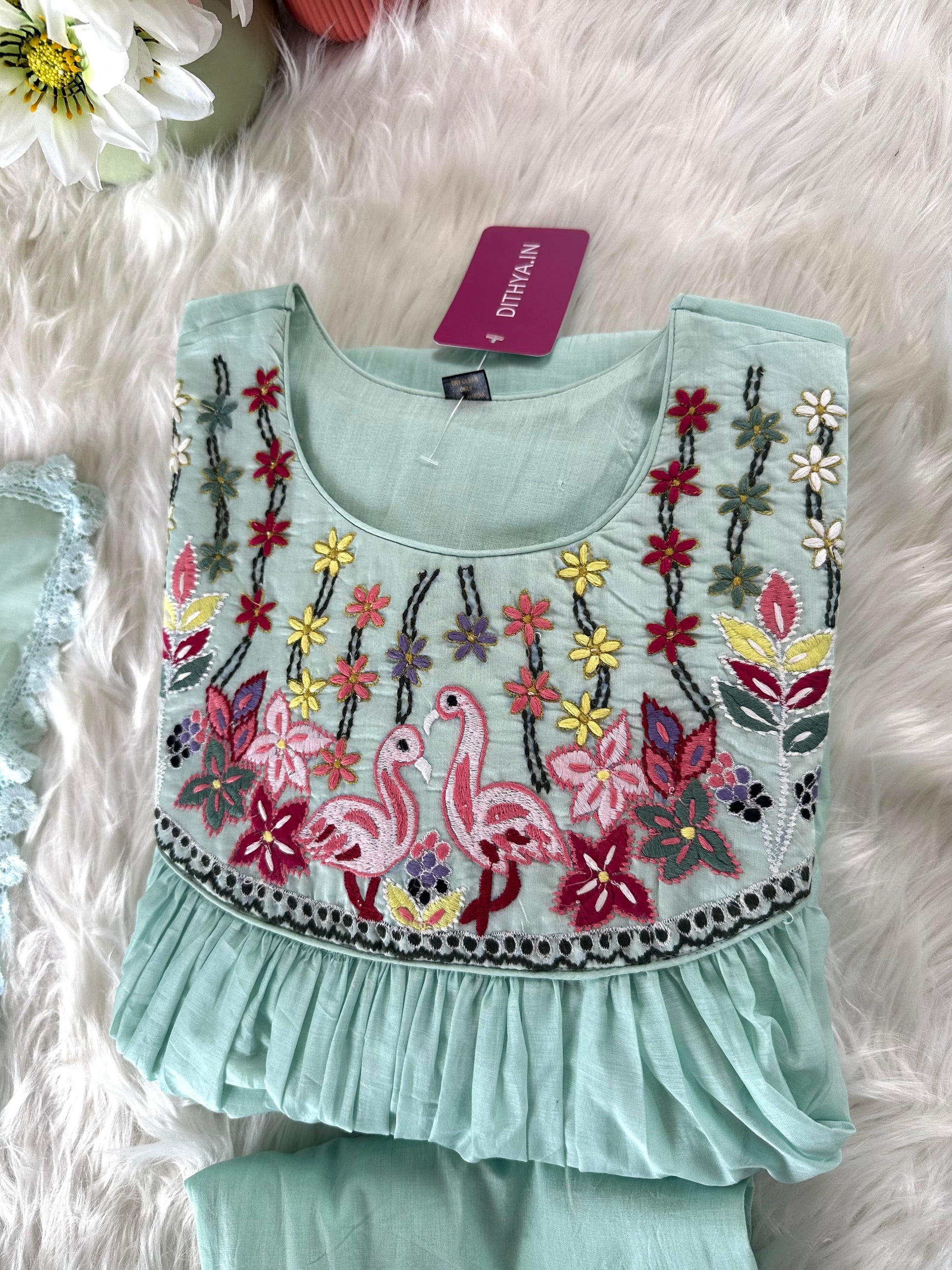 K376 - Mul Chanderi embroidered Aline Kurti with pants and dupatta
