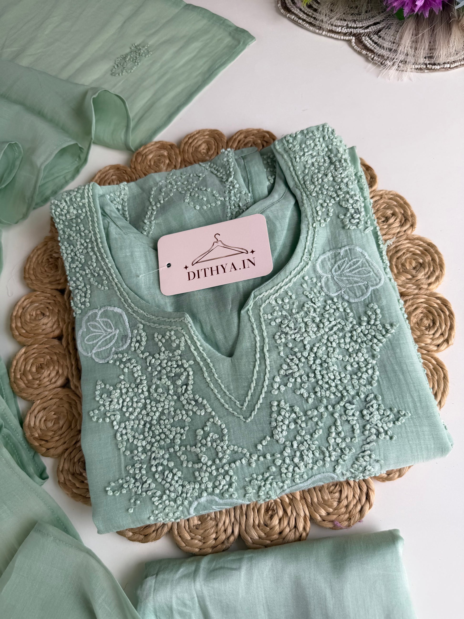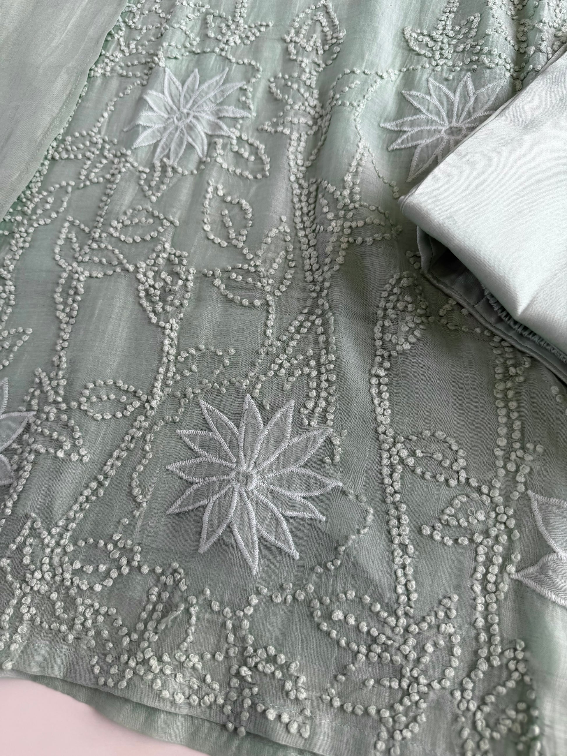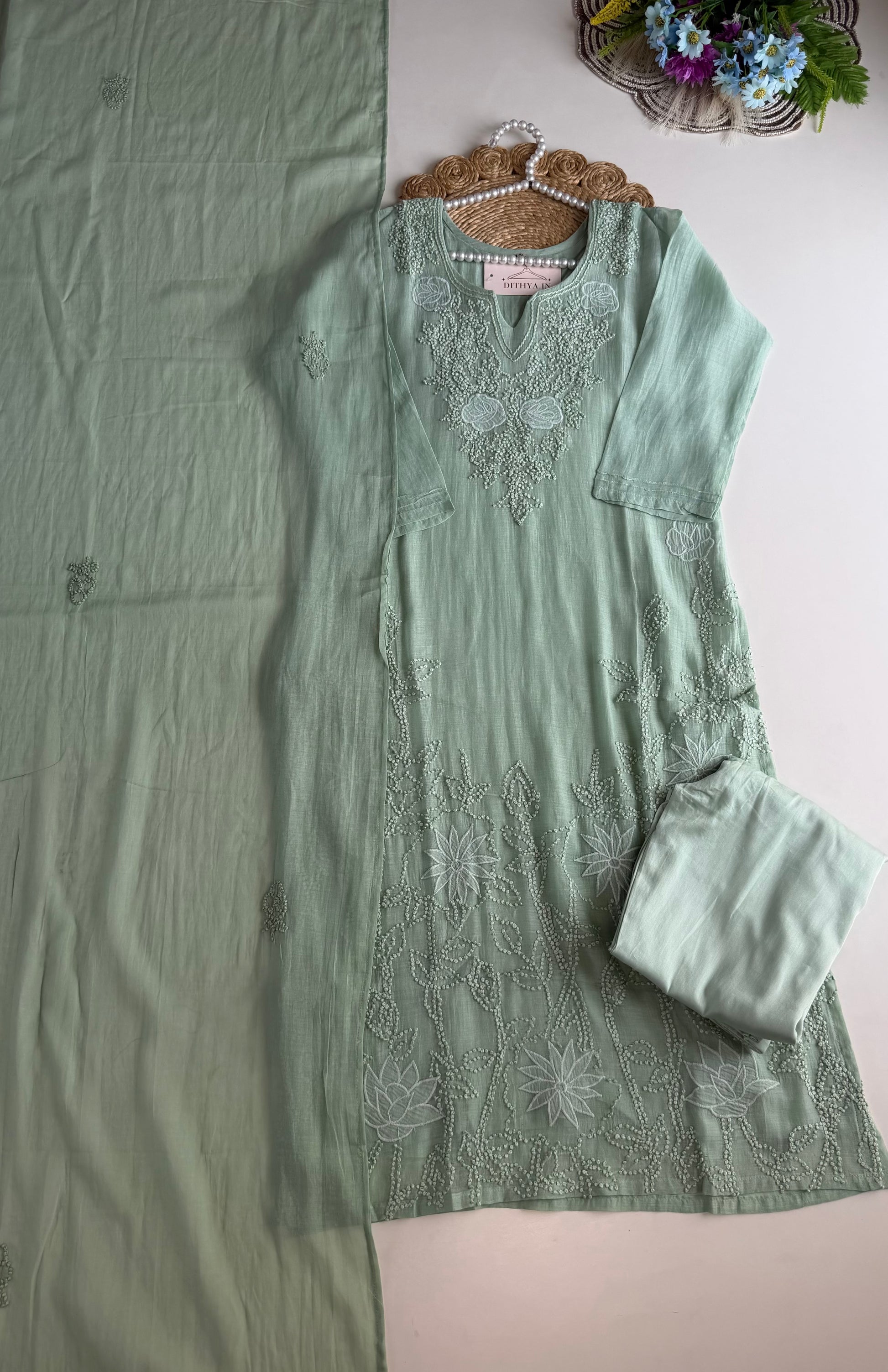 K010 - Mul chanderi embroidered straight Kurti with pants and dupatta