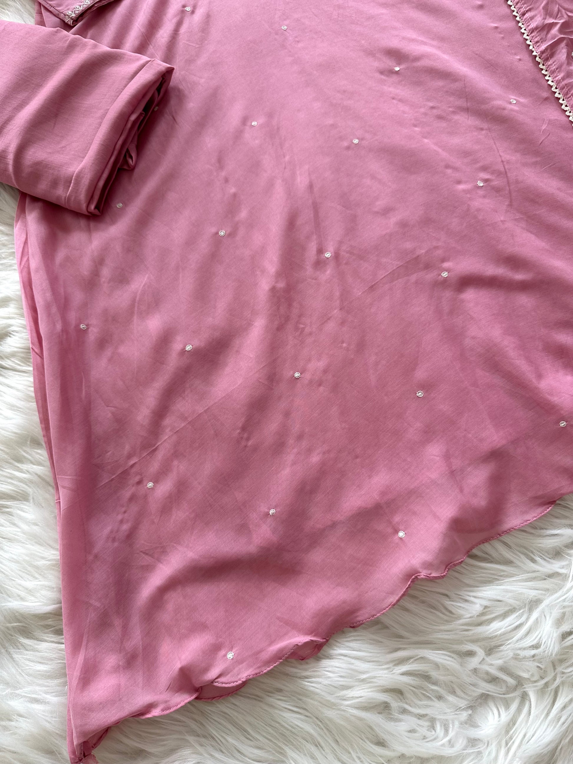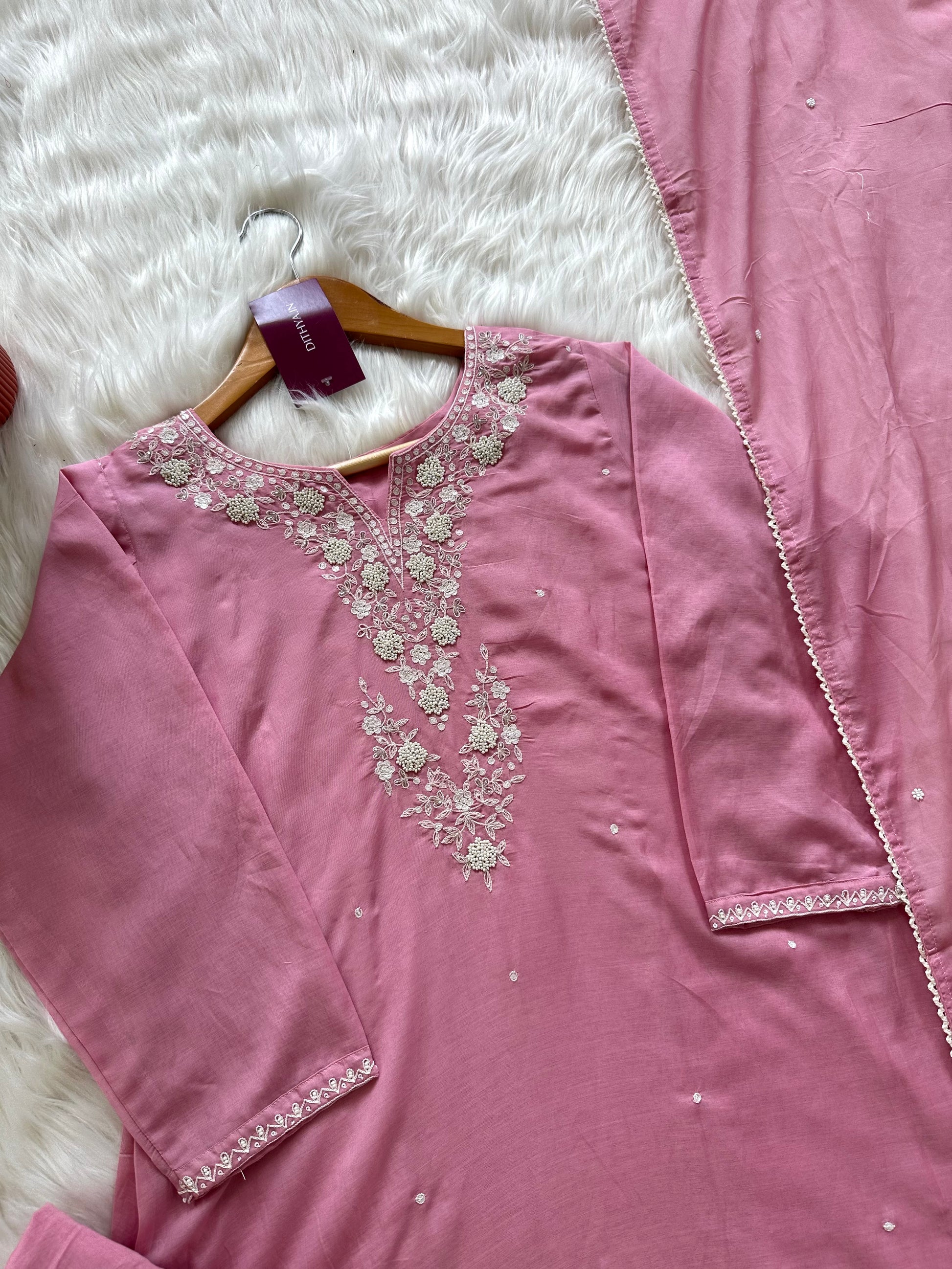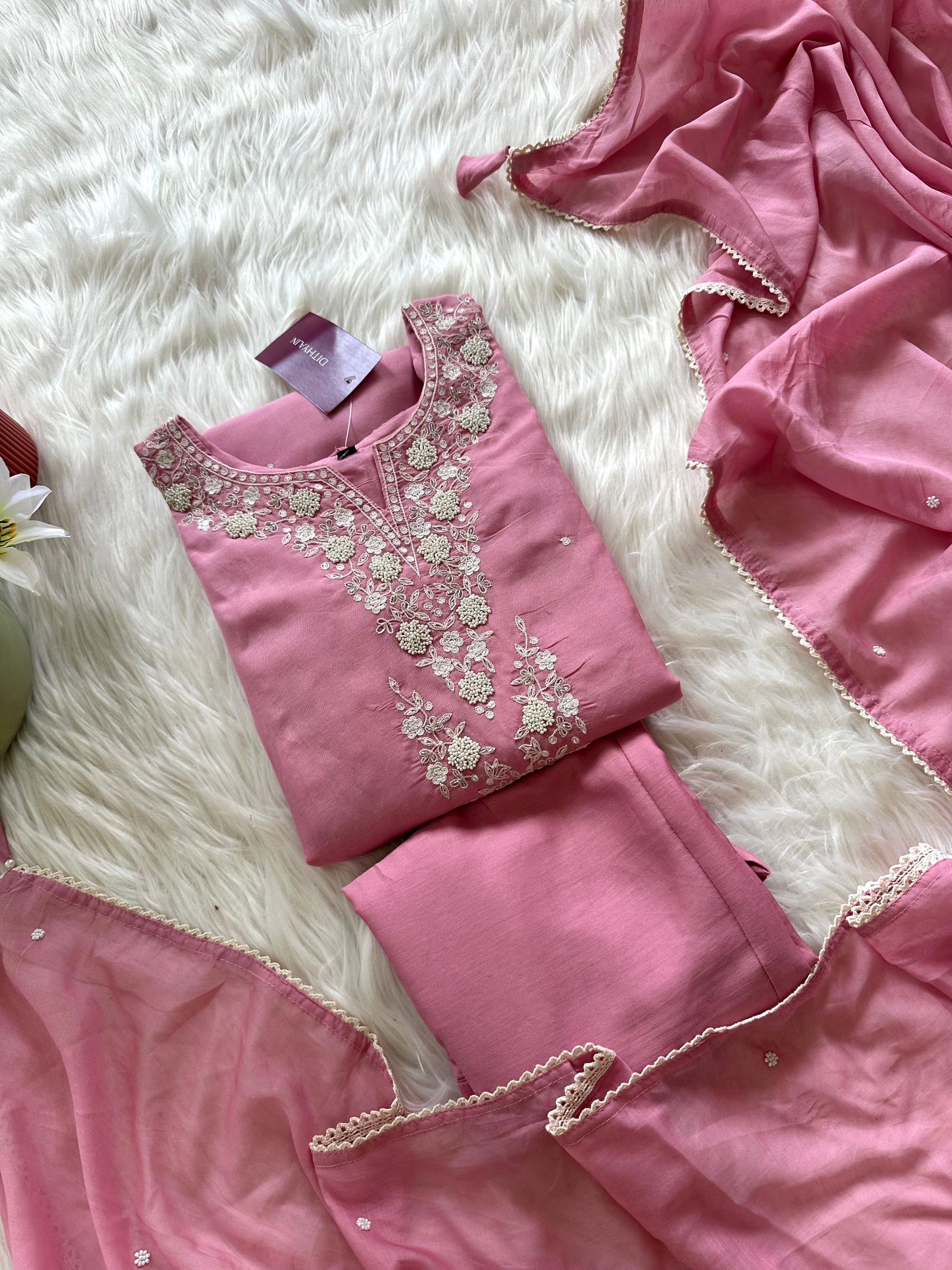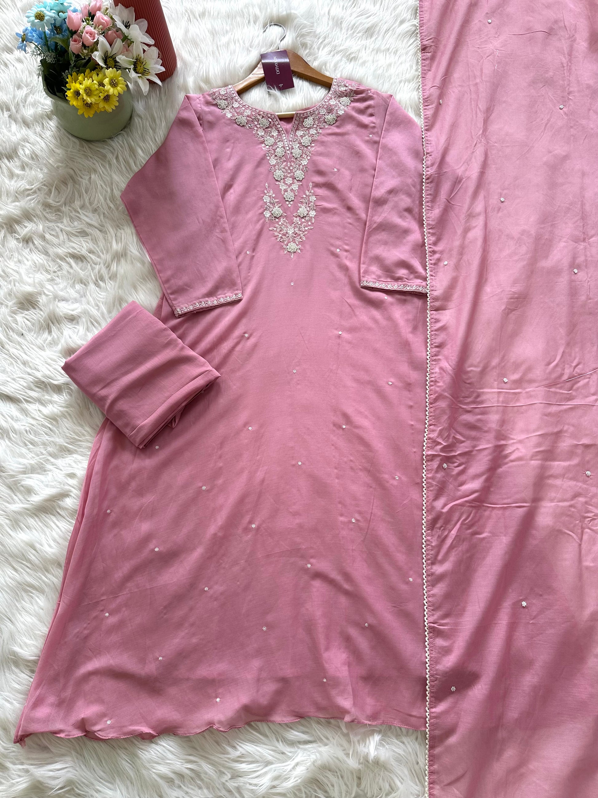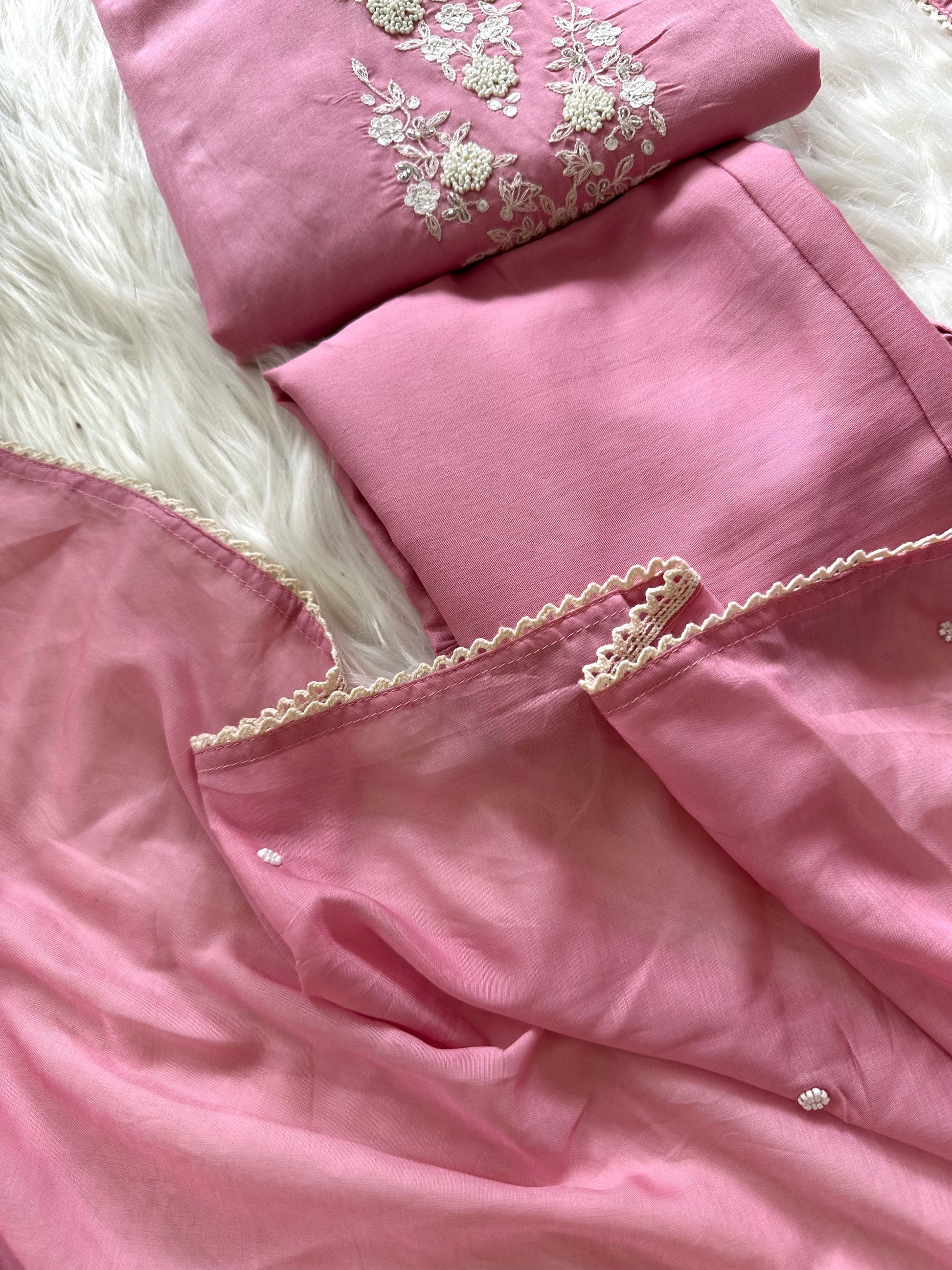 K397 - Mul Chanderi handwork Aline Kurti with pants and dupatta