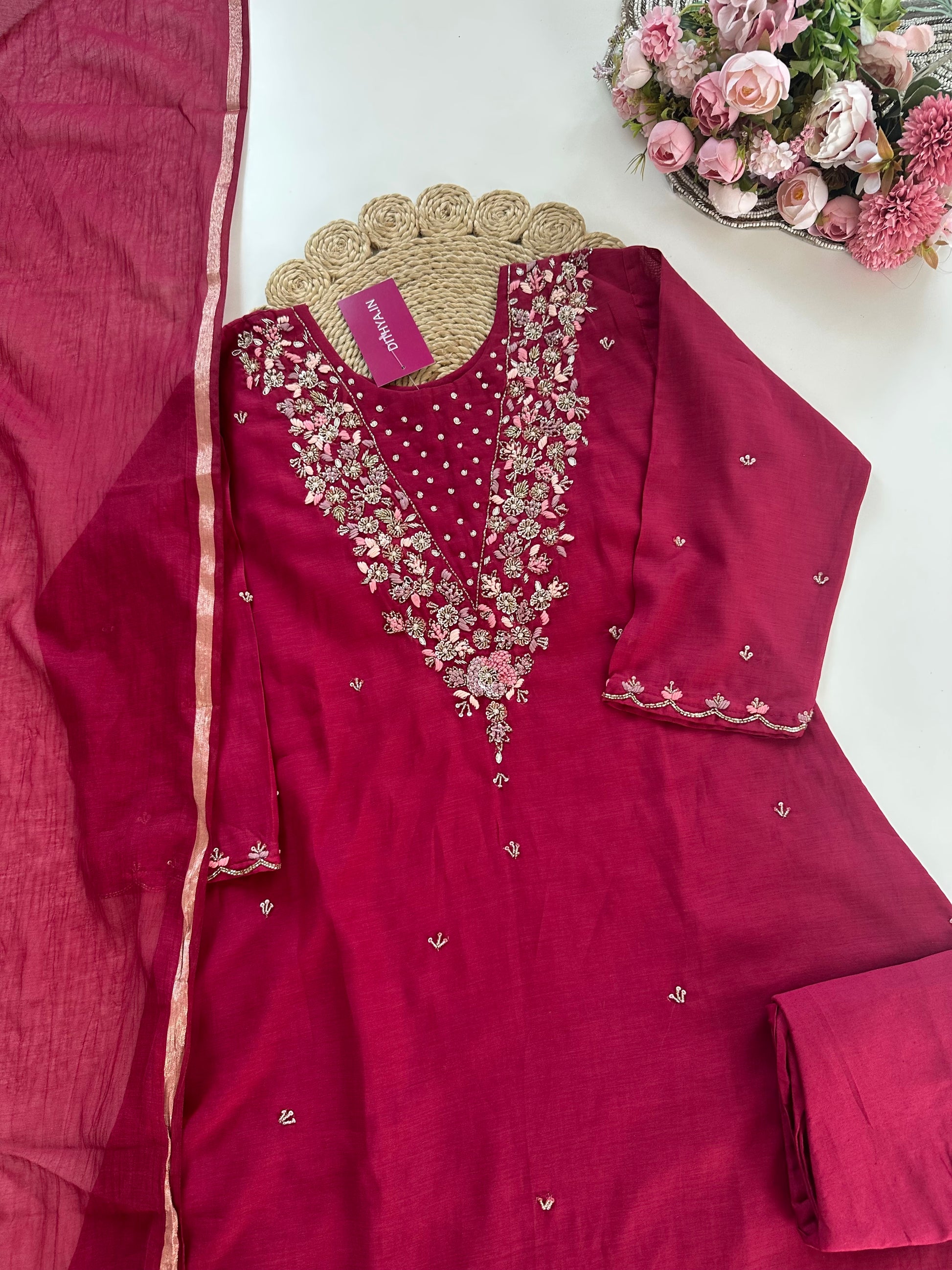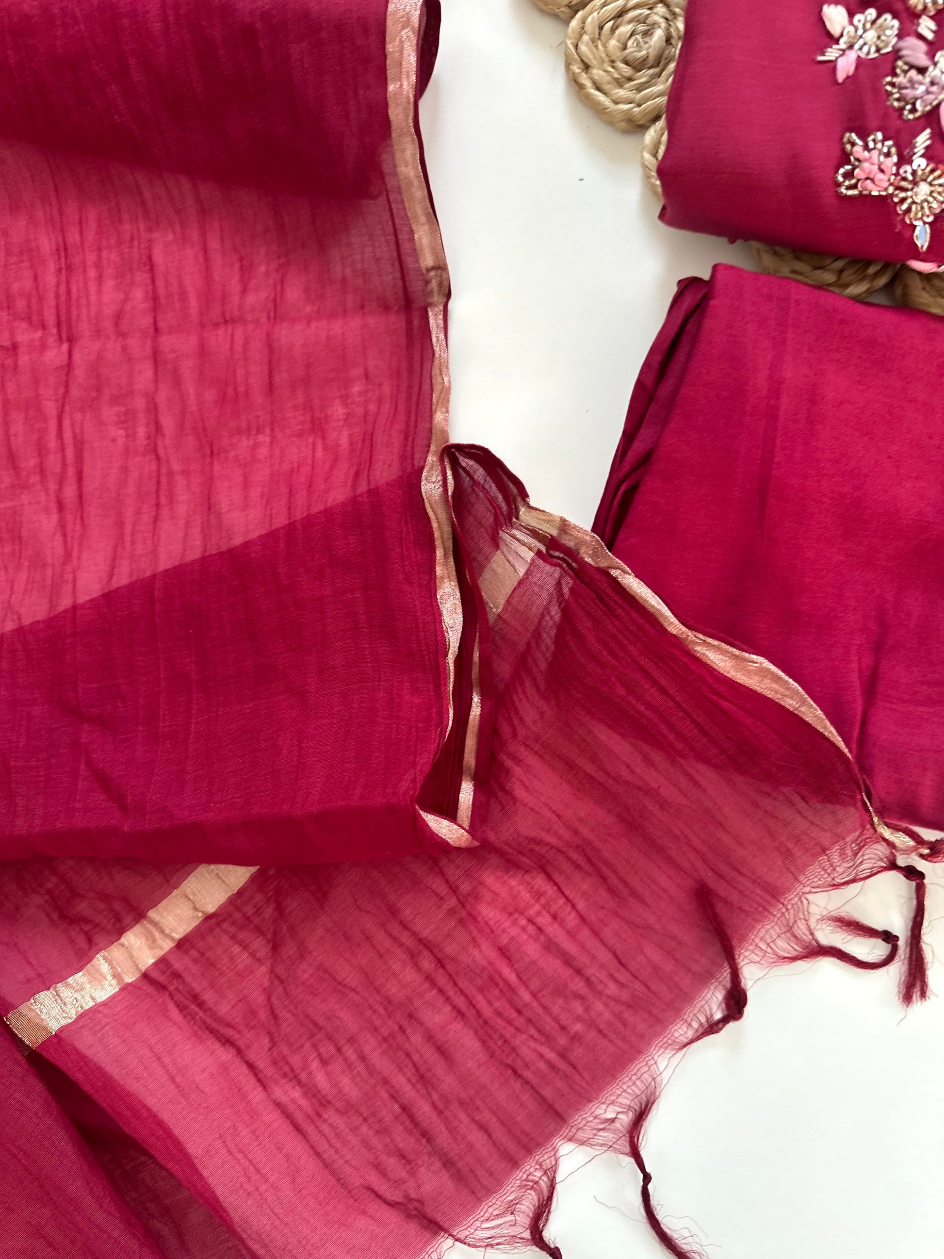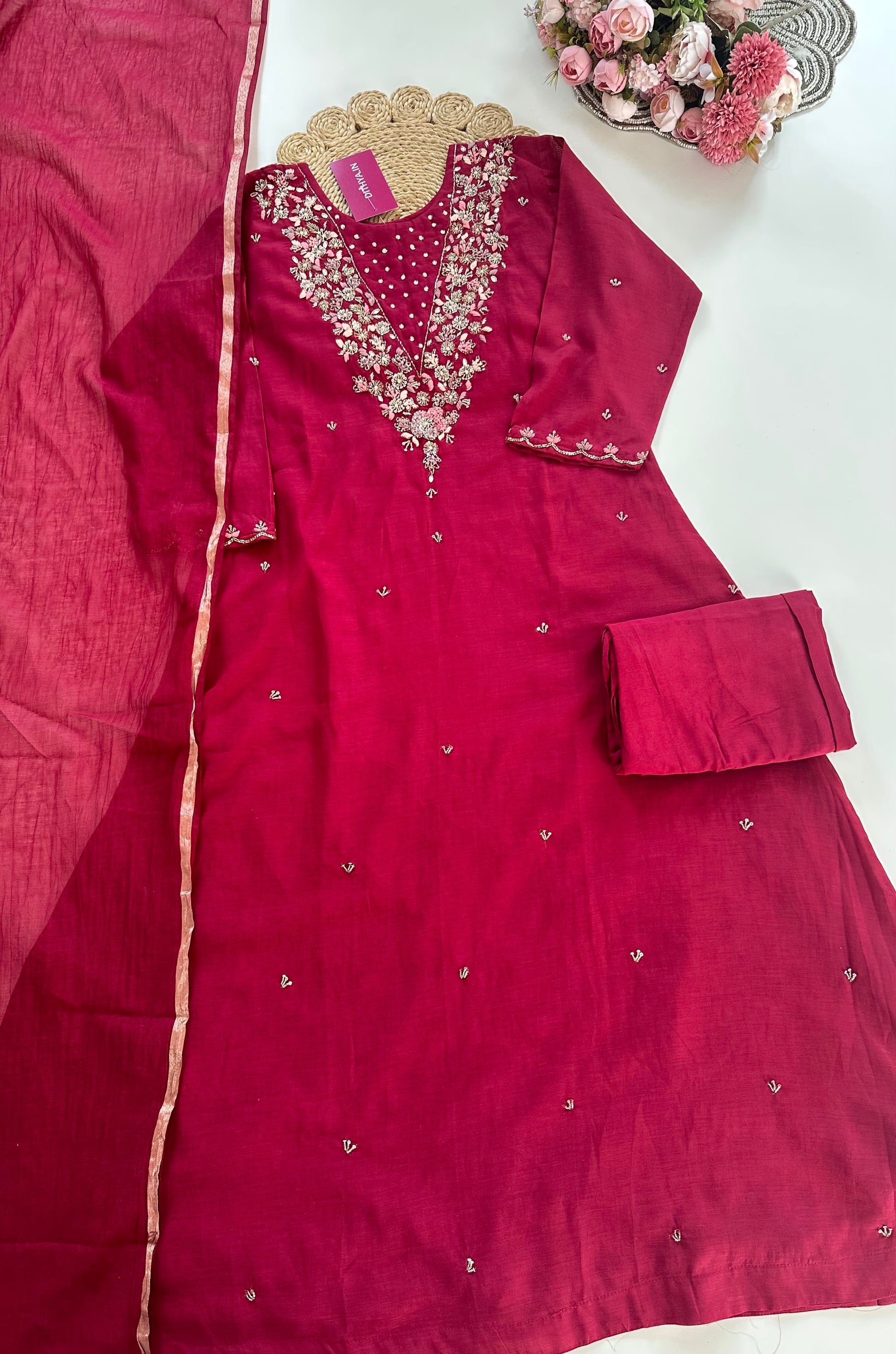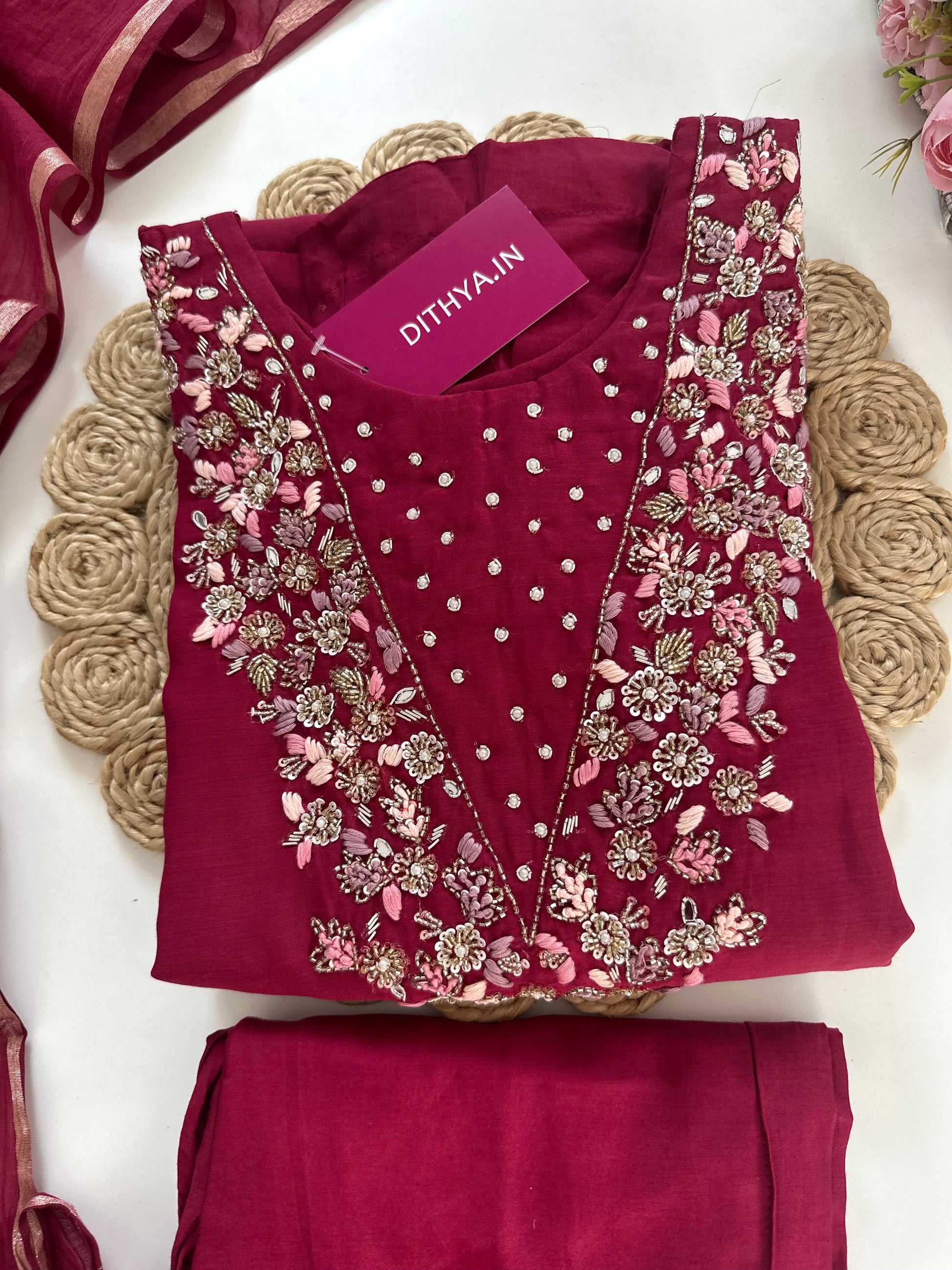 K021 - Mul Chanderi handwork Aline Kurti with pants and dupatta