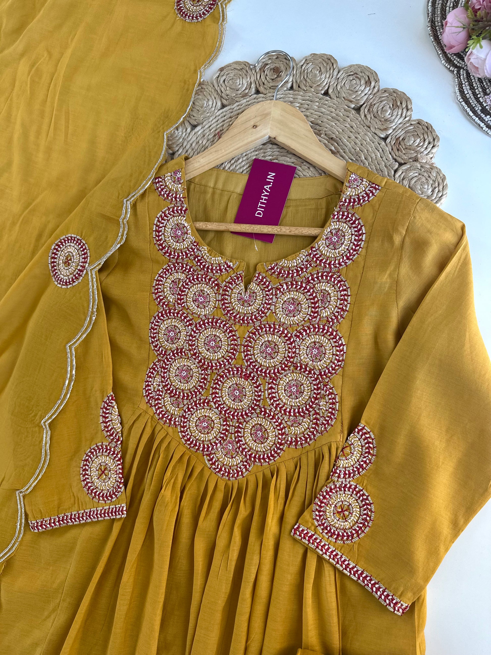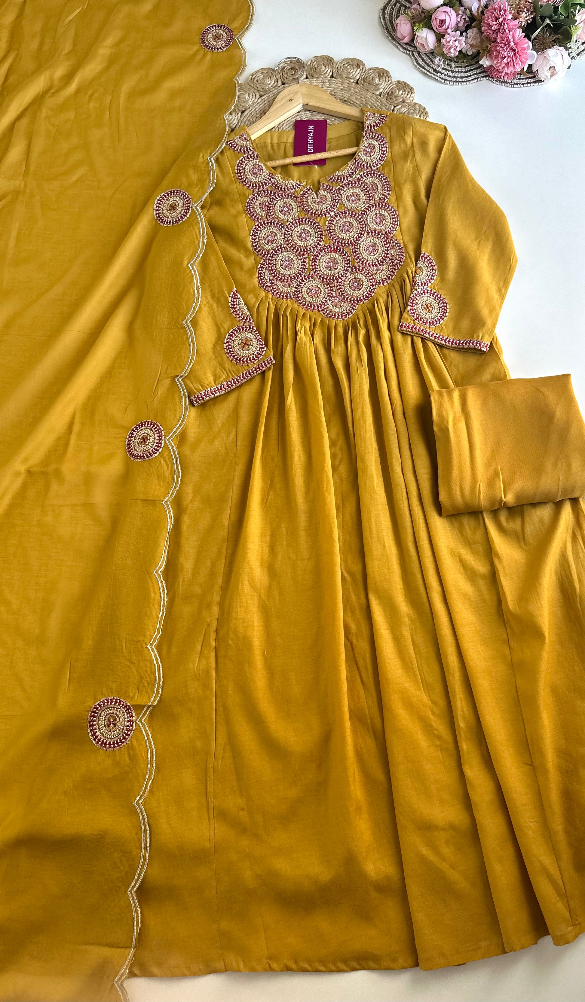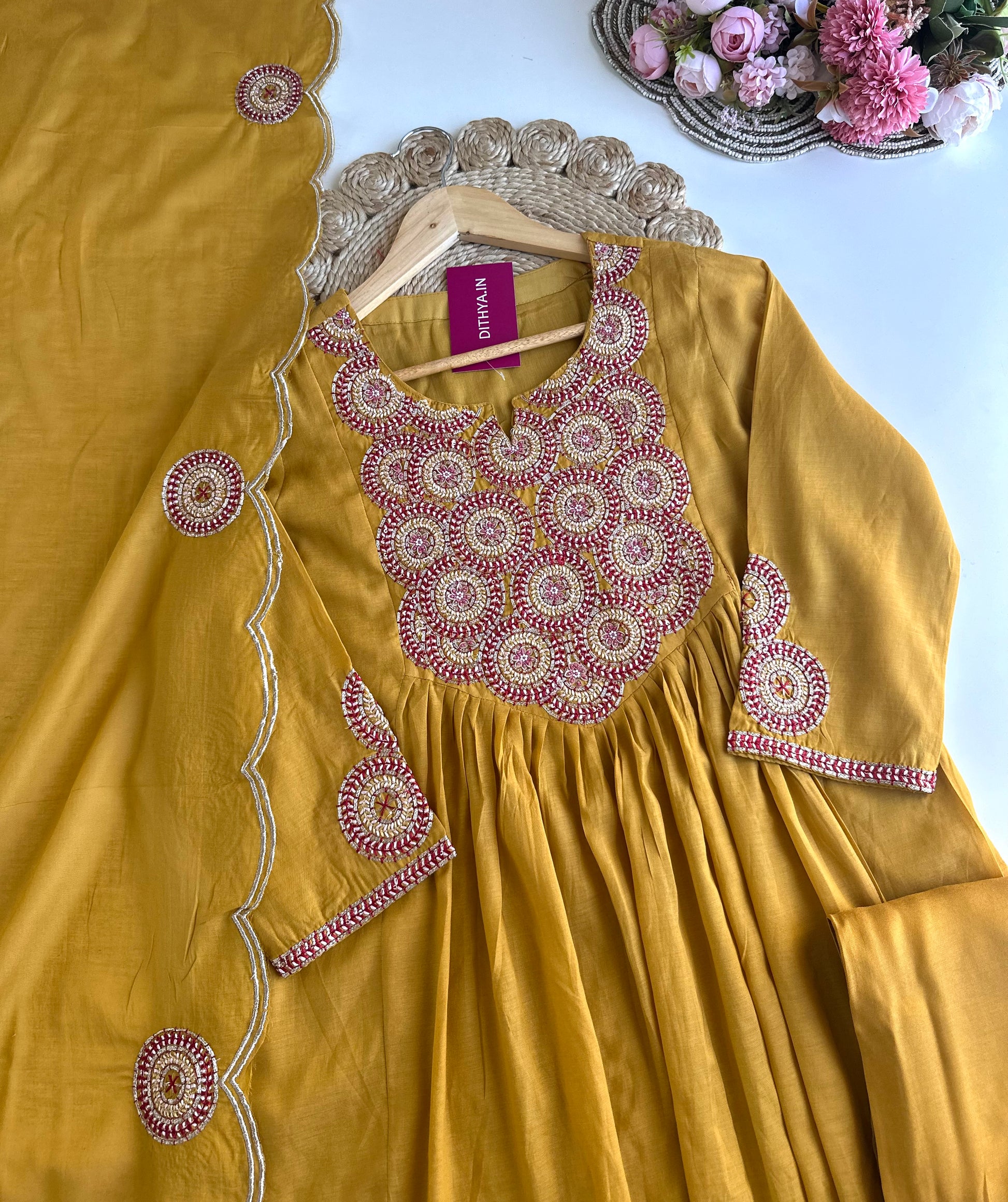 This Aline Kurti is made with Mul Chanderi fabric and features intricate handwork, giving it a unique and luxurious look. It comes with matching pants and a dupatta to complete the outfit. Elevate your style with this elegant and stylish ensemble.