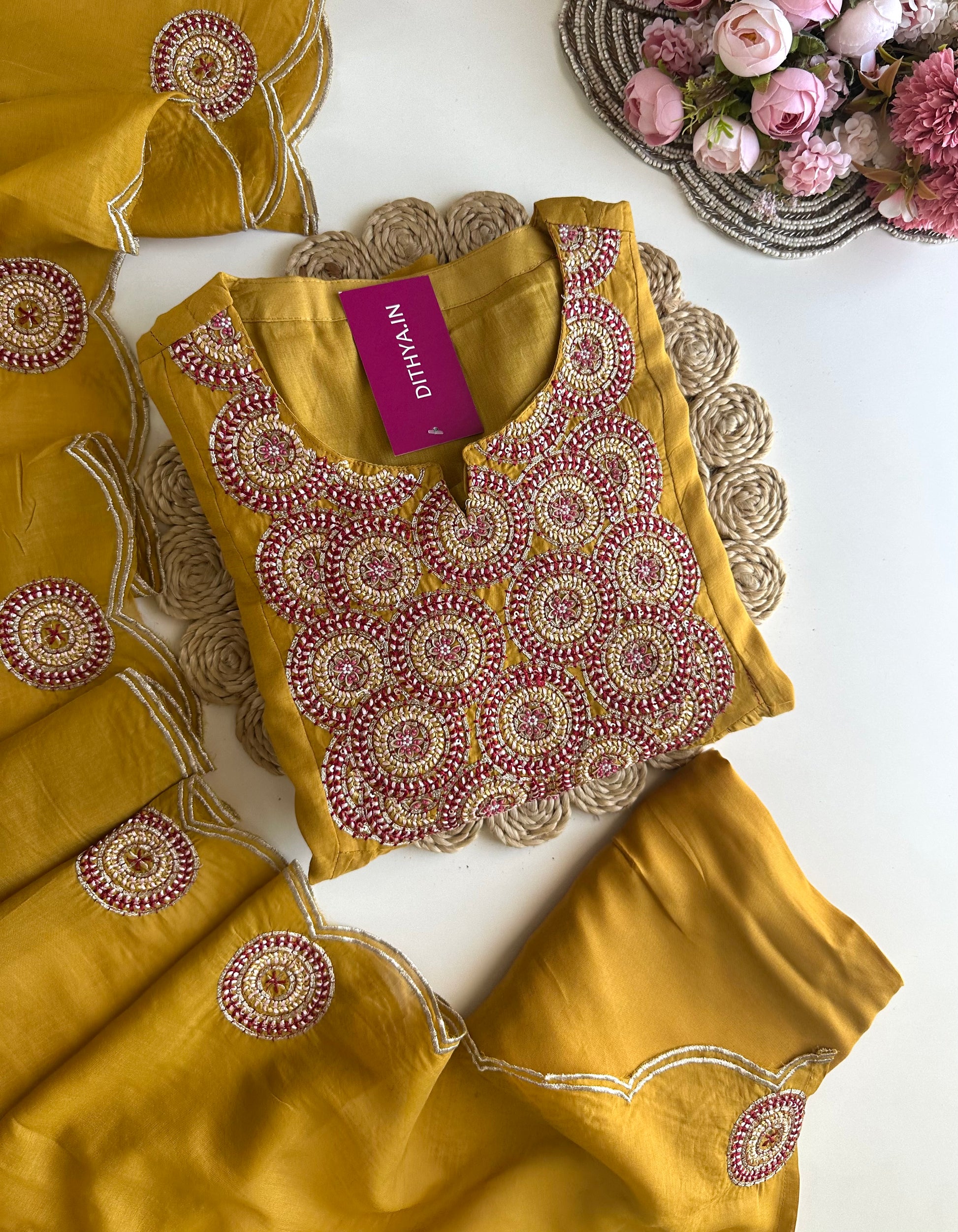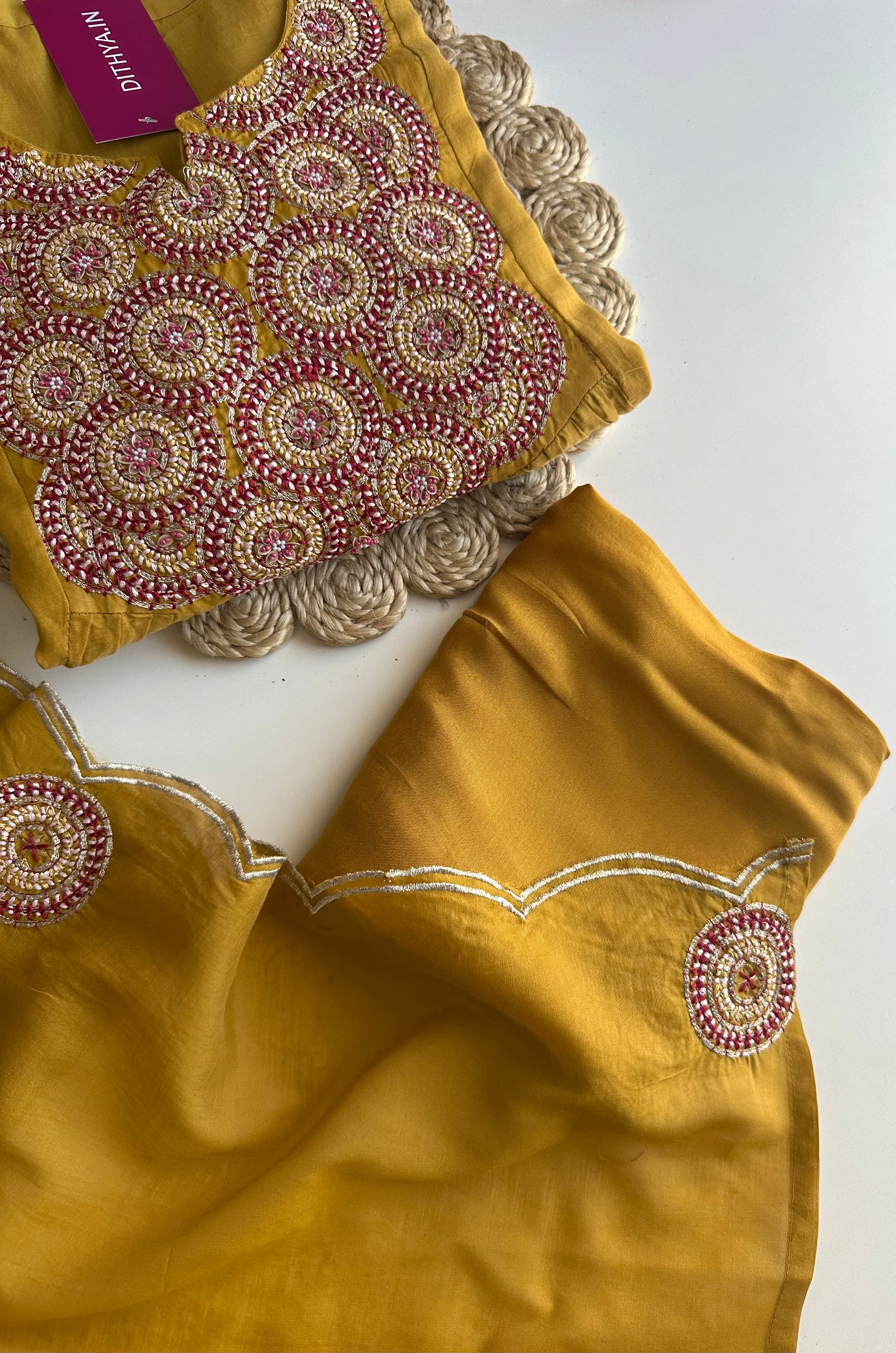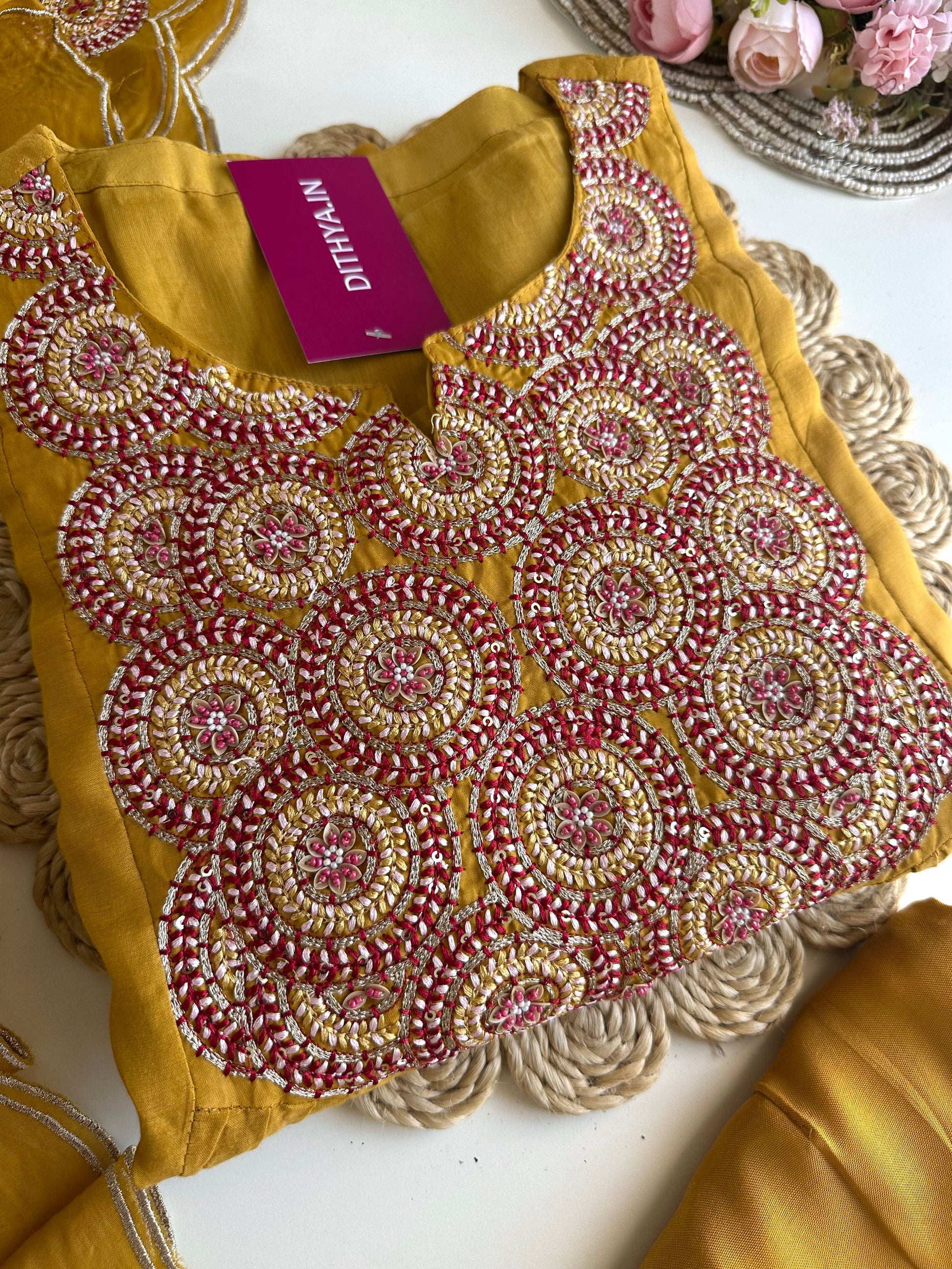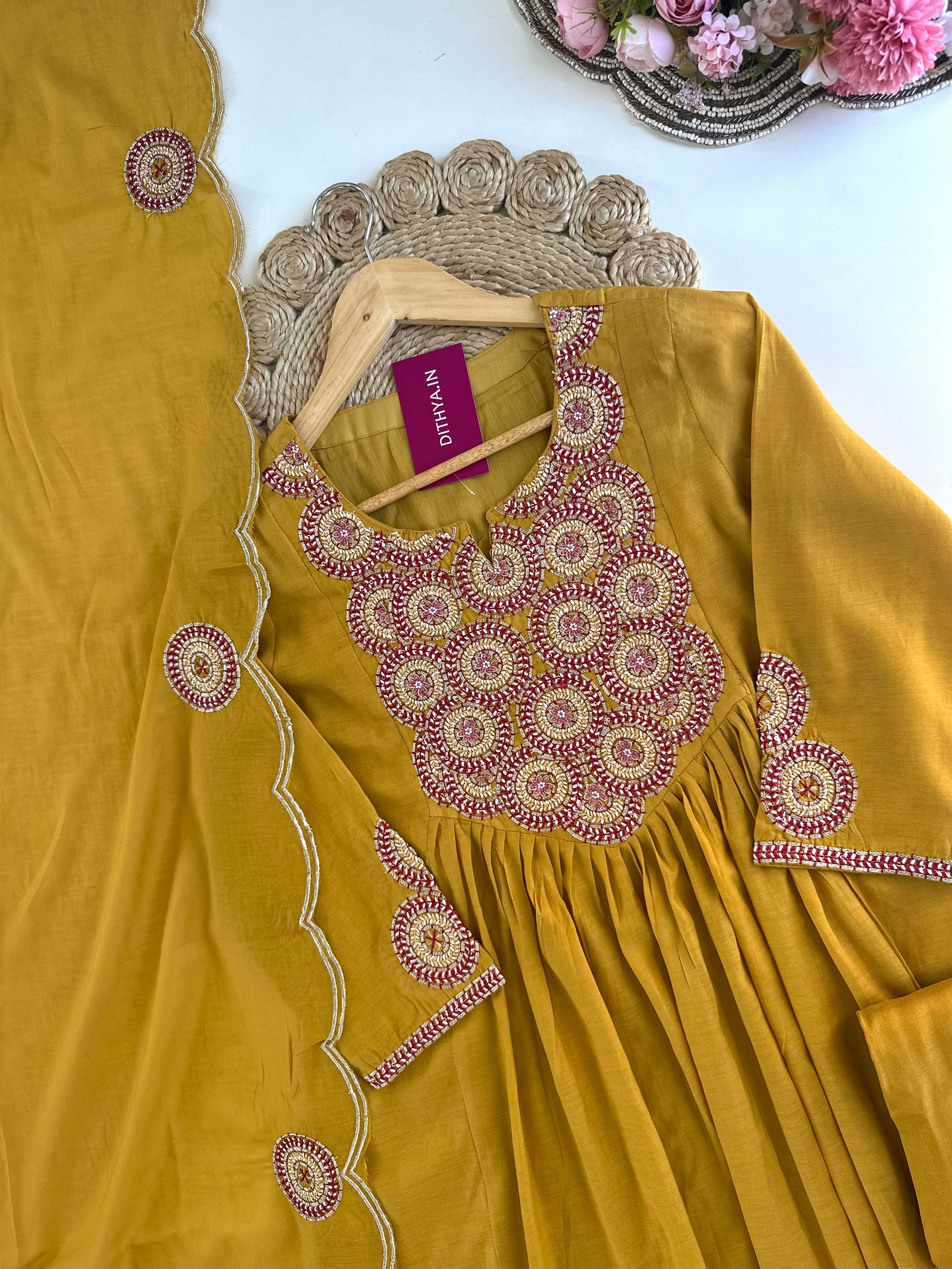 This Aline Kurti is made with Mul Chanderi fabric and features intricate handwork, giving it a unique and luxurious look. It comes with matching pants and a dupatta to complete the outfit. Elevate your style with this elegant and stylish ensemble.