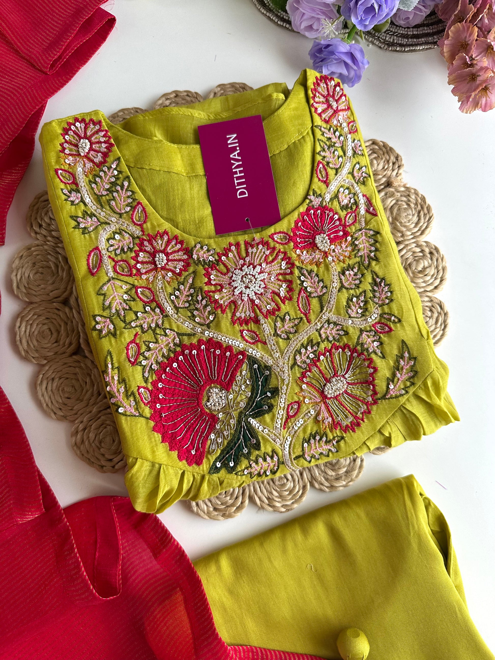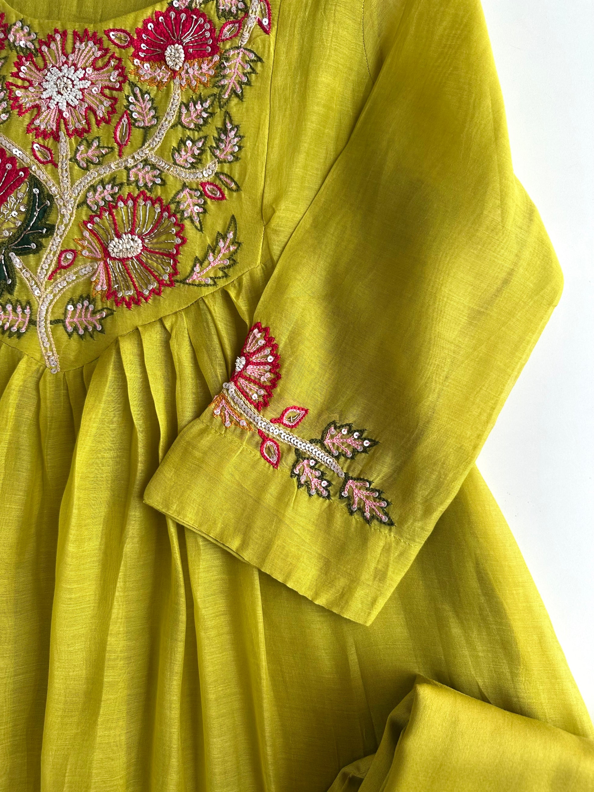 K148 - Mul Chanderi handwork Aline Kurti with pants and dupatta