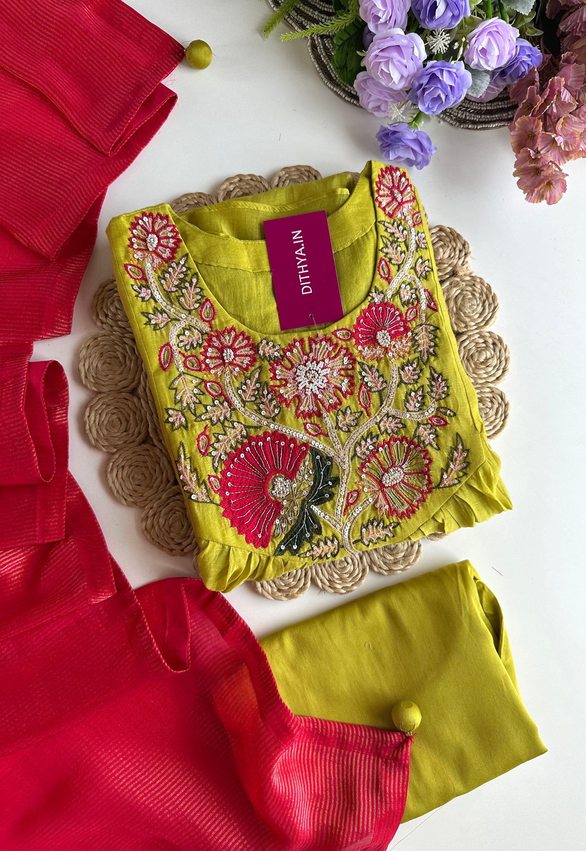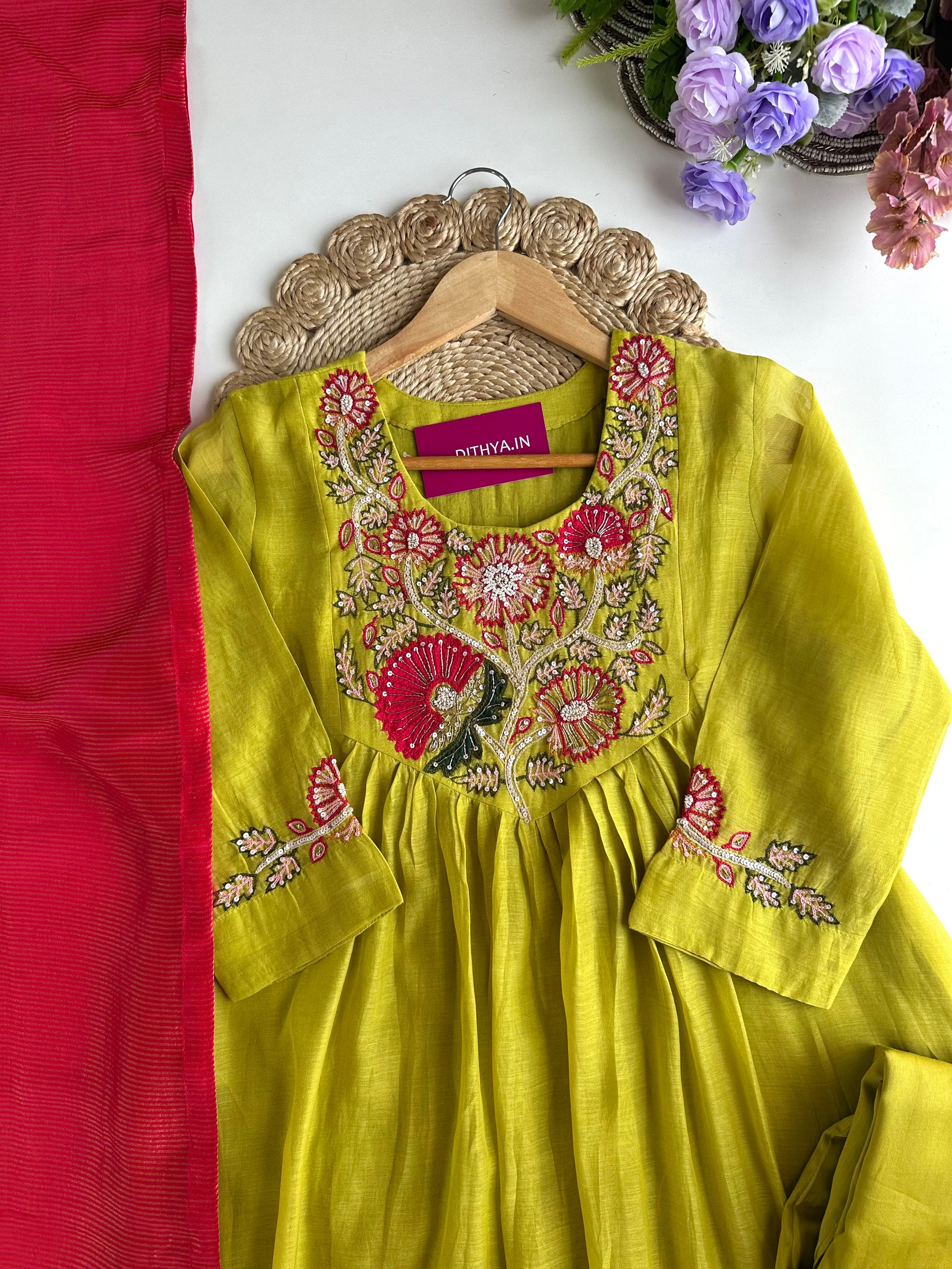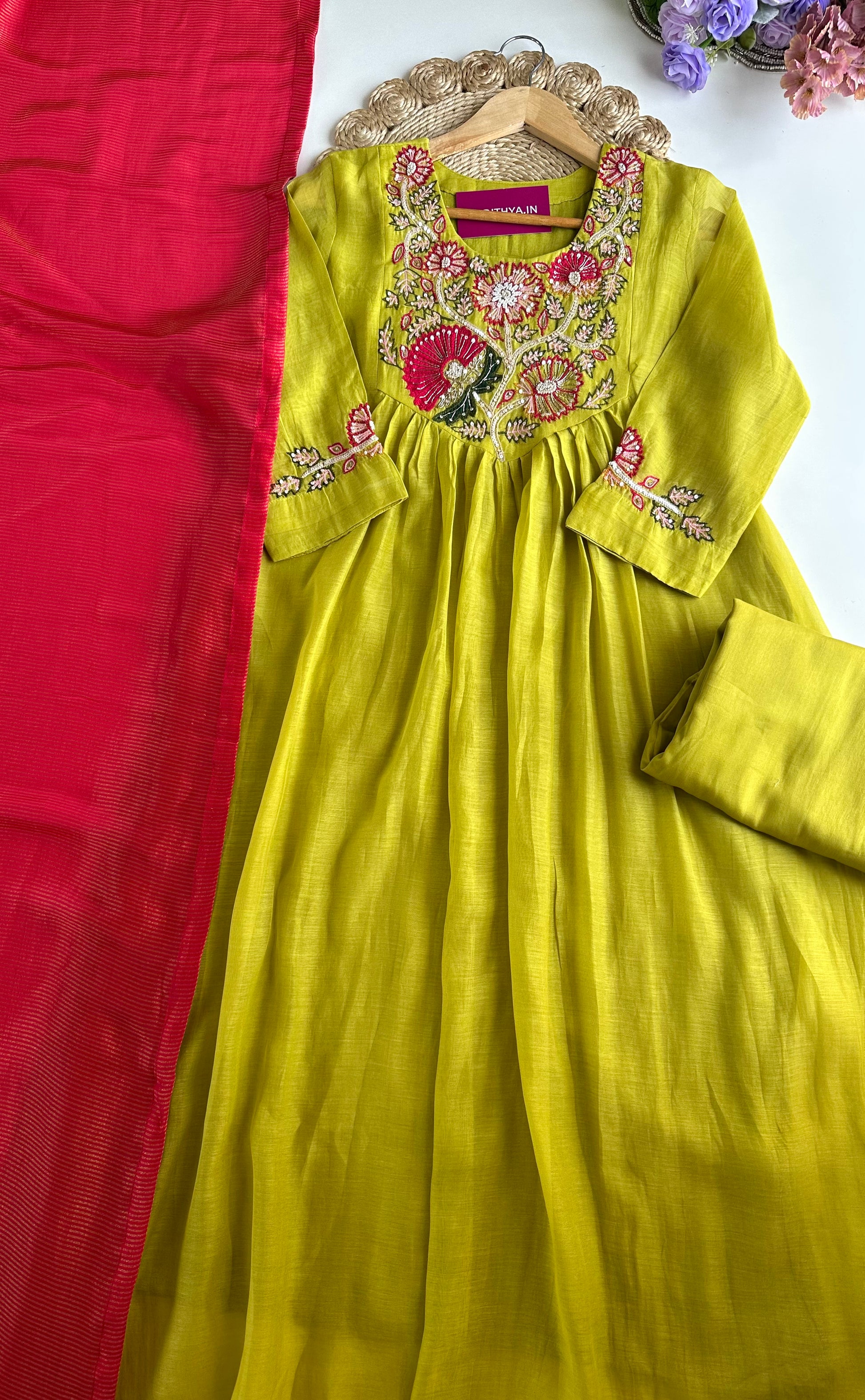 Expertly handcrafted from Mul Chanderi fabric, this Aline Kurti comes with matching pants and dupatta for a complete, elegant look. The intricate handwork adds a touch of traditional charm to this modern ensemble. Elevate your style with the luxury and comfort of this beautifully designed outfit.