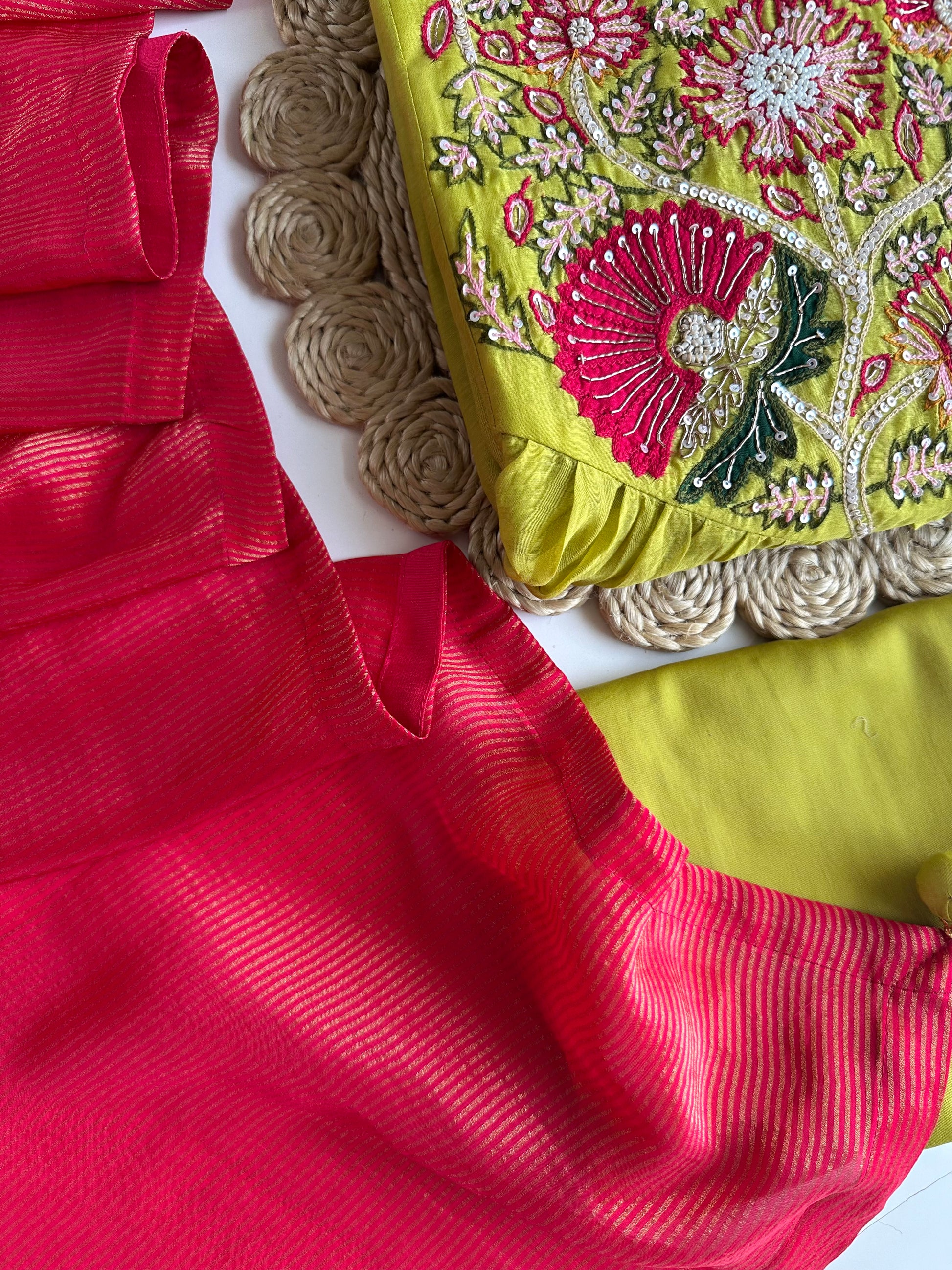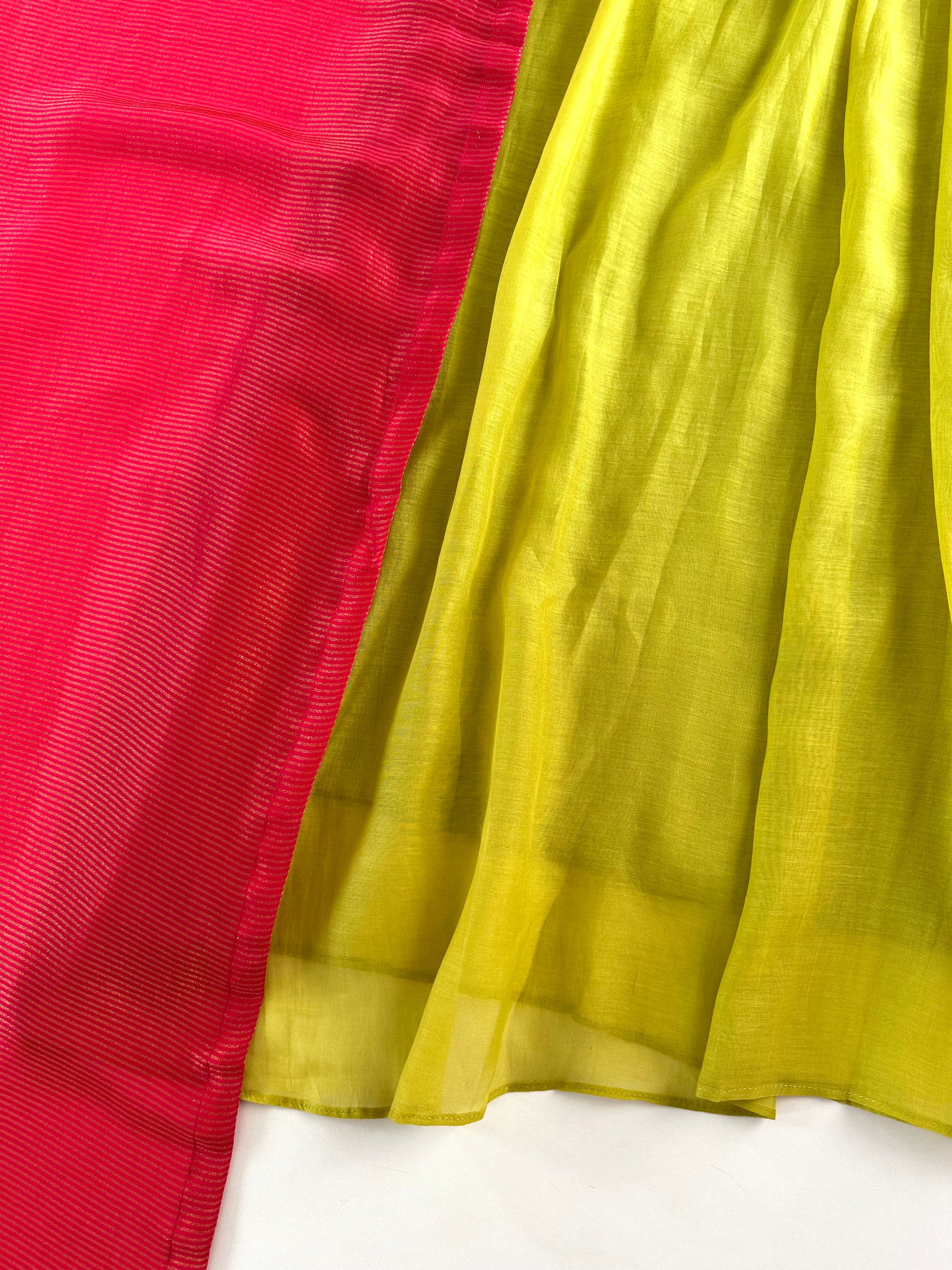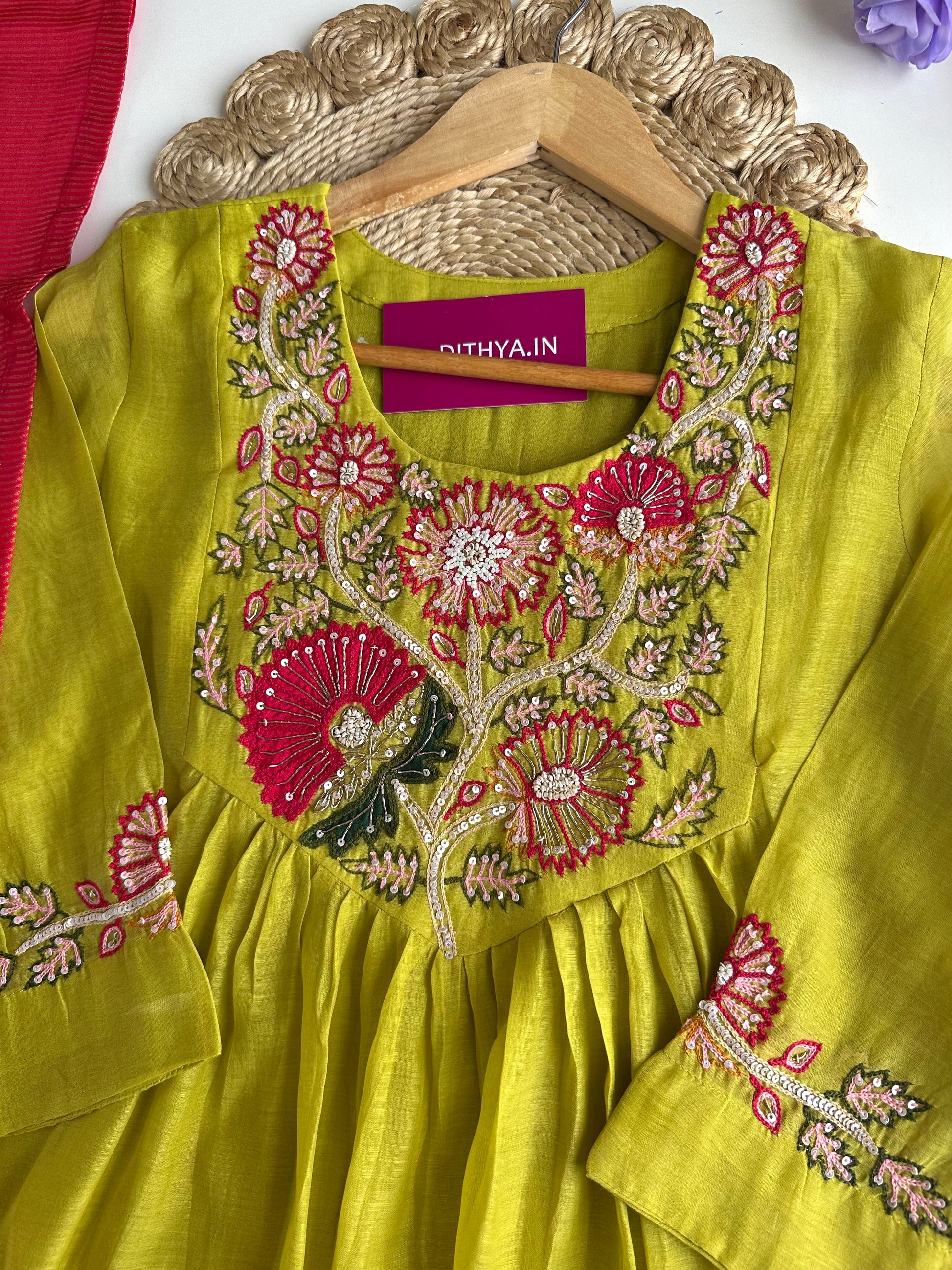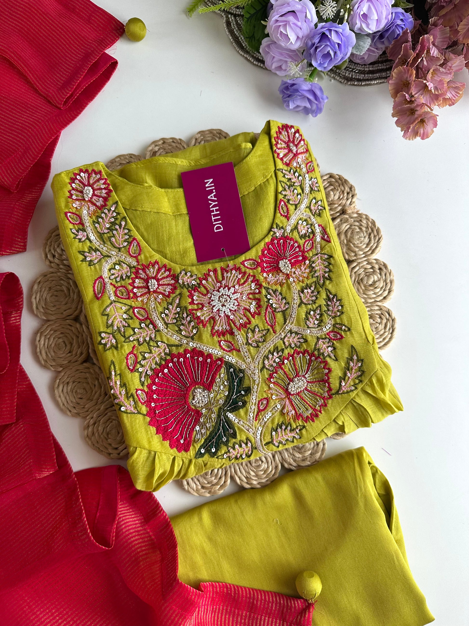 Expertly handcrafted from Mul Chanderi fabric, this Aline Kurti comes with matching pants and dupatta for a complete, elegant look. The intricate handwork adds a touch of traditional charm to this modern ensemble. Elevate your style with the luxury and comfort of this beautifully designed outfit.