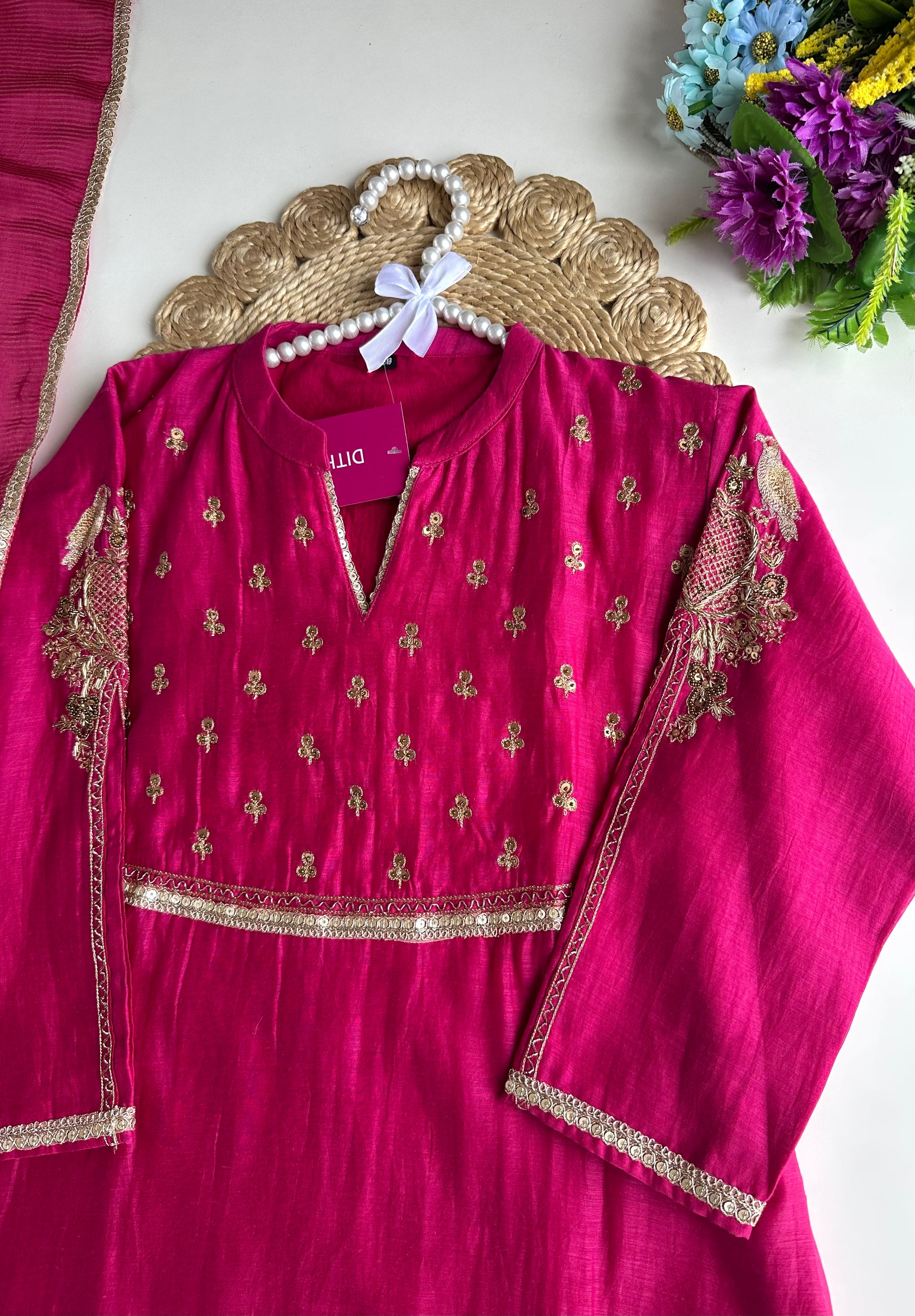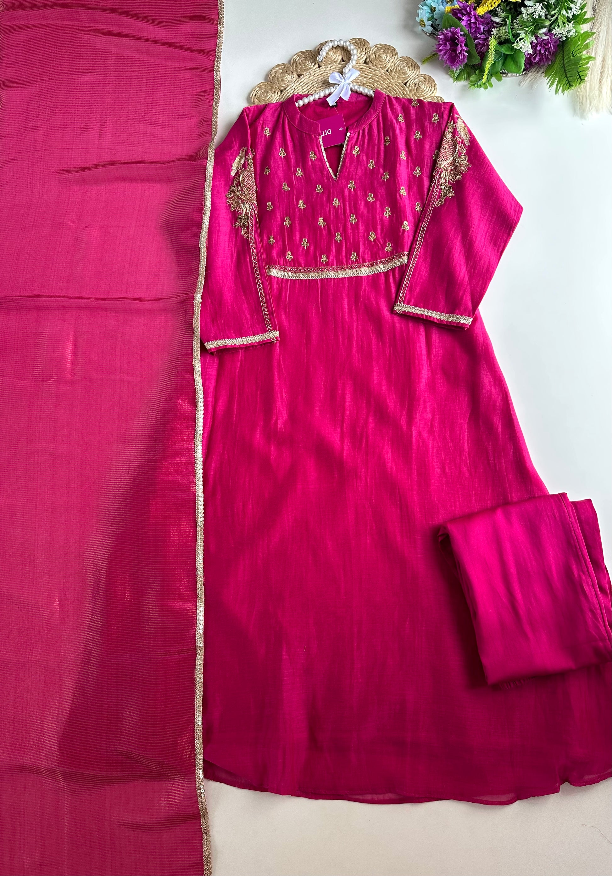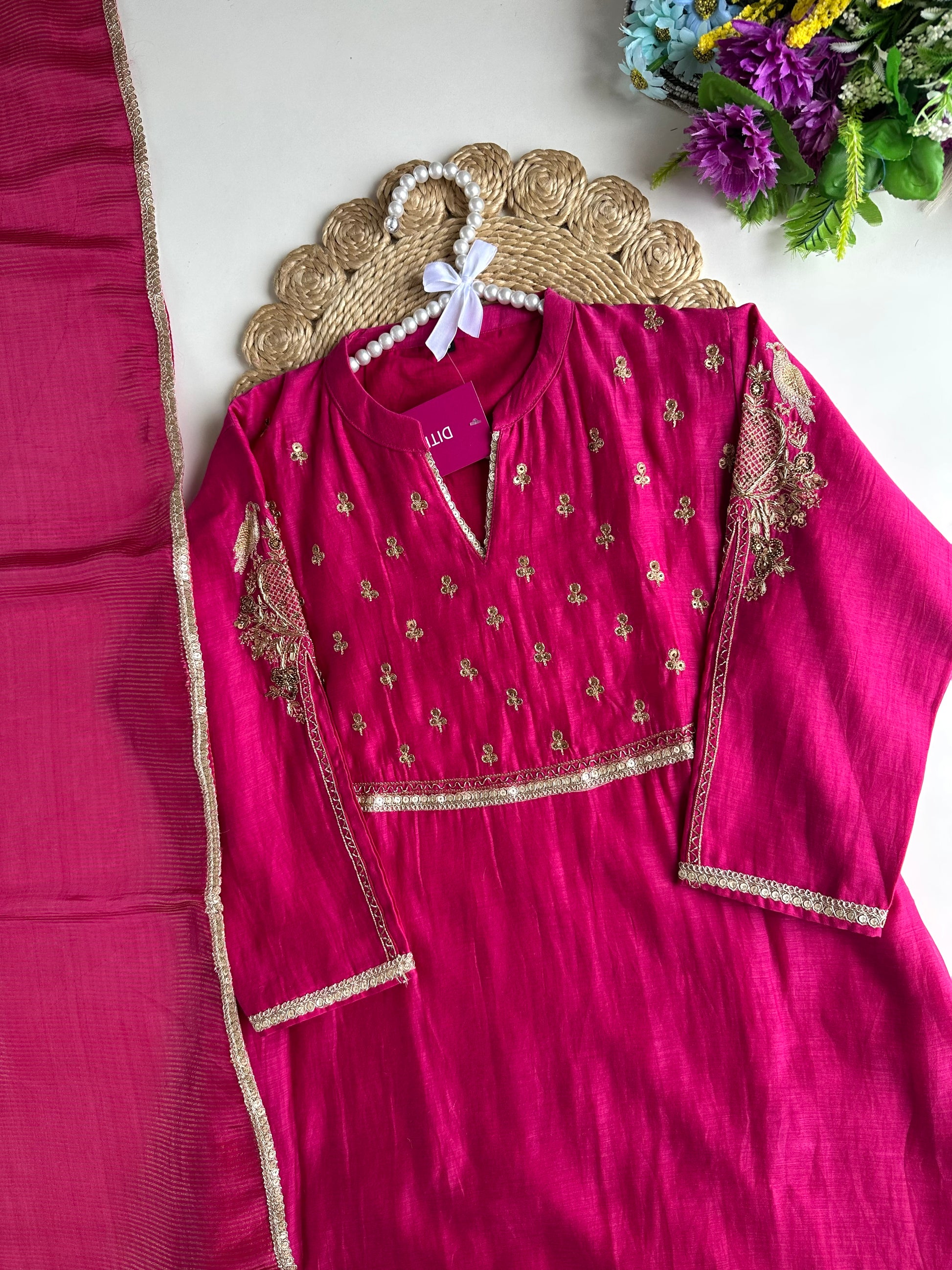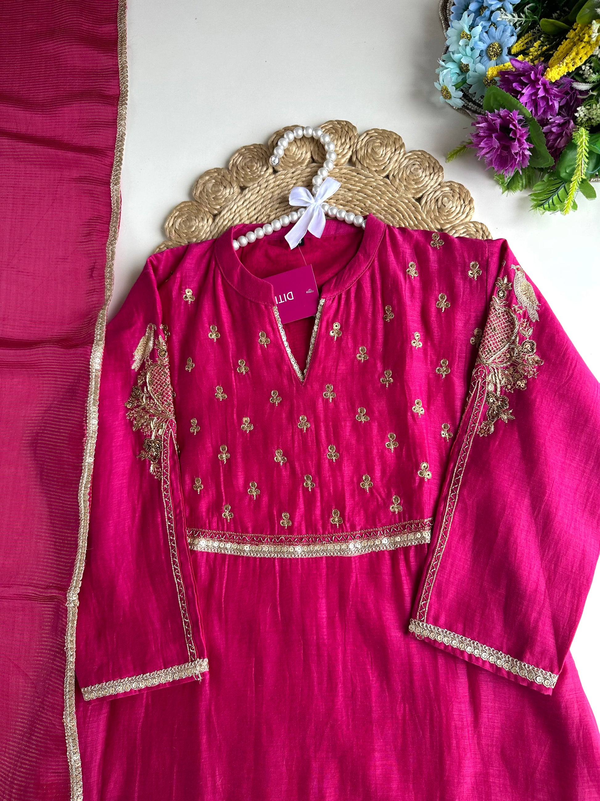 K013 - Mul Chanderi handwork Aline Kurti with pants and dupatta