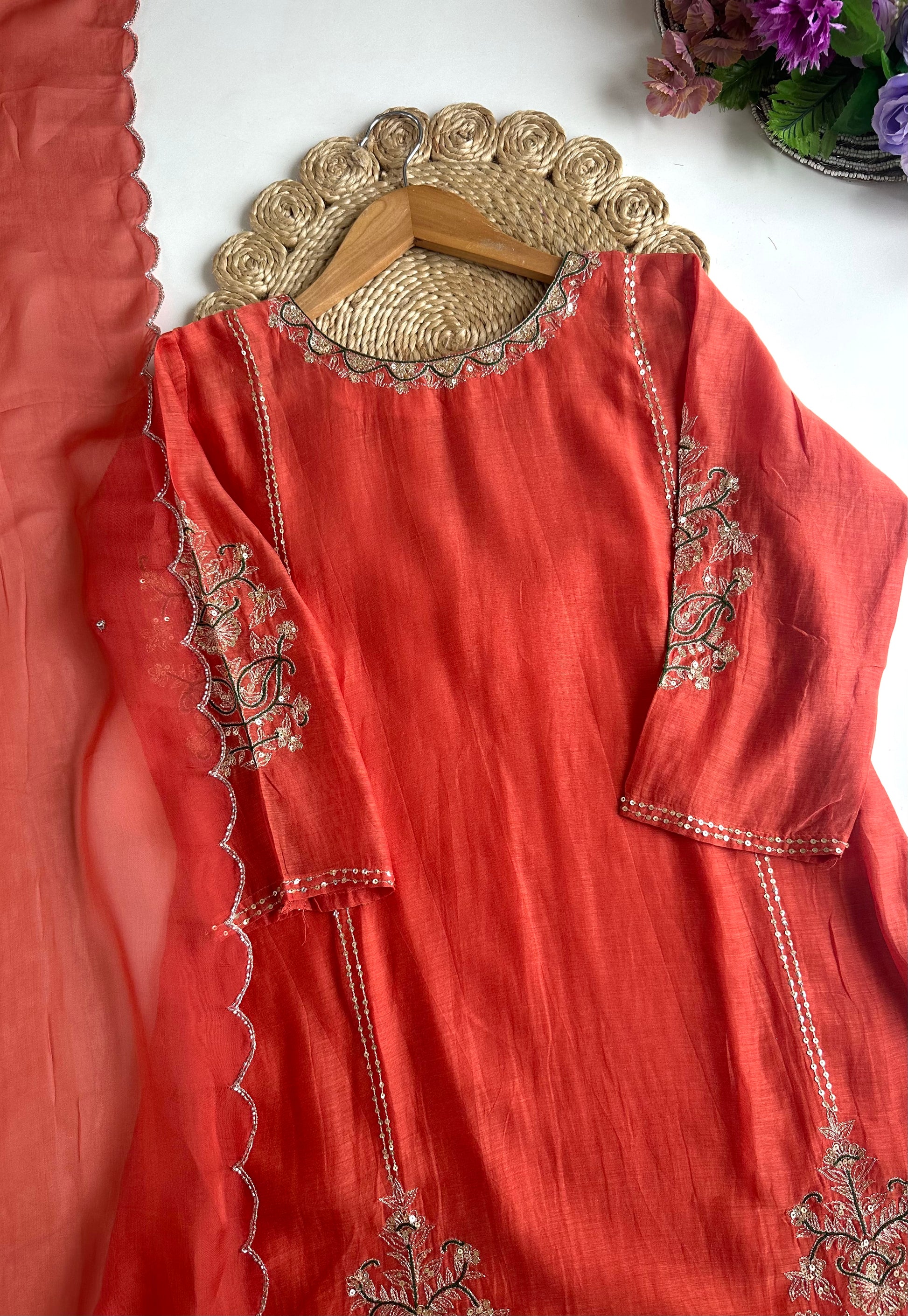 Expertly crafted with handwork detailing, our Mul Chanderi Aline Kurti comes with a matching pair of pants and a dupatta. Made from high-quality fabric, this ensemble exudes elegance and sophistication. Elevate your style with this timeless piece.