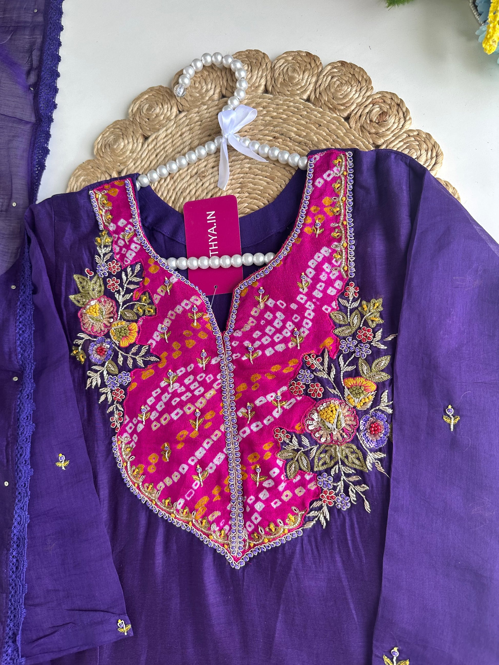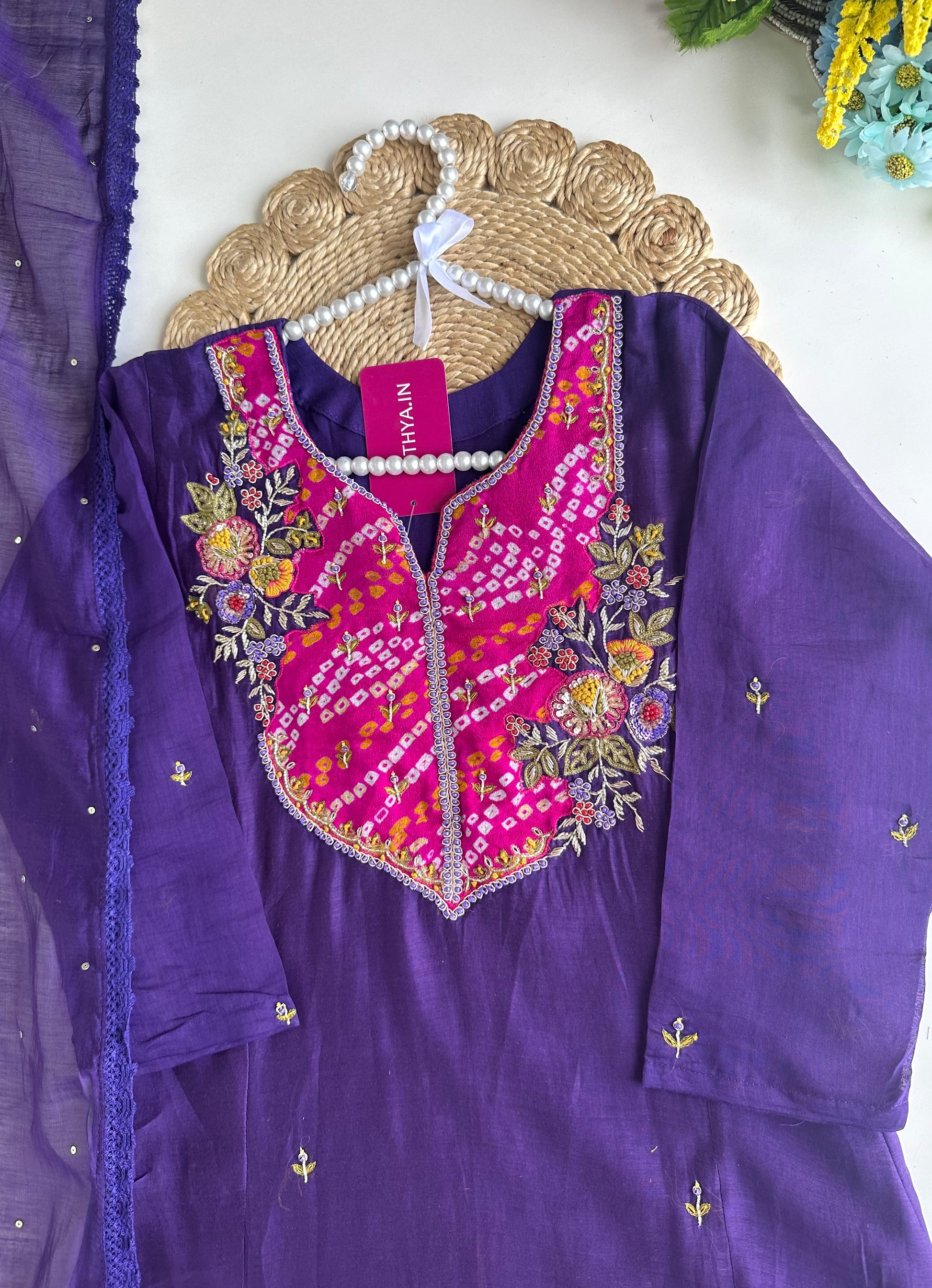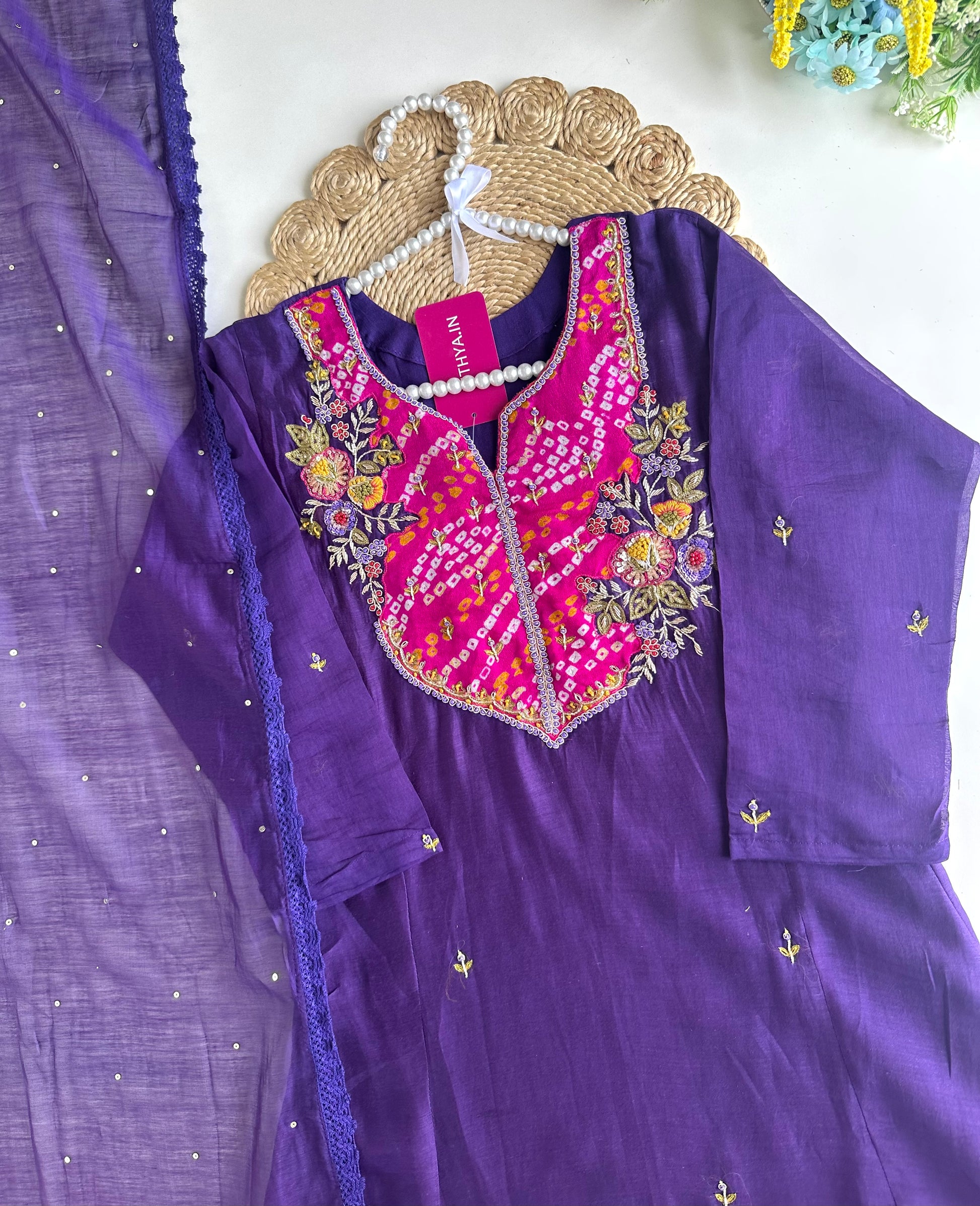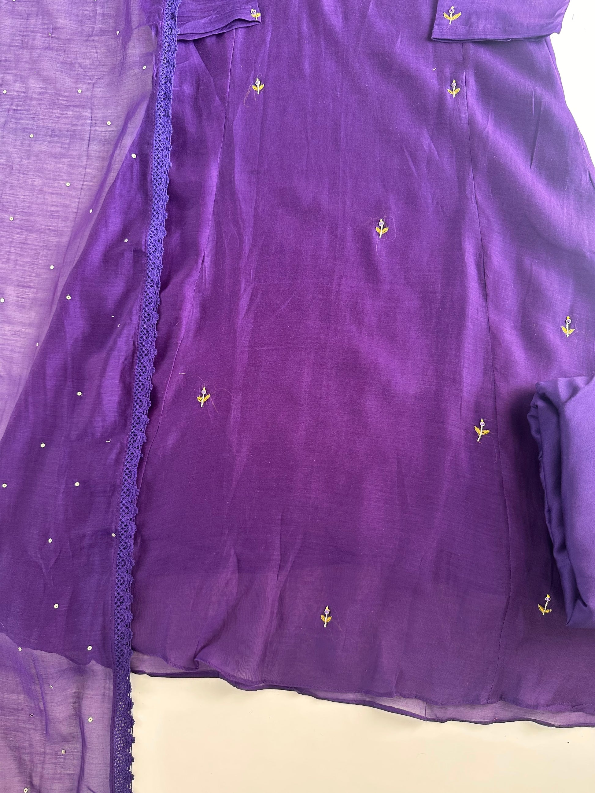 K085 - Mul Chanderi Handwork Aline Kurti with pants and dupatta