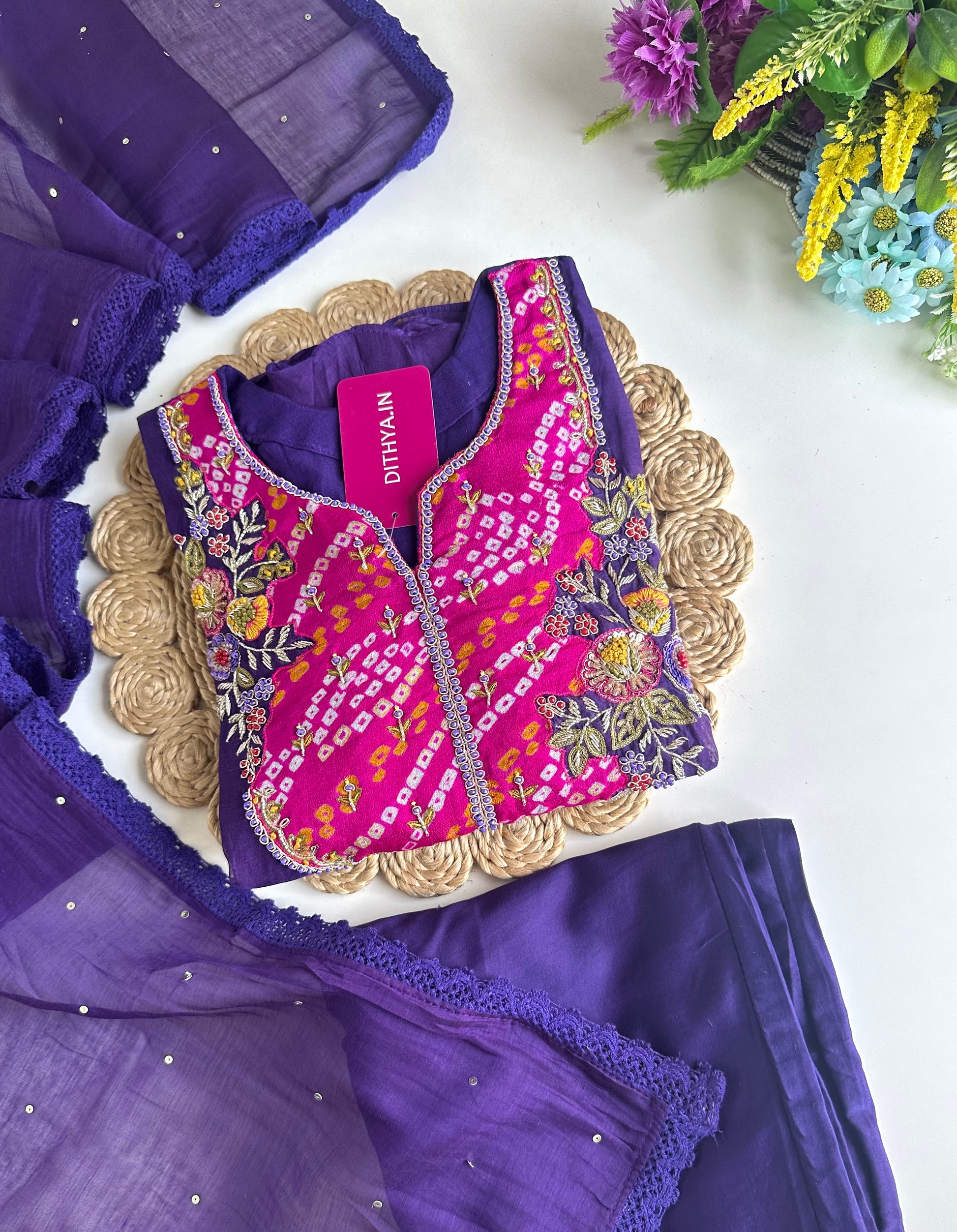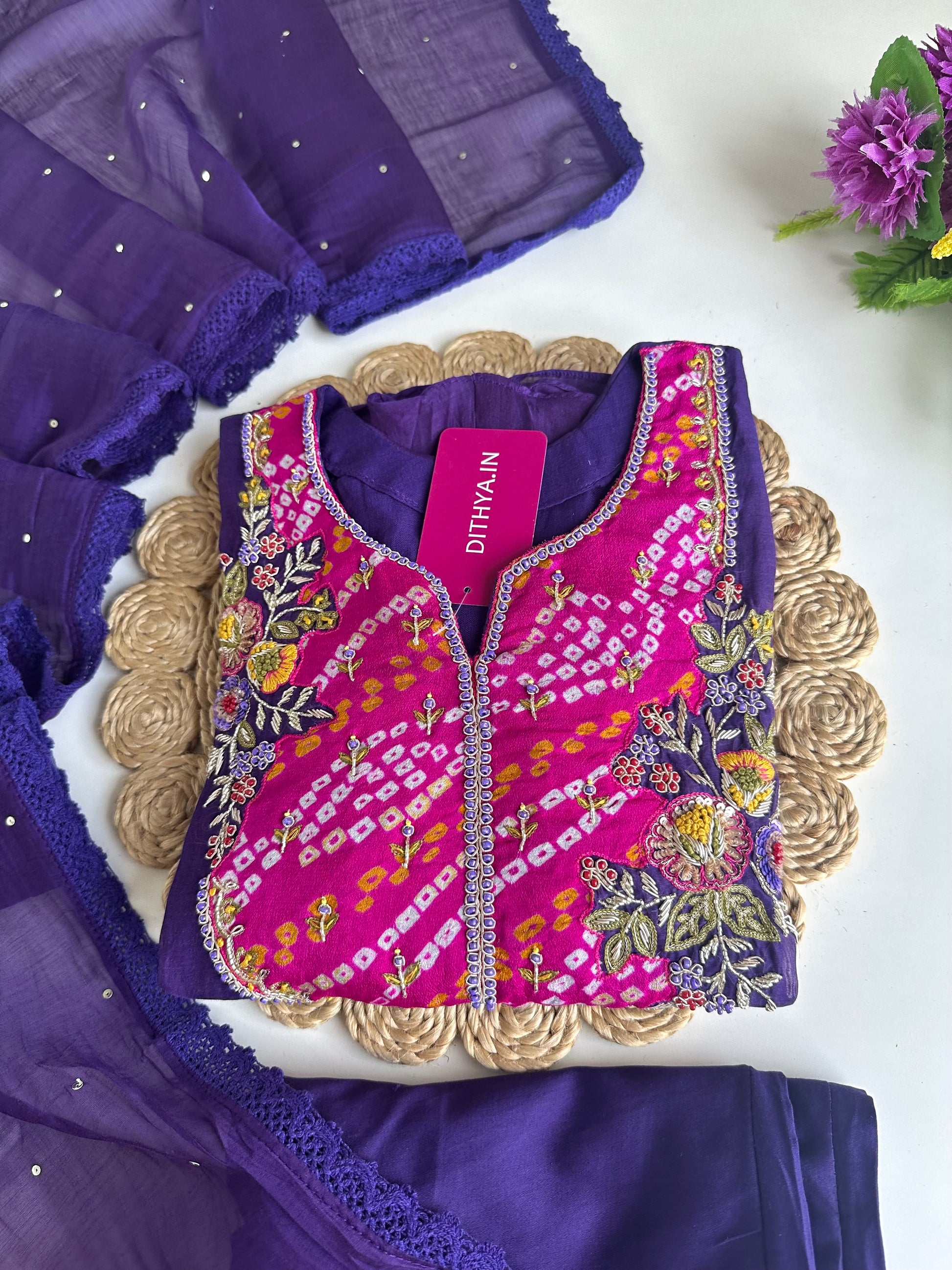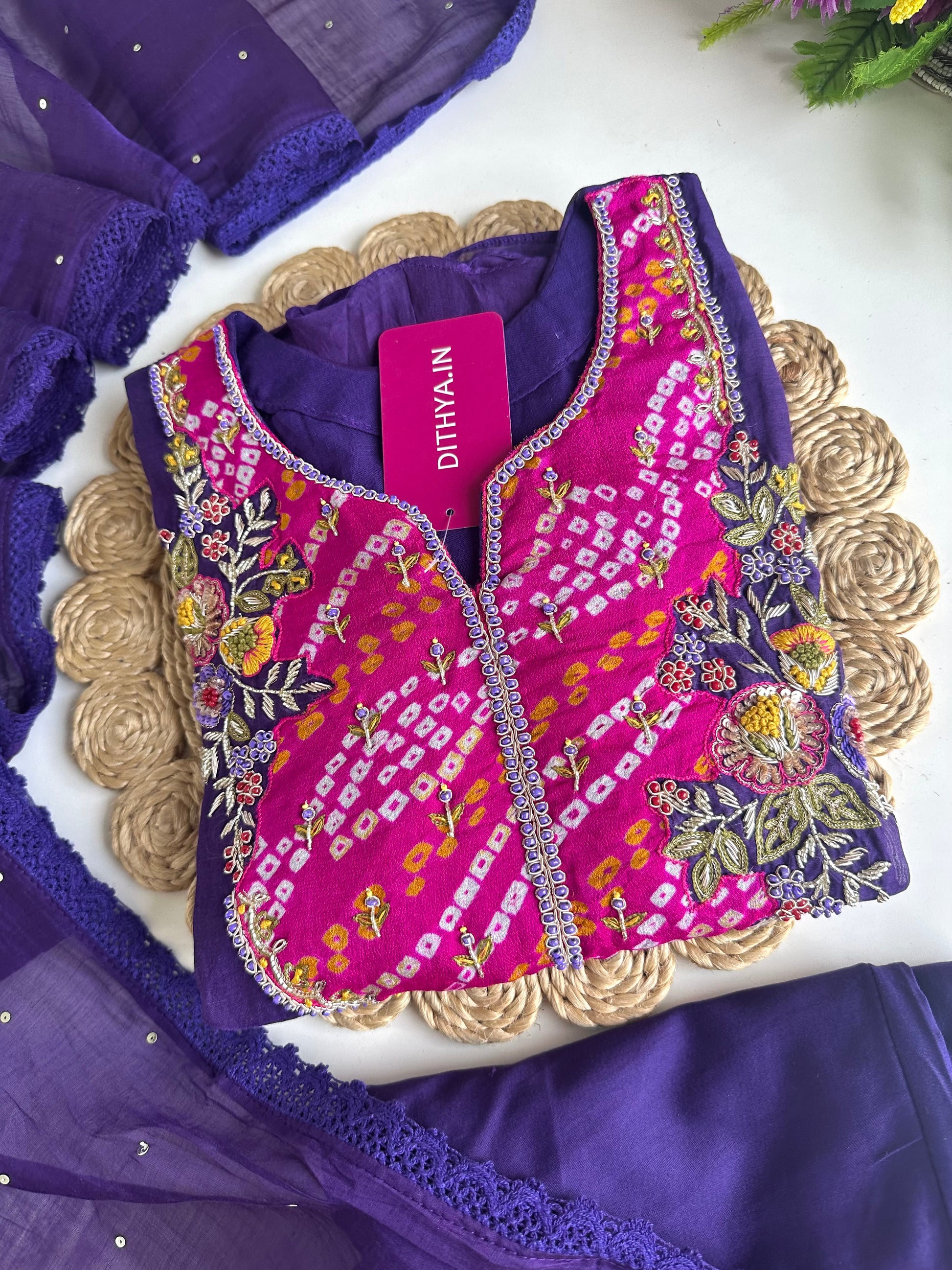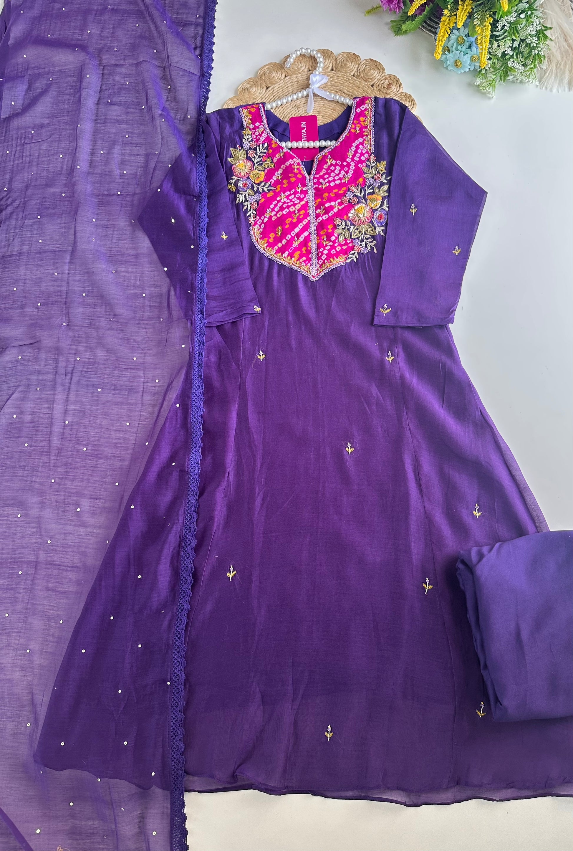 K085 - Mul Chanderi Handwork Aline Kurti with pants and dupatta