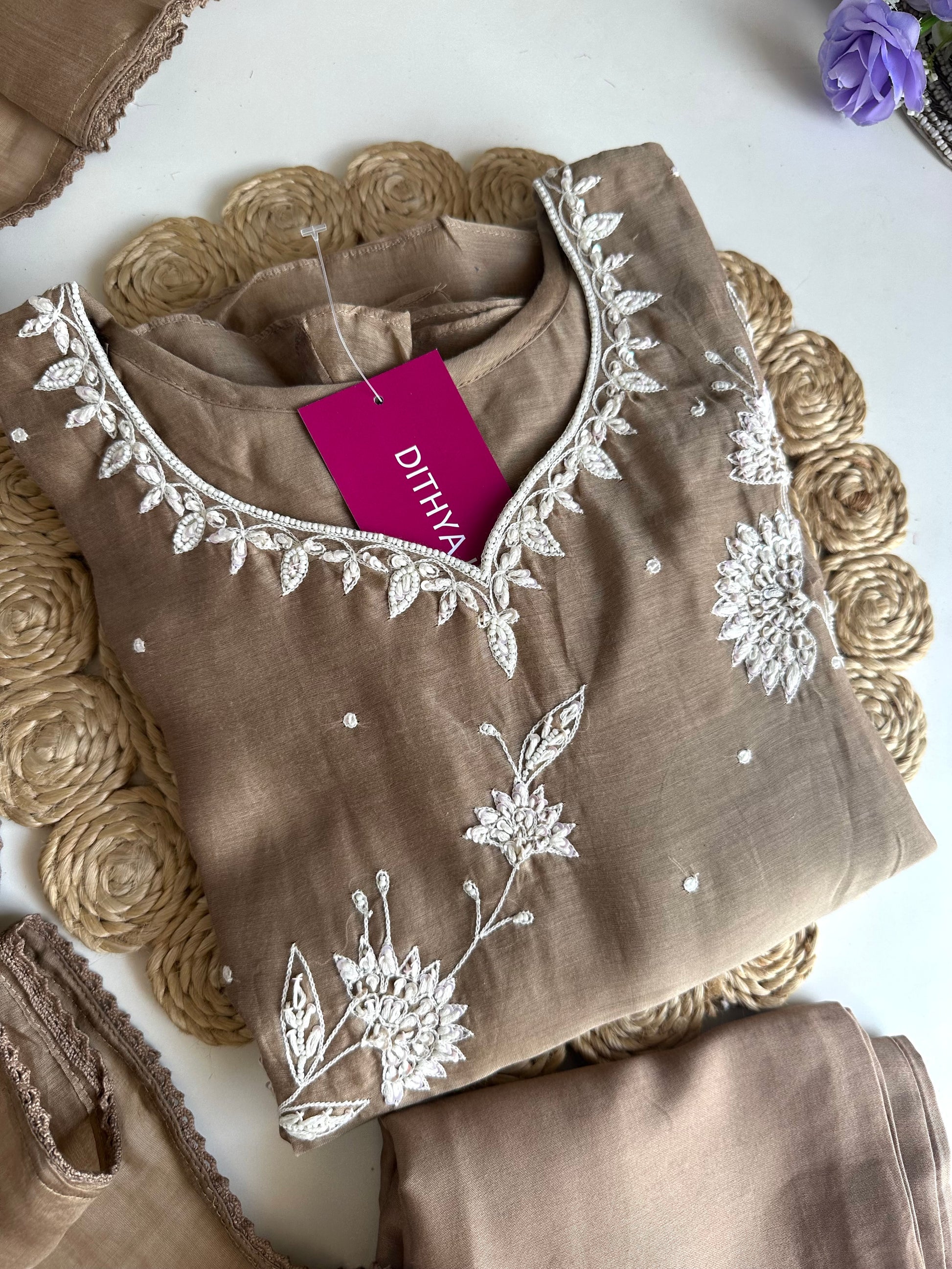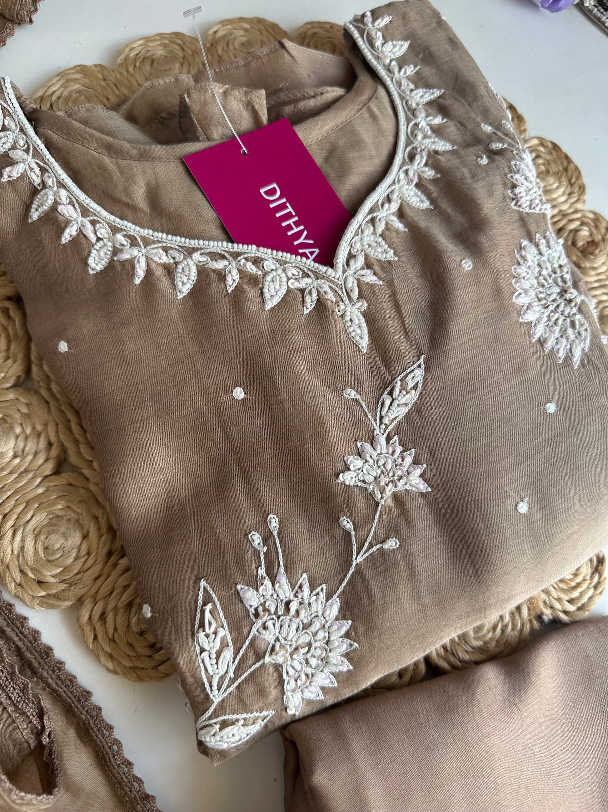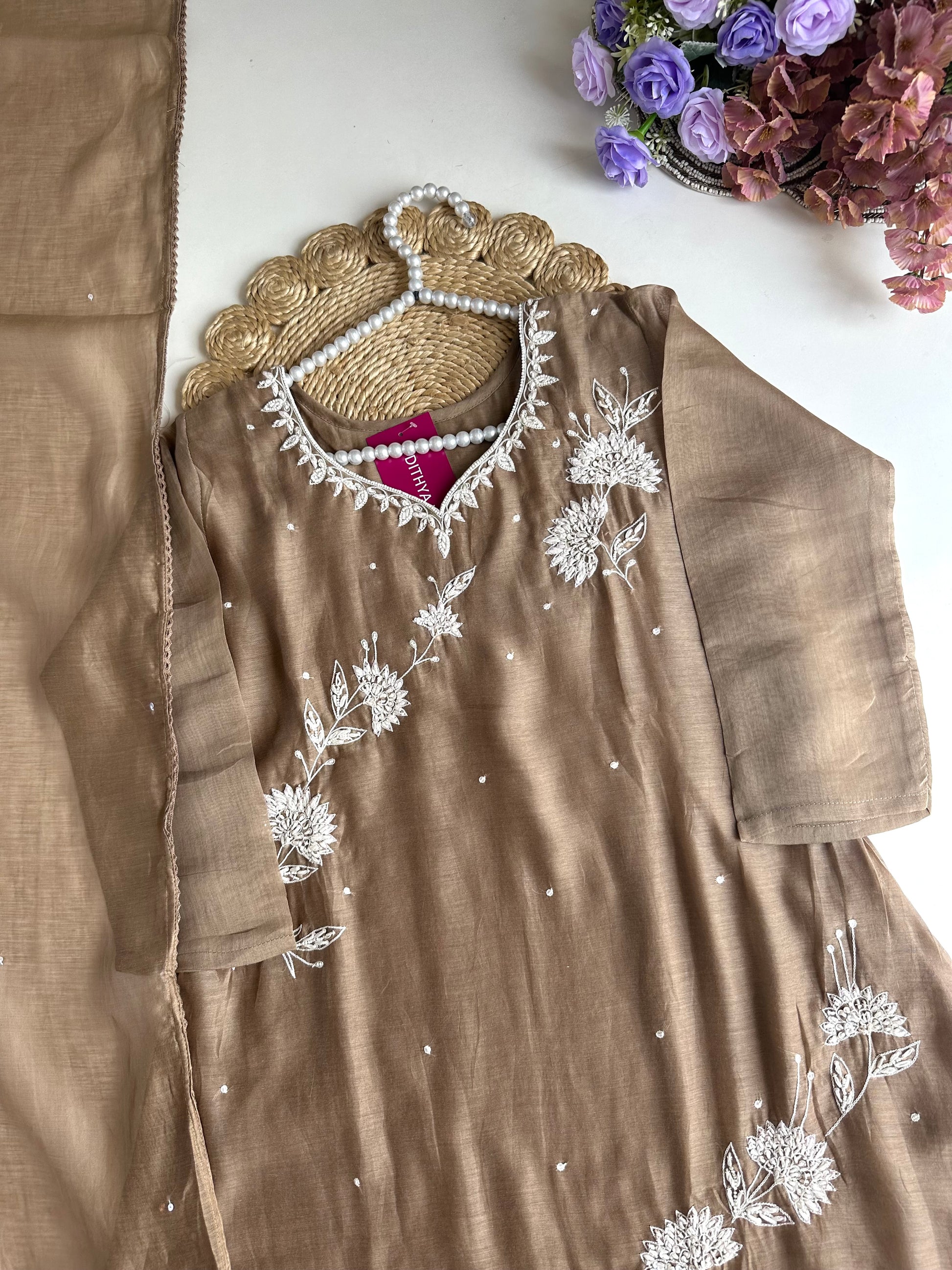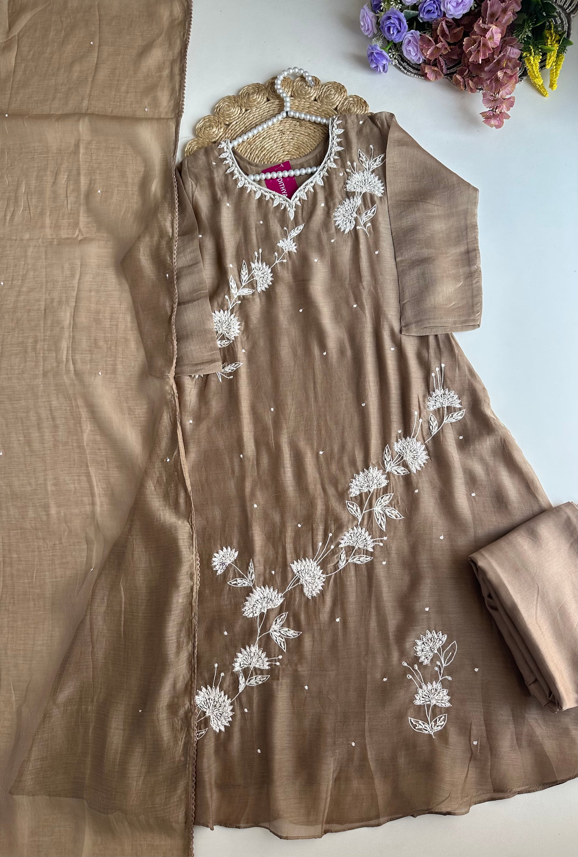 K079 - Mul Chanderi Handwork Aline Kurti with pants and dupatta