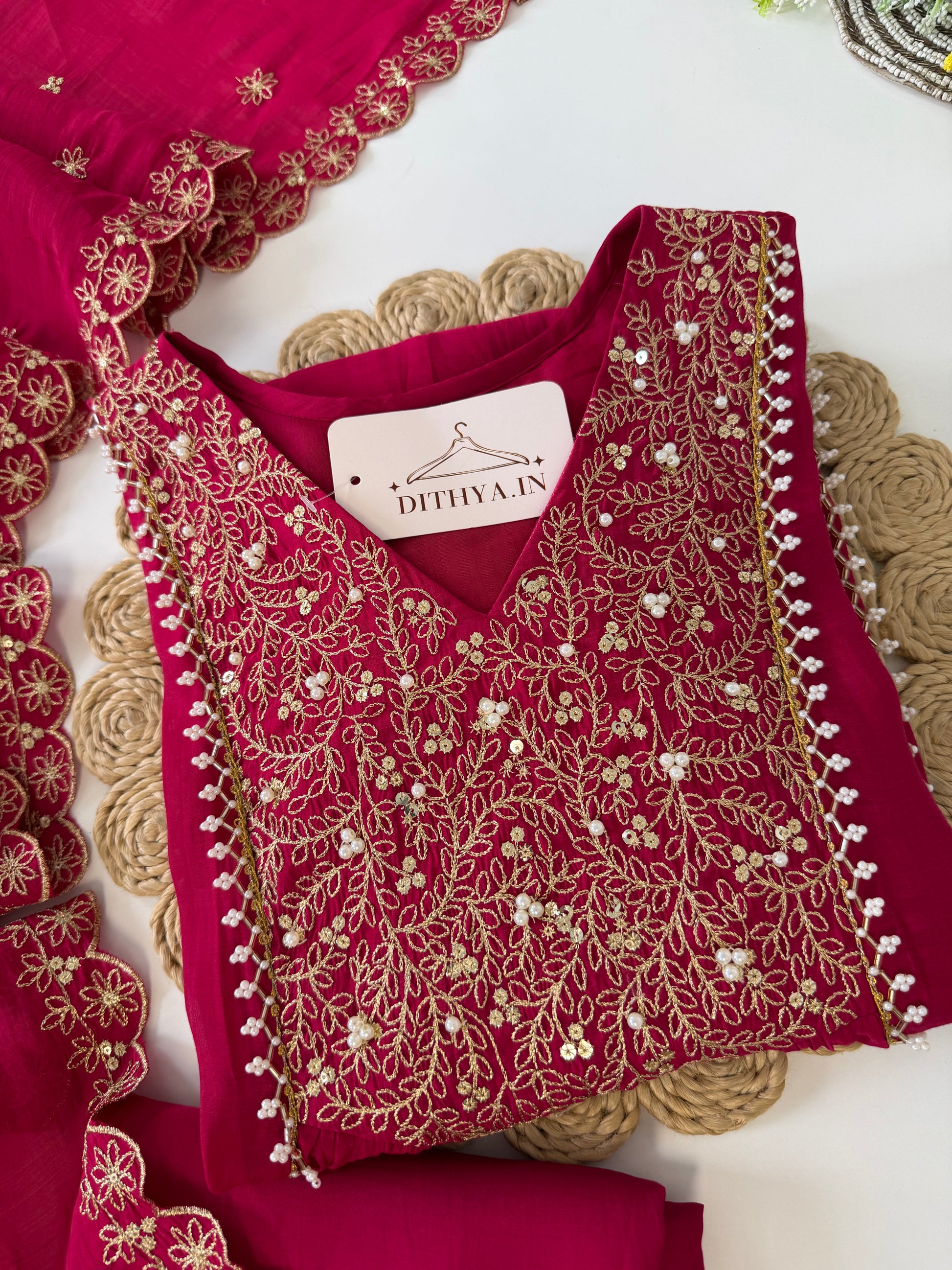 K535 - Mul chanderi handwork Aline Kurti with pants and dupatta