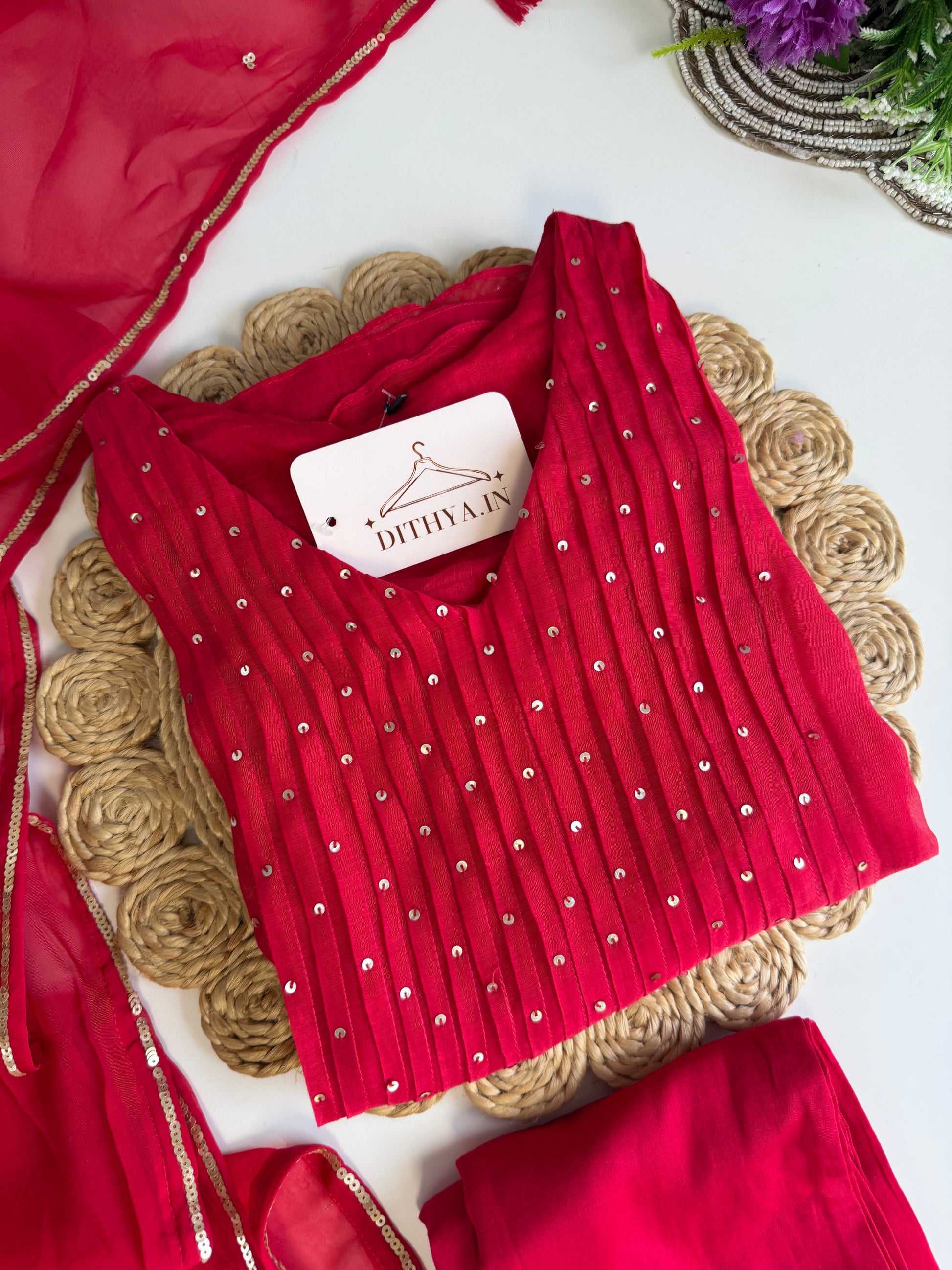 Expertly crafted from Mul chanderi fabric, this Aline Kurti boasts intricate handwork details. Paired with comfortable pants and a matching dupatta, this ensemble exudes elegance and sophistication. Elevate your wardrobe with this timeless and versatile piece.
