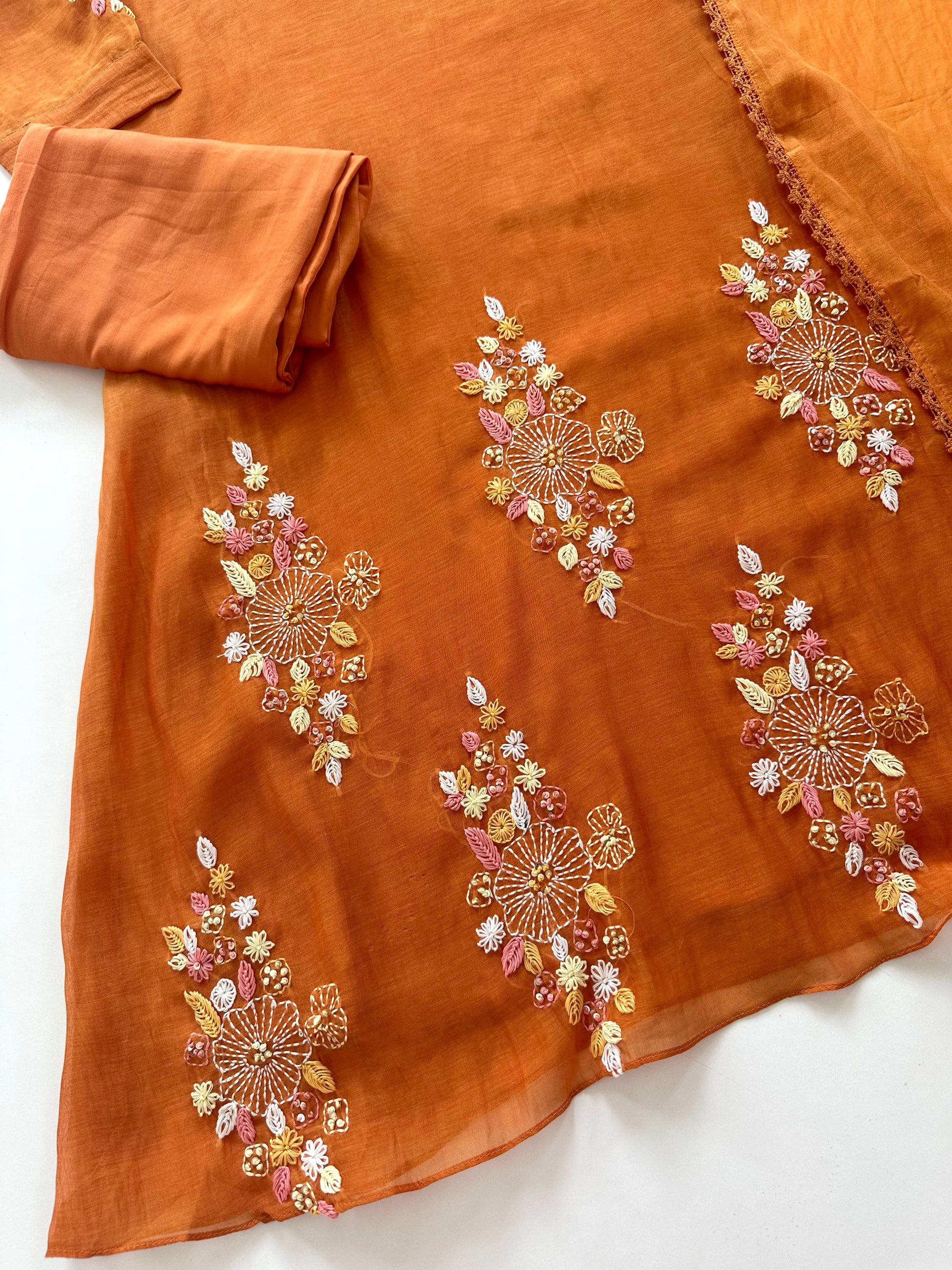 K009 - Mul Chanderi handwork Aline Kurti with pants and dupatta.