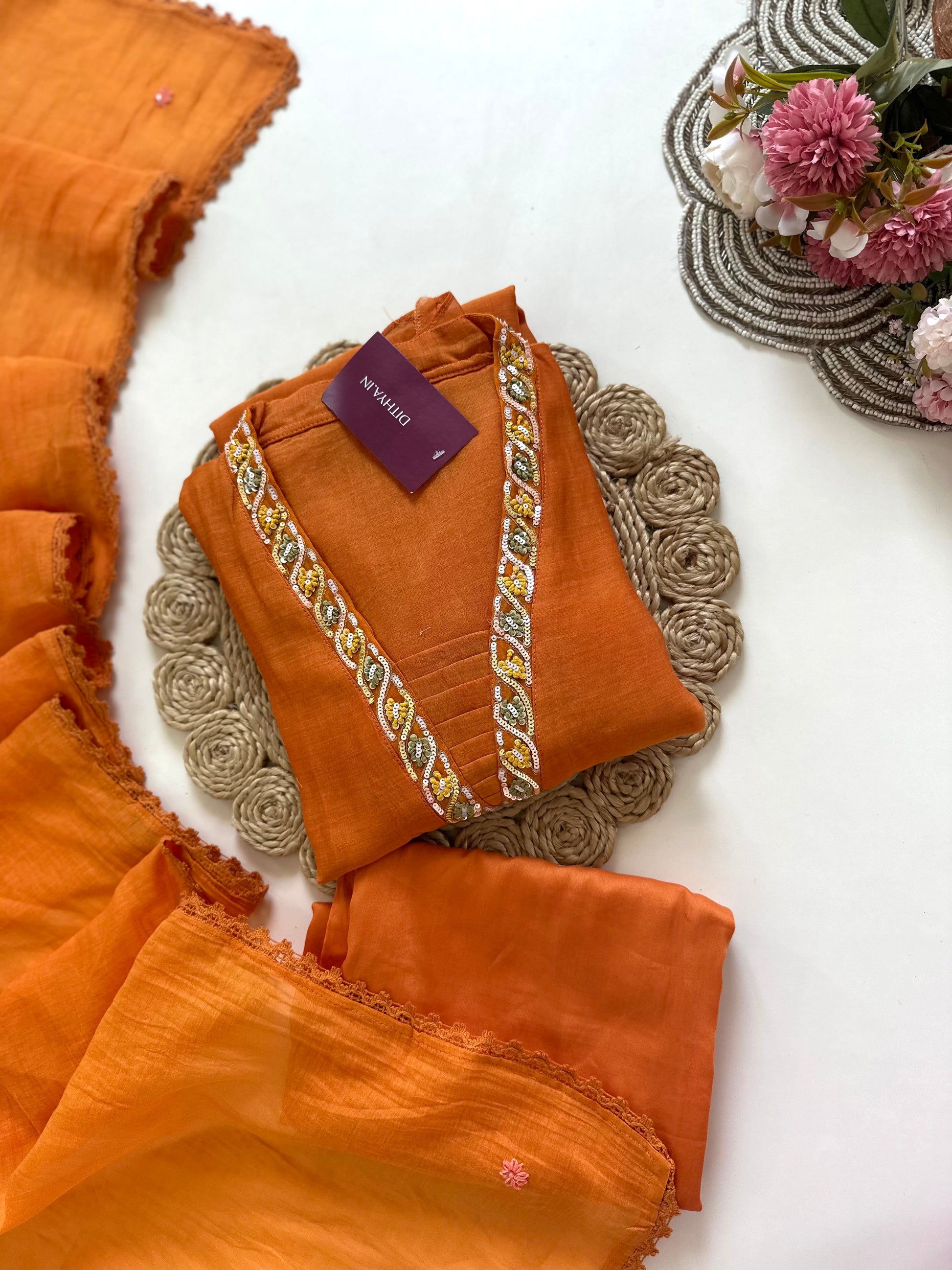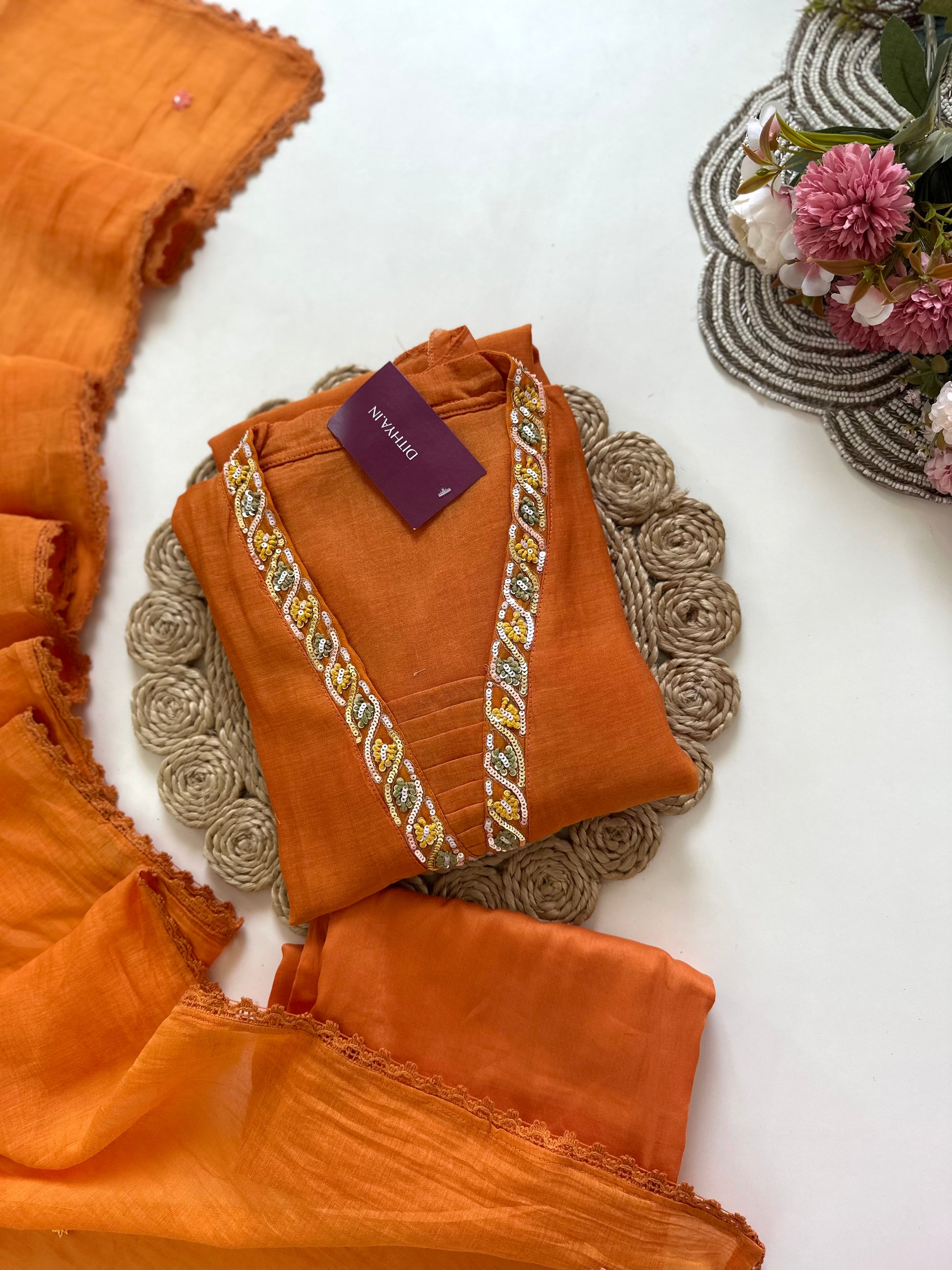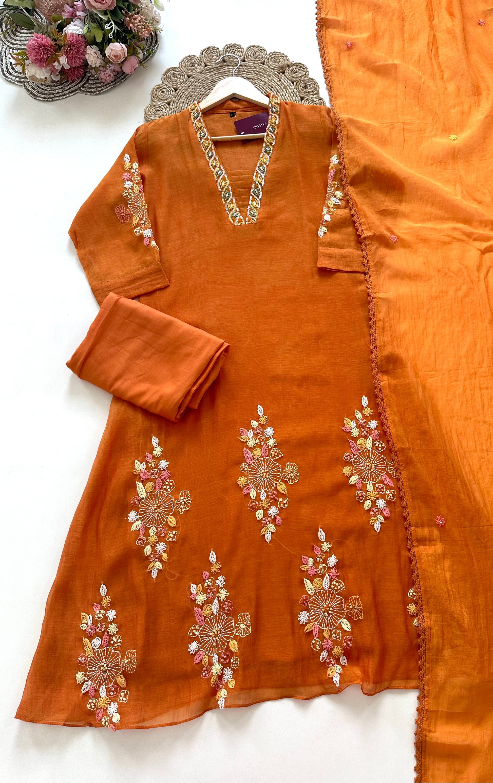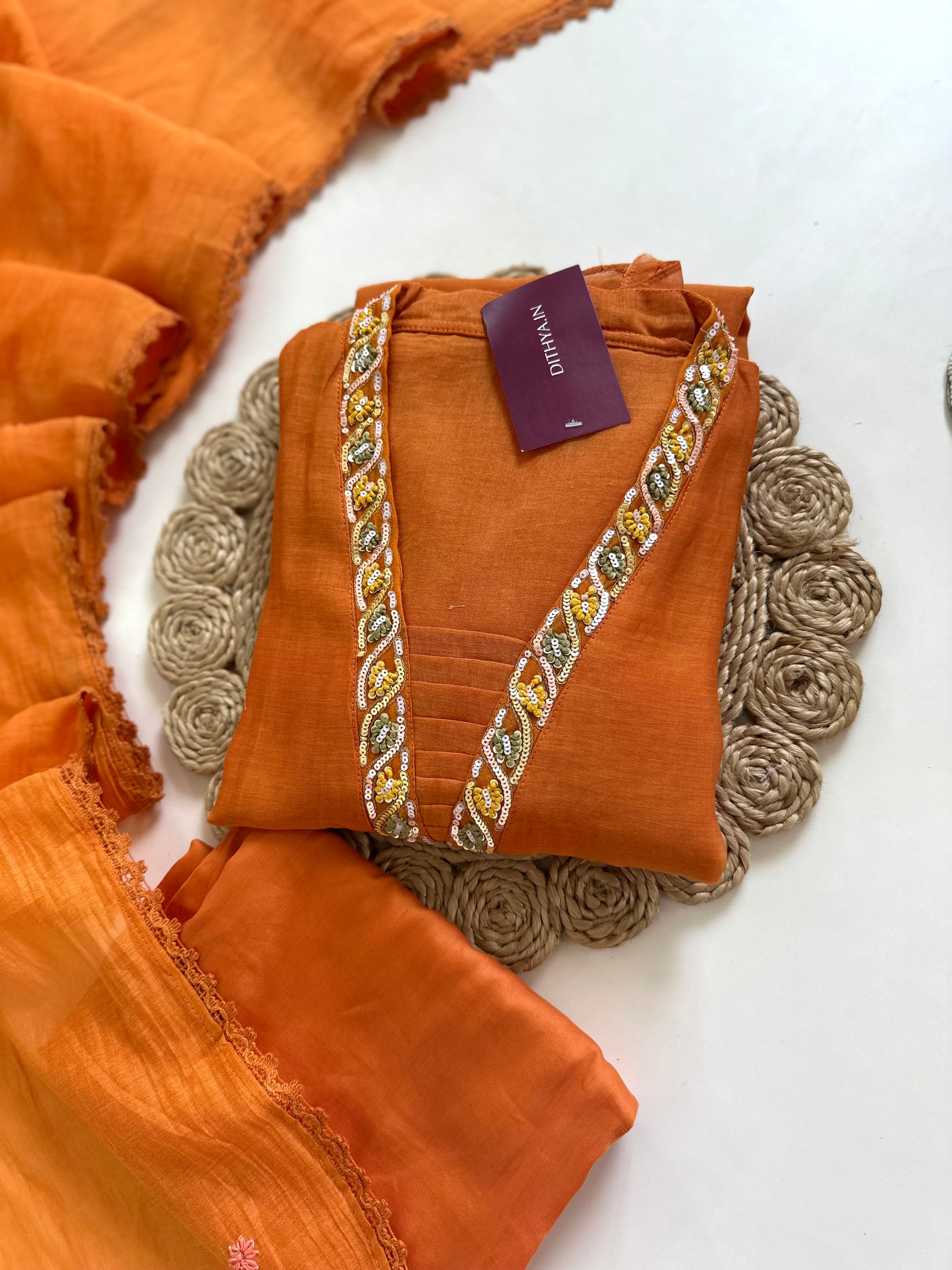 Expertly crafted from Mul Chanderi fabric, this Aline Kurti is adorned with delicate handwork details. Paired with matching pants and a dupatta, this outfit exudes elegance and charm. Perfect for special occasions, this ensemble offers a refined and sophisticated look. Elevate your wardrobe with this timeless and versatile piece.