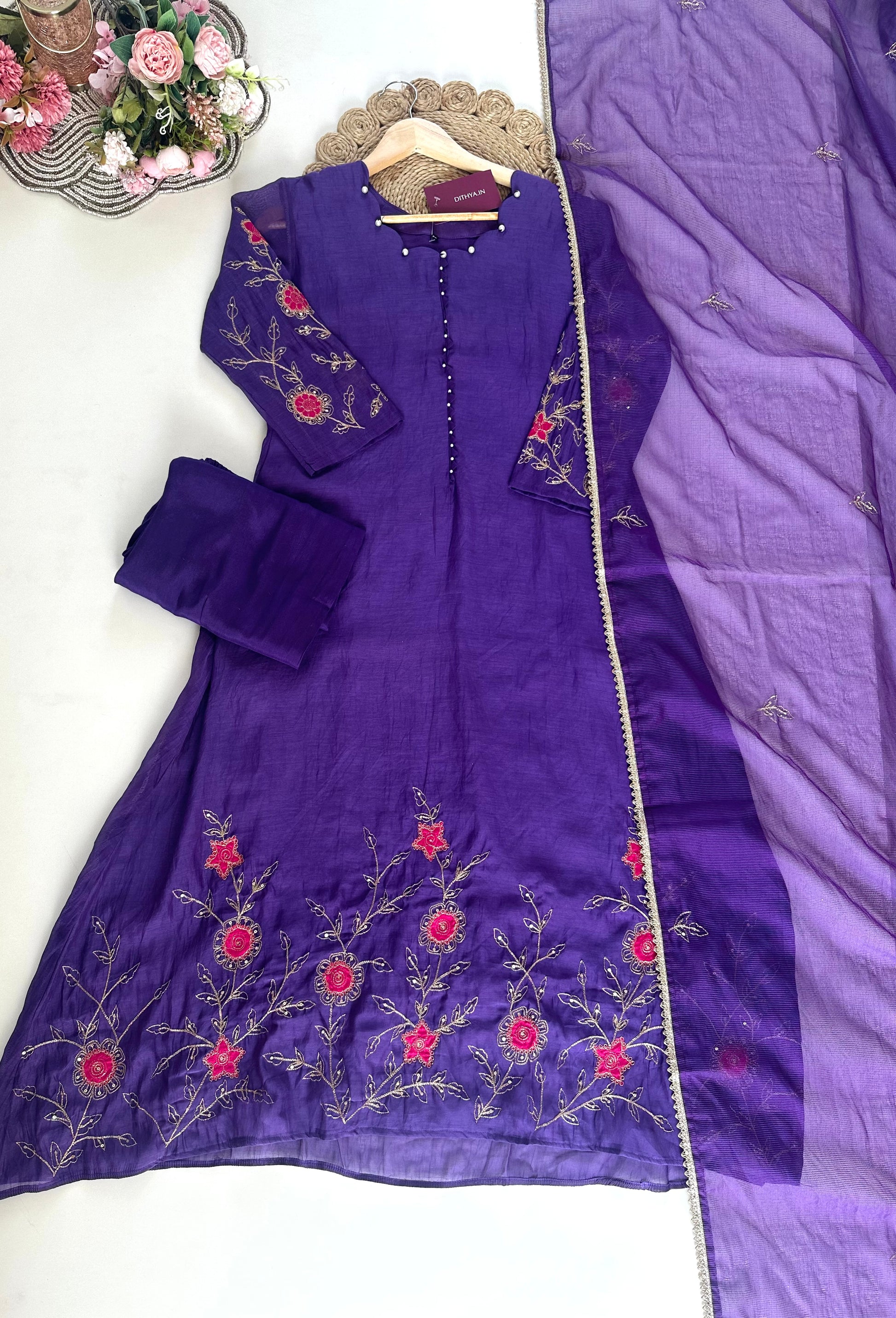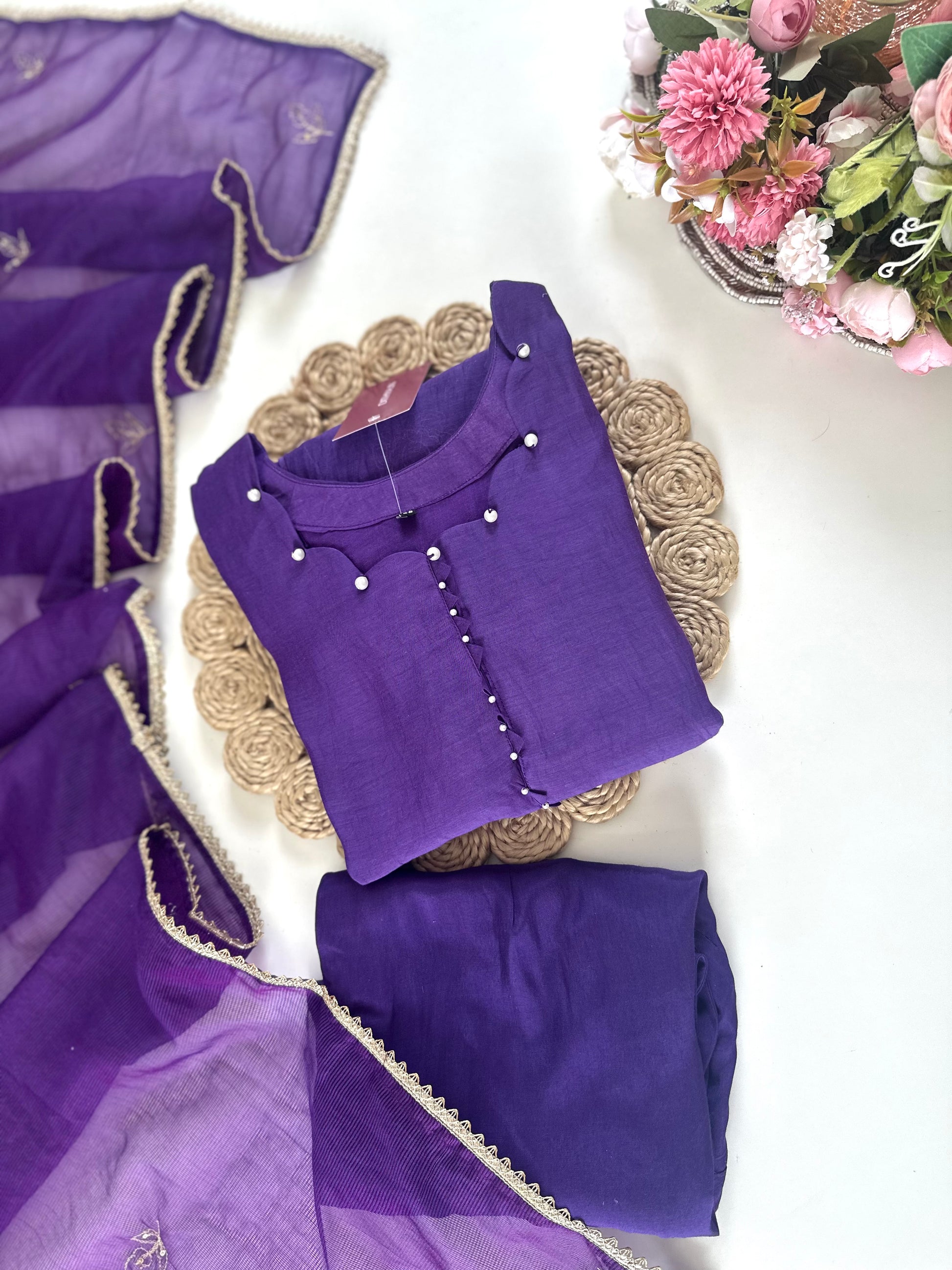 K205 - Mul Chanderi Handwork Aline Kurti with pants and dupatta .