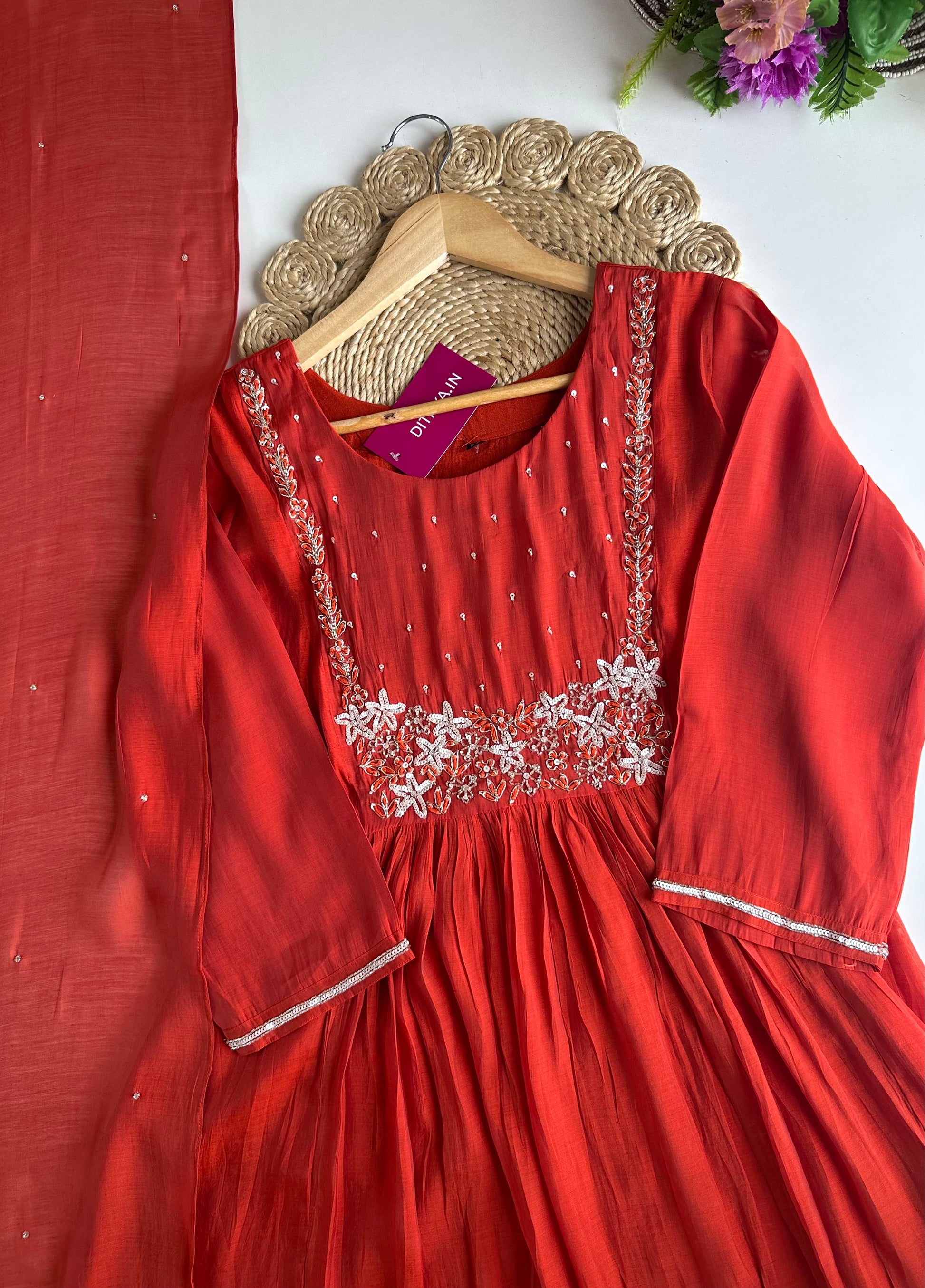 K007 - Mul Chanderi handwork Aline Kurti with pants and dupatta in 2 colours