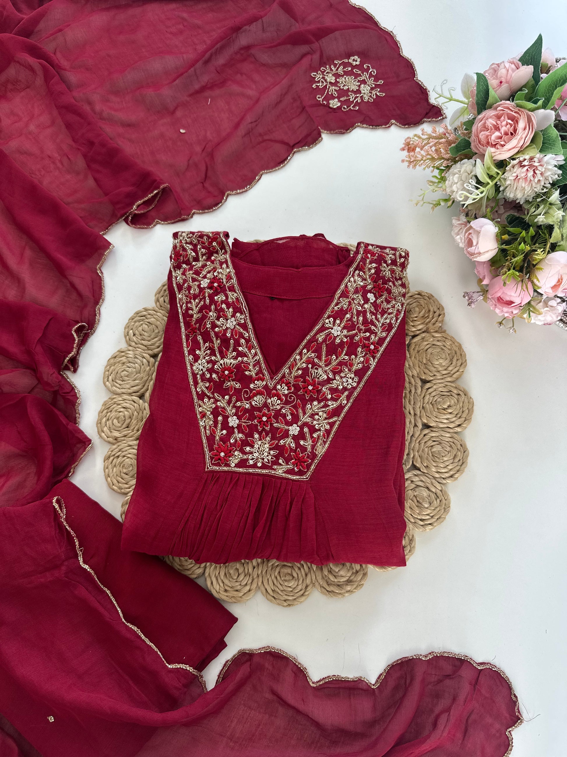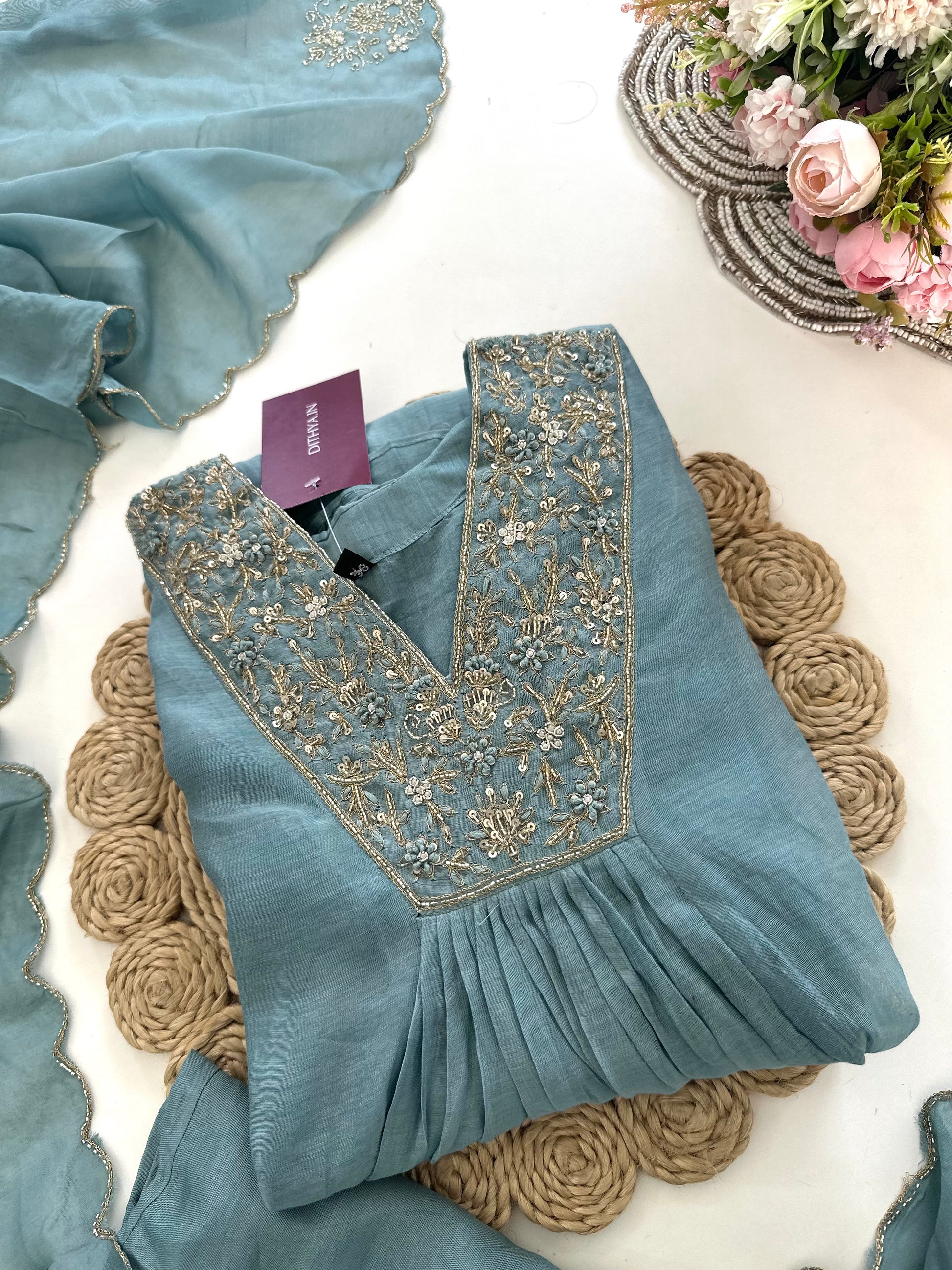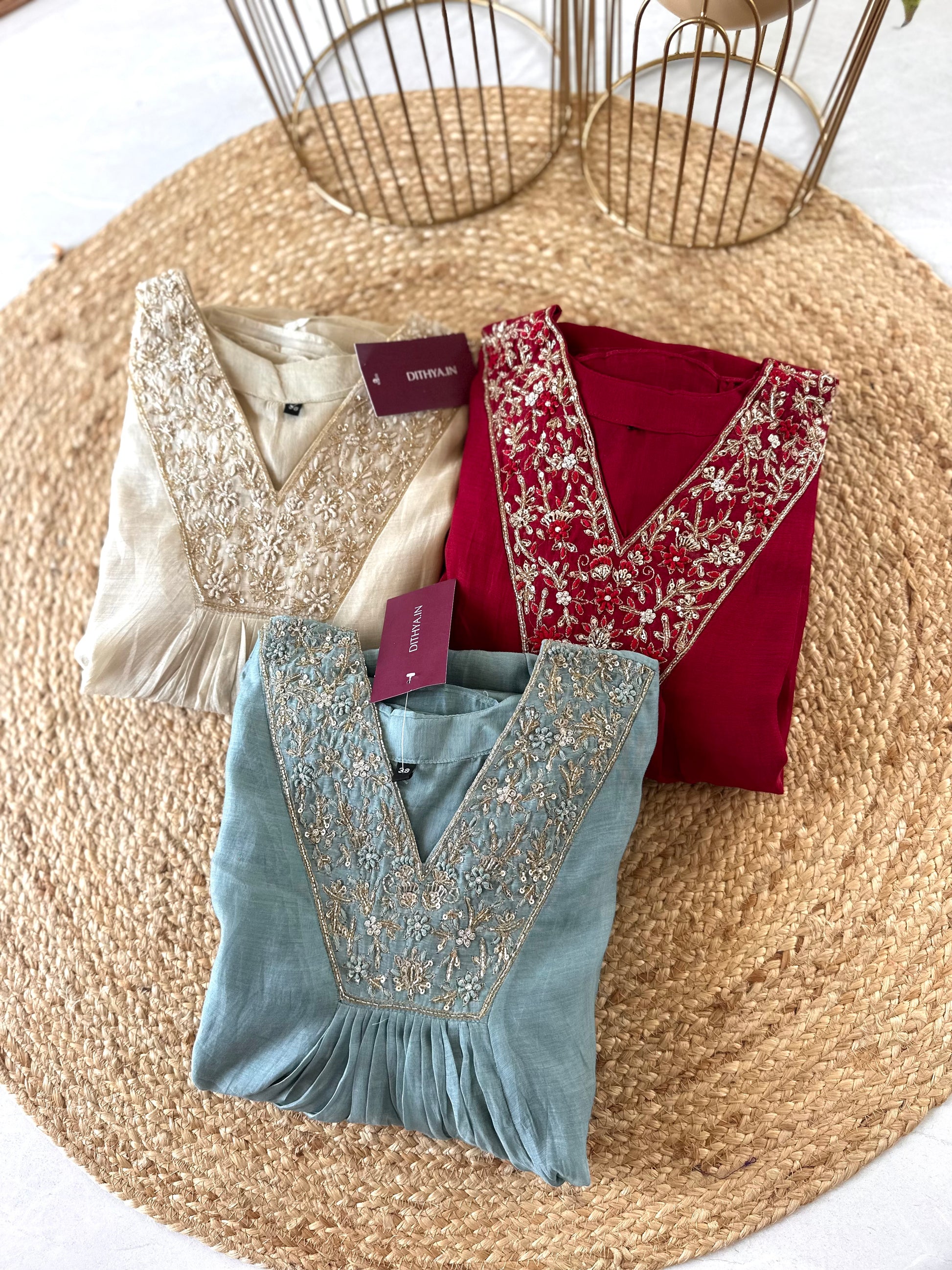 K191 - Mul Chanderi handwork Aline Kurti with pants and dupatta in 3 colours