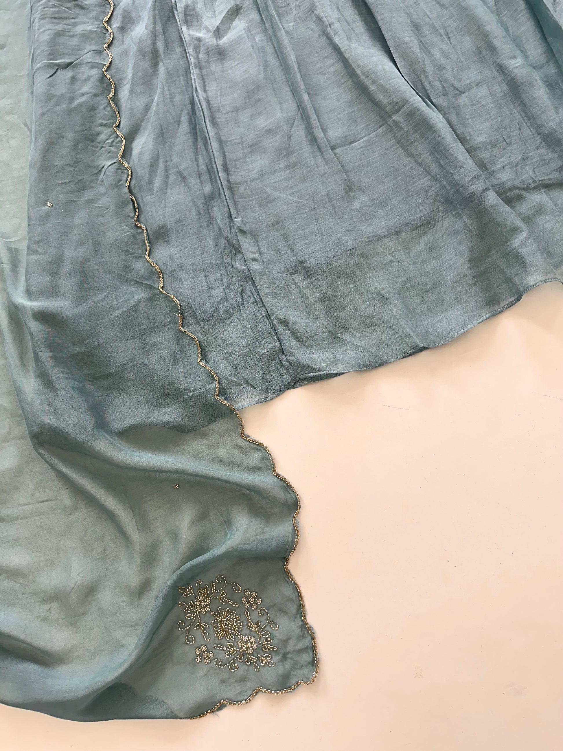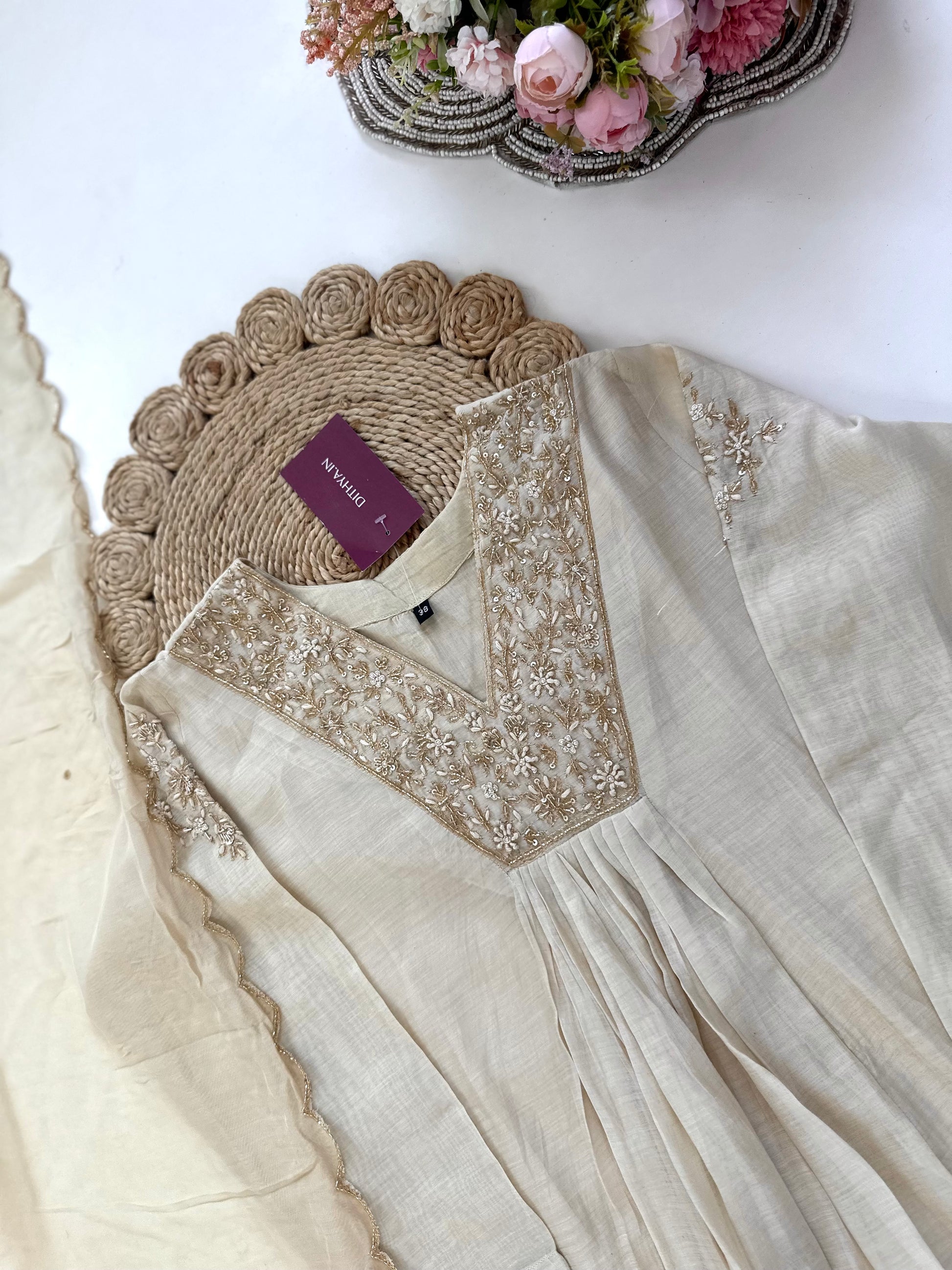 Expertly crafted with handwork using Mul Chanderi fabric, this Aline Kurti comes with matching pants and dupatta in 3 stunning colours. Elevate your style with this unique and elegant ensemble. Perfect for any occasion, this versatile set offers both comfort and sophistication.